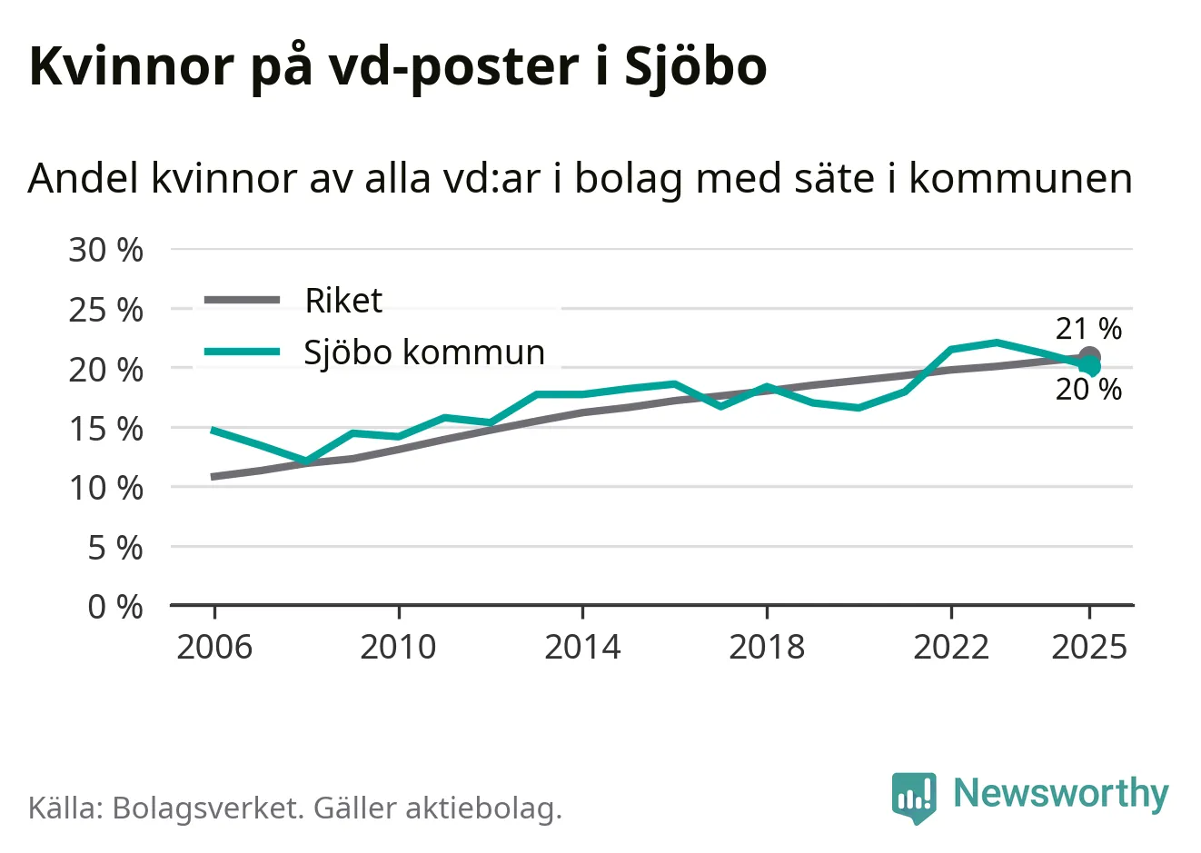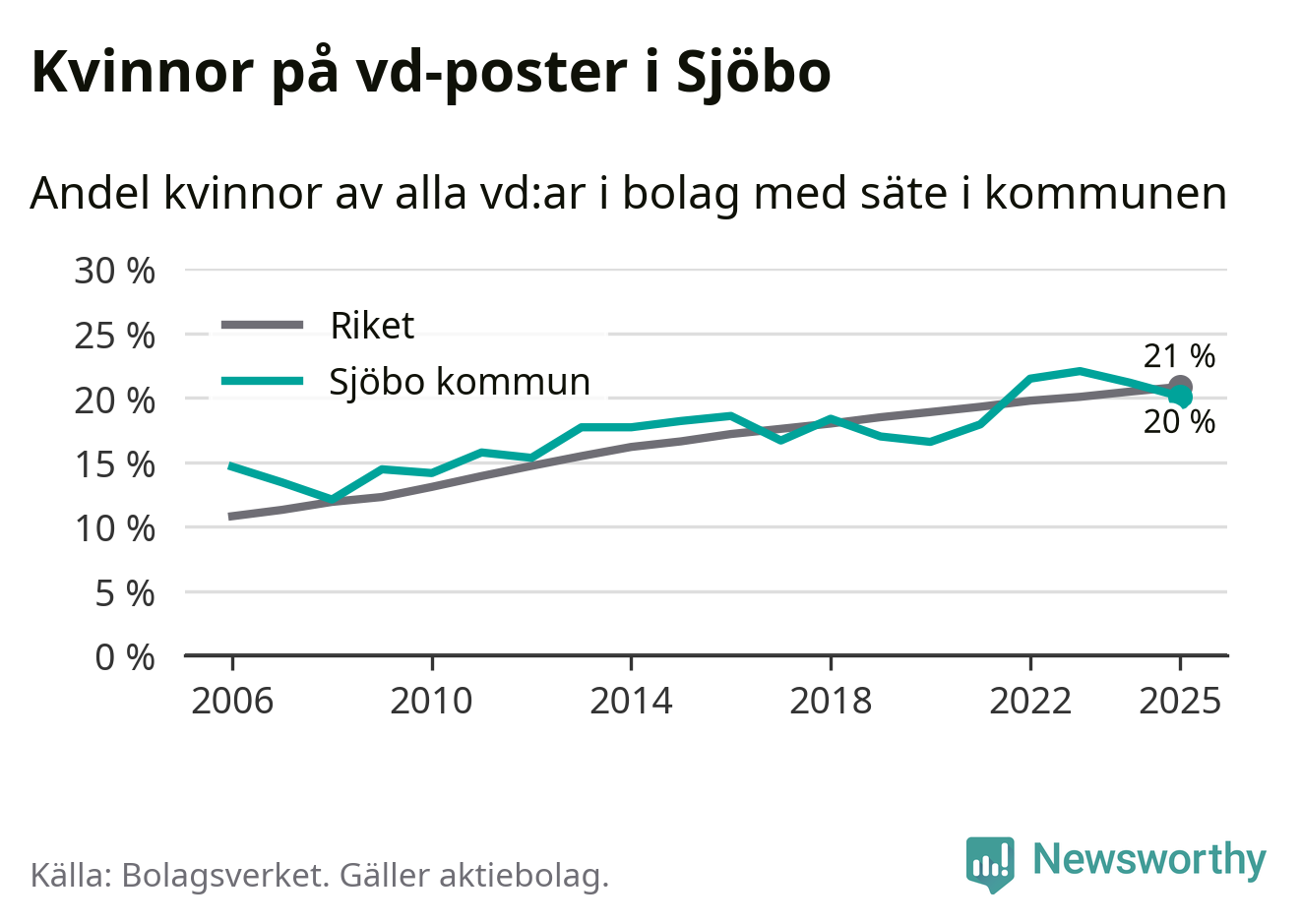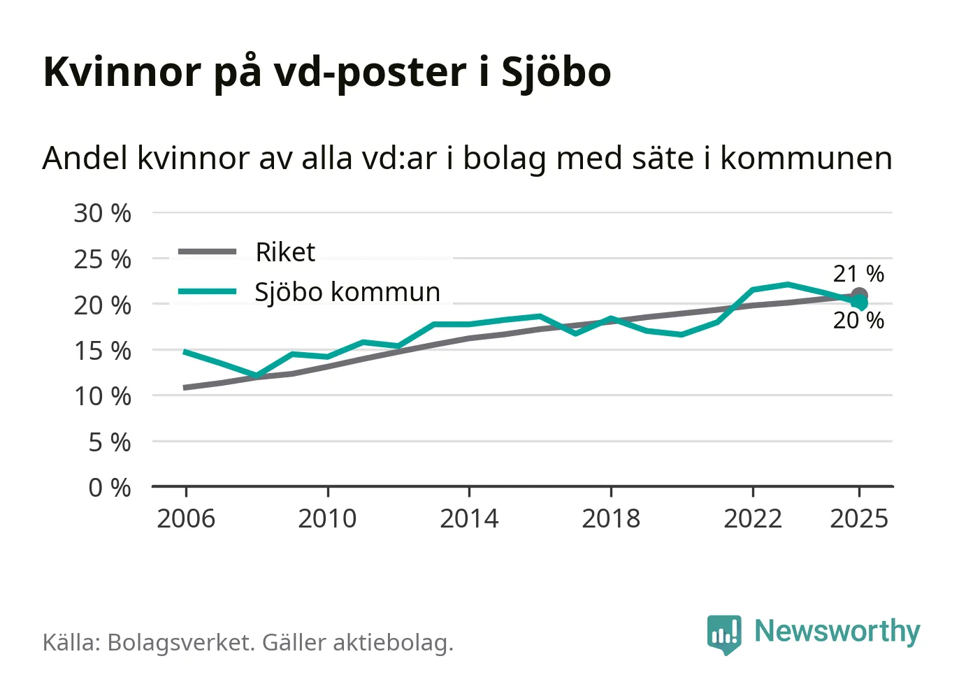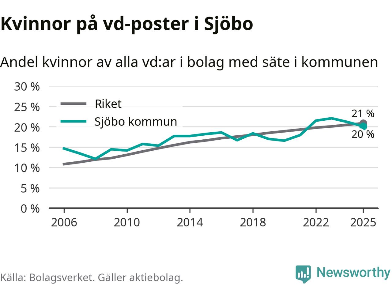Det är fortfarande män som är vd i nästan fyra av fem bolag i Sverige och könsfördelningen alltså ser ungefär likadan ut i Sjöbo. Högst andel kvinnliga vd:ar i Skåne har företagen med säte i Tomelilla kommun, 30 procent. Lägst är andelen bland företagen med säte i Perstorps kommun, 13 procent. I Perstorp rör det sig om 62 företag totalt och även små förändringar får stora utslag i andelen kvinnliga vd:ar.