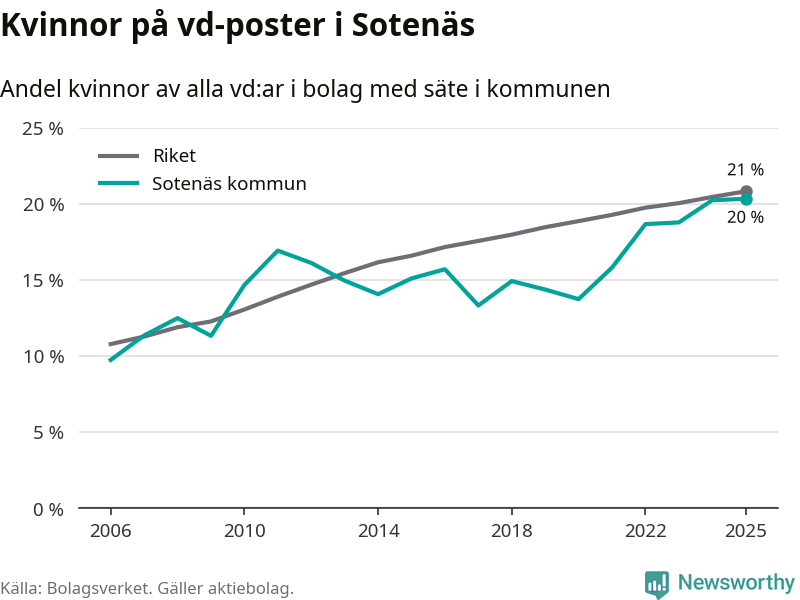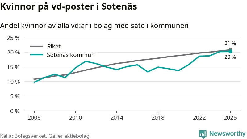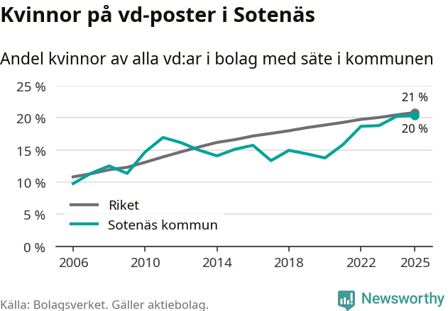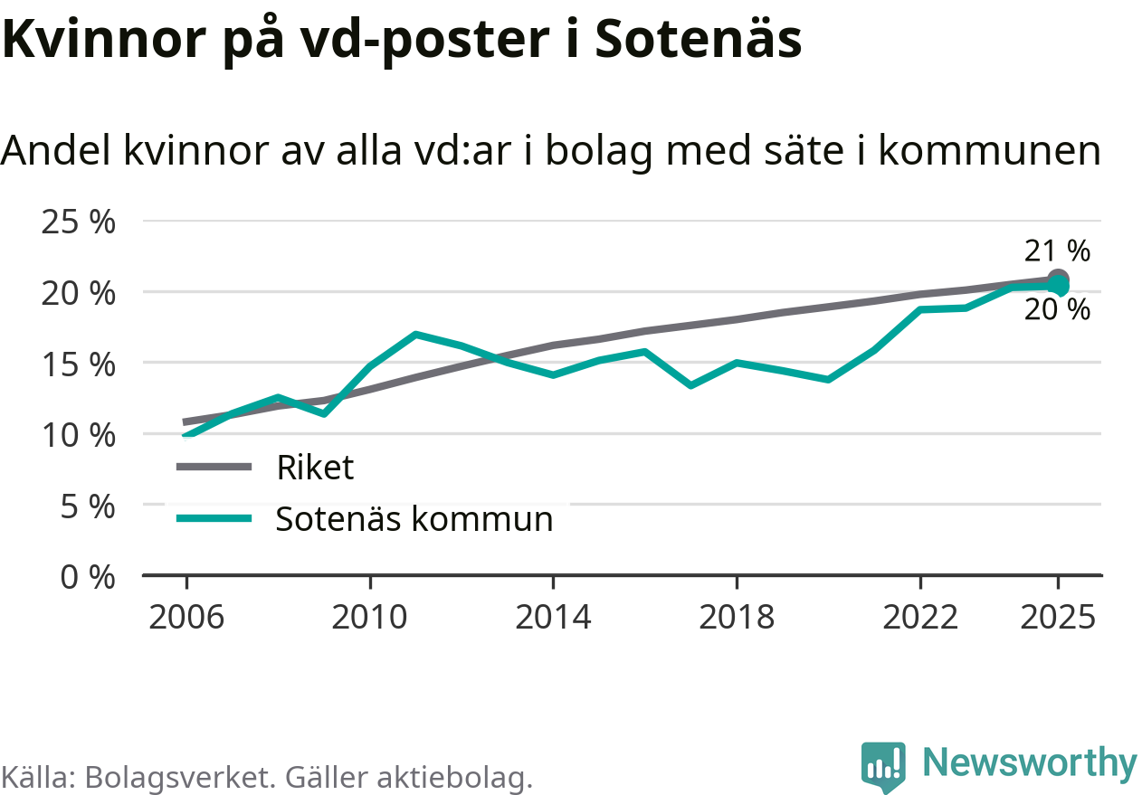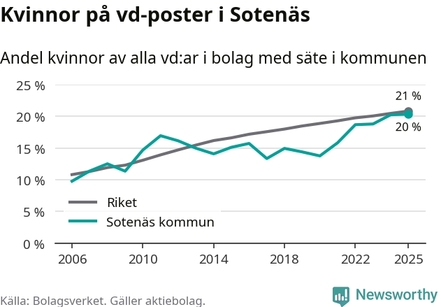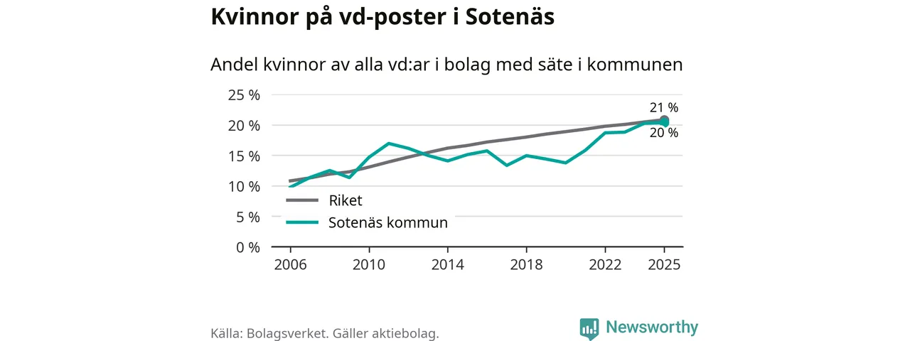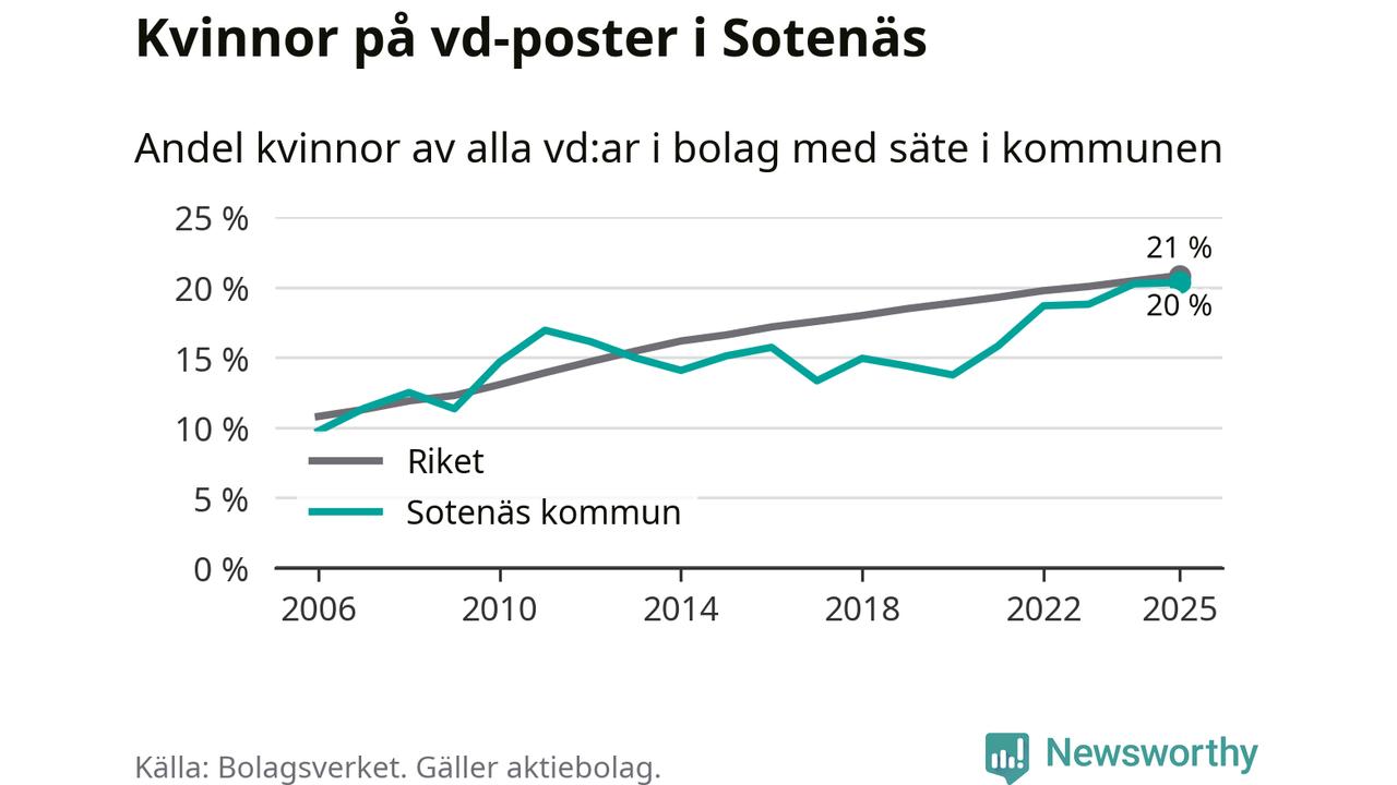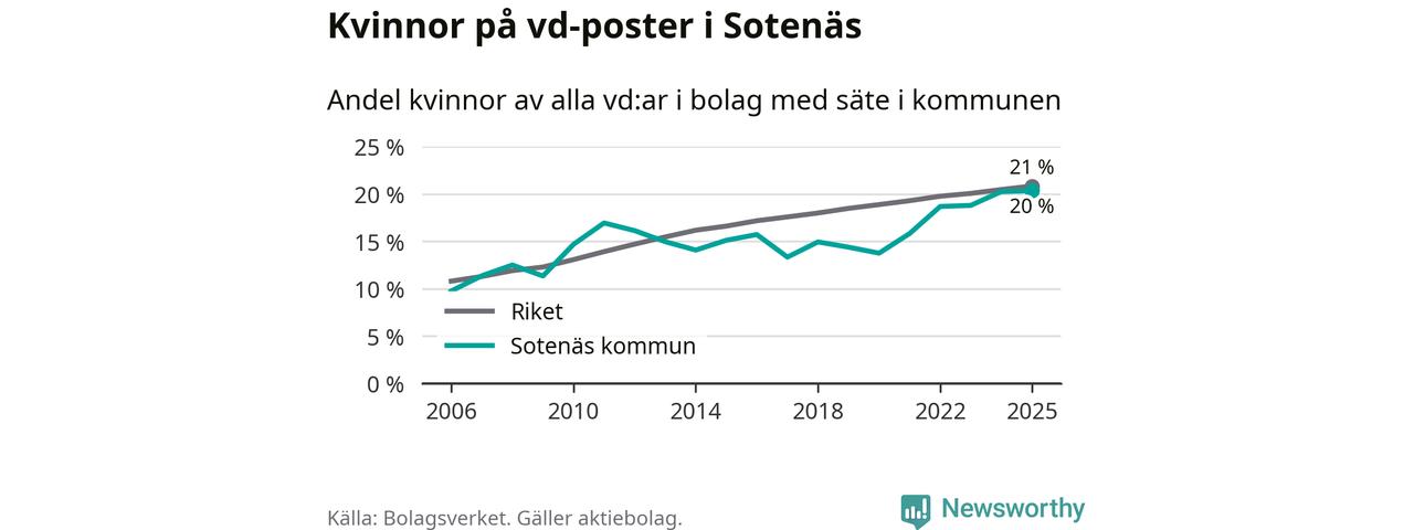 Det är fortfarande män som är vd i nästan fyra av fem bolag i Sverige och könsfördelningen alltså ser ungefär likadan ut i Sotenäs. Högst andel kvinnliga vd:ar i Västra Götaland har företagen med säte i Dals-Eds kommun, 31 procent. Där rör det sig dock om relativt få företag – 45 stycken totalt – och även små förändringar får stora utslag i andelen kvinnliga vd:ar. Lägst är andelen bland företagen med säte i Munkedals kommun, 9 procent.