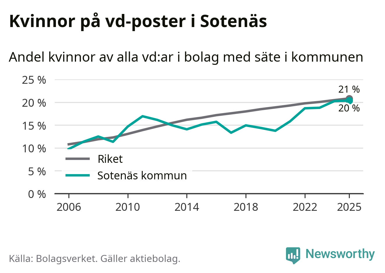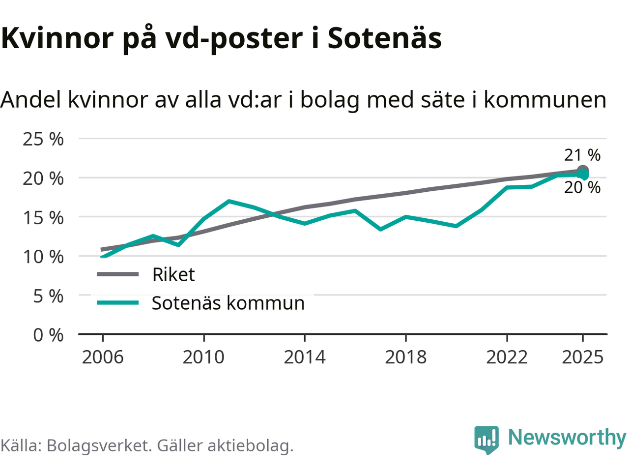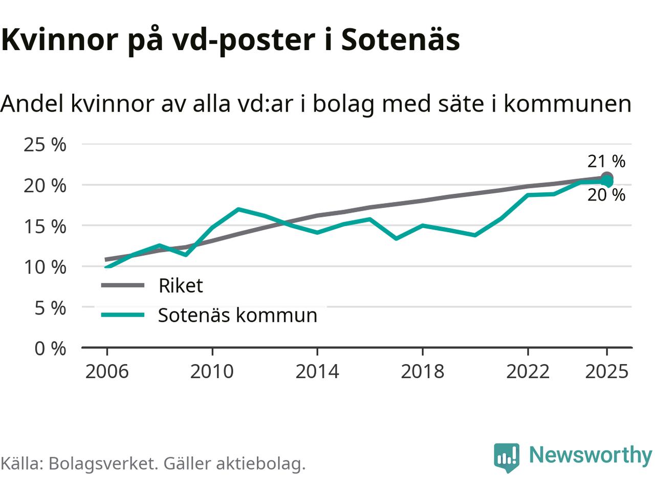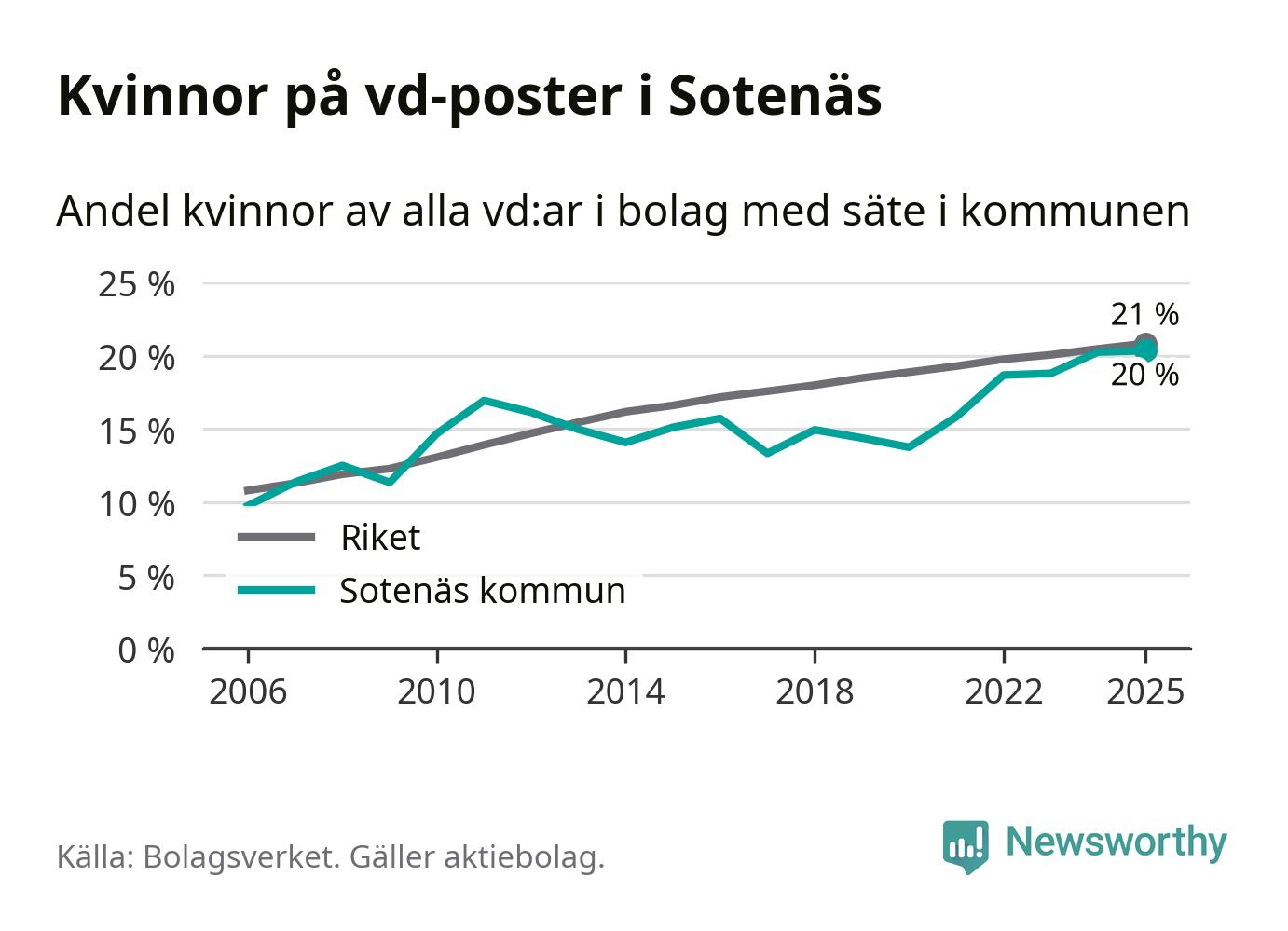 Det är fortfarande män som är vd i nästan fyra av fem bolag i Sverige och könsfördelningen alltså ser ungefär likadan ut i Sotenäs. Högst andel kvinnliga vd:ar i Västra Götaland har företagen med säte i Dals-Eds kommun, 31 procent. Där rör det sig dock om relativt få företag – 45 stycken totalt – och även små förändringar får stora utslag i andelen kvinnliga vd:ar. Lägst är andelen bland företagen med säte i Munkedals kommun, 9 procent.