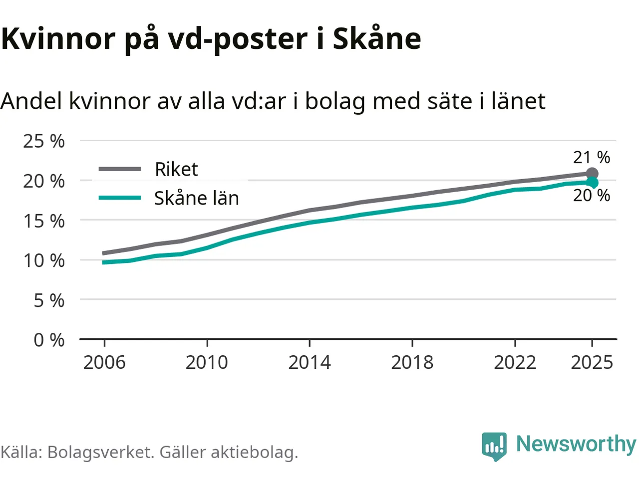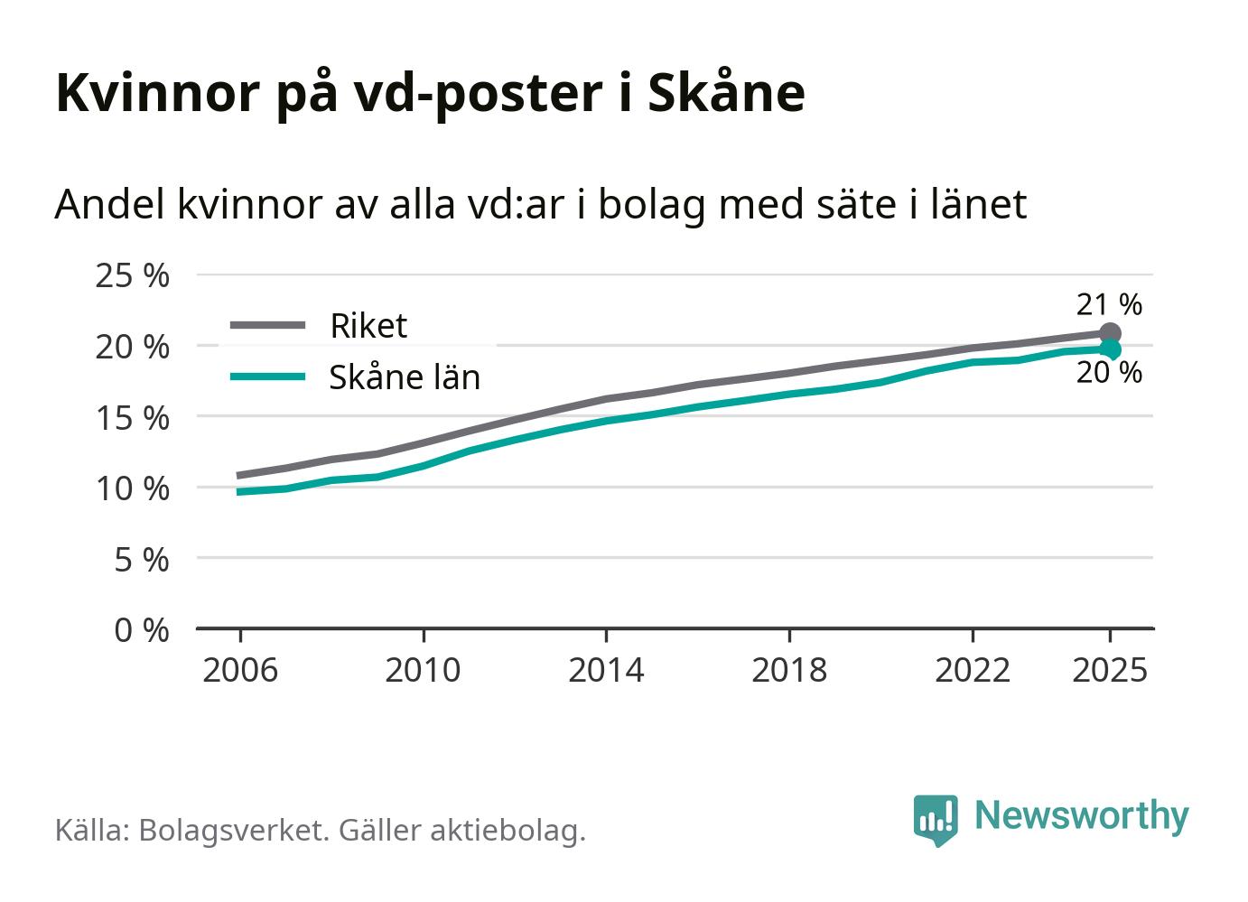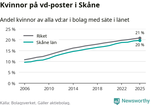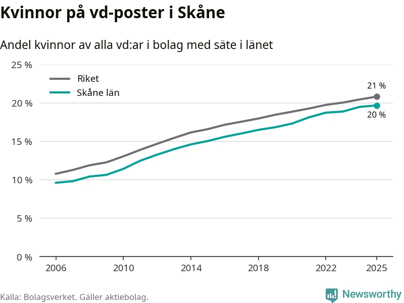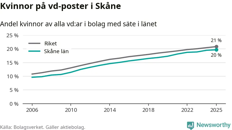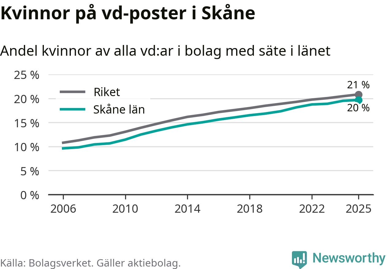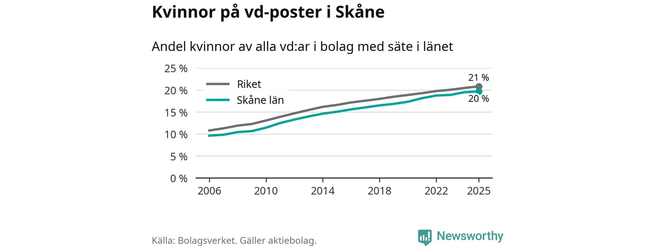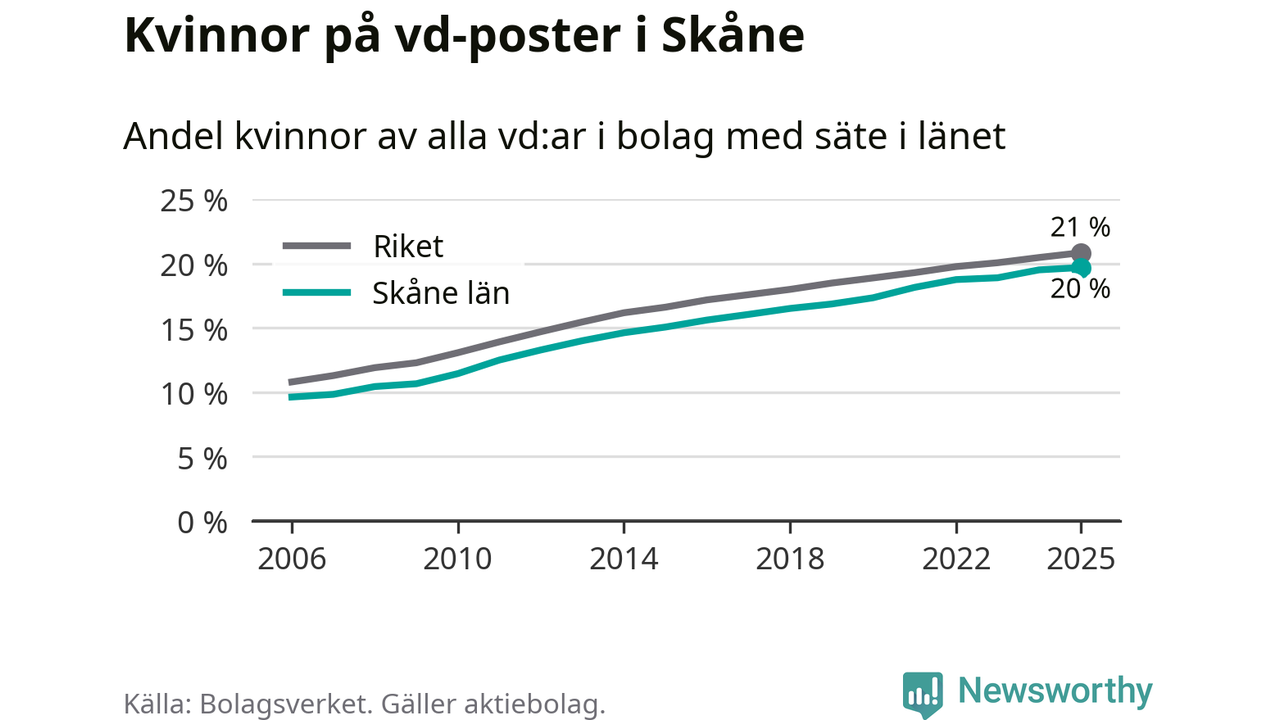 20 procent av aktiebolagen med registrerad vd i Skåne hade en kvinna på posten vid årsskiftet. Det innebär att på varje kvinnlig vd går fyra män.