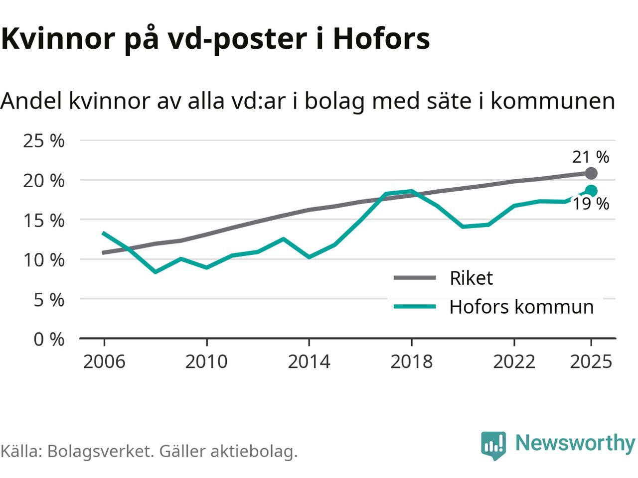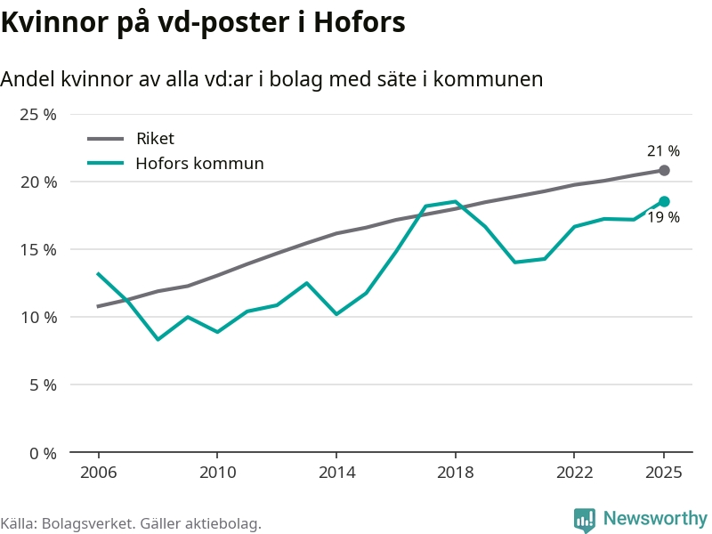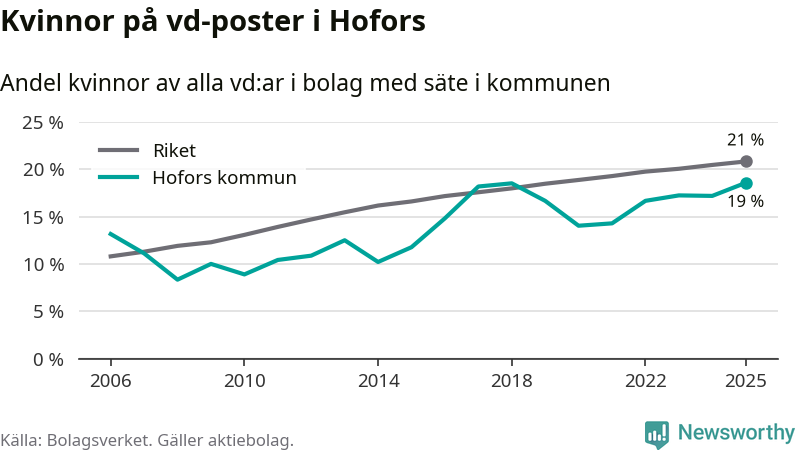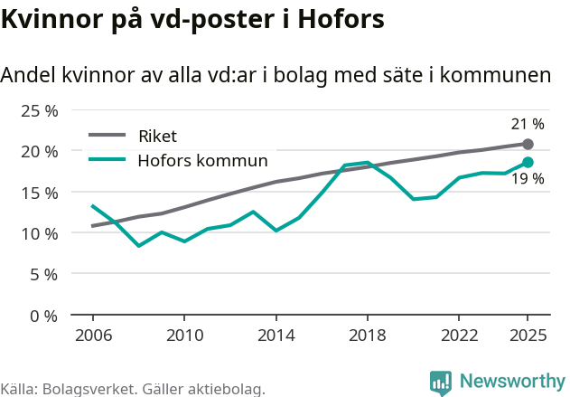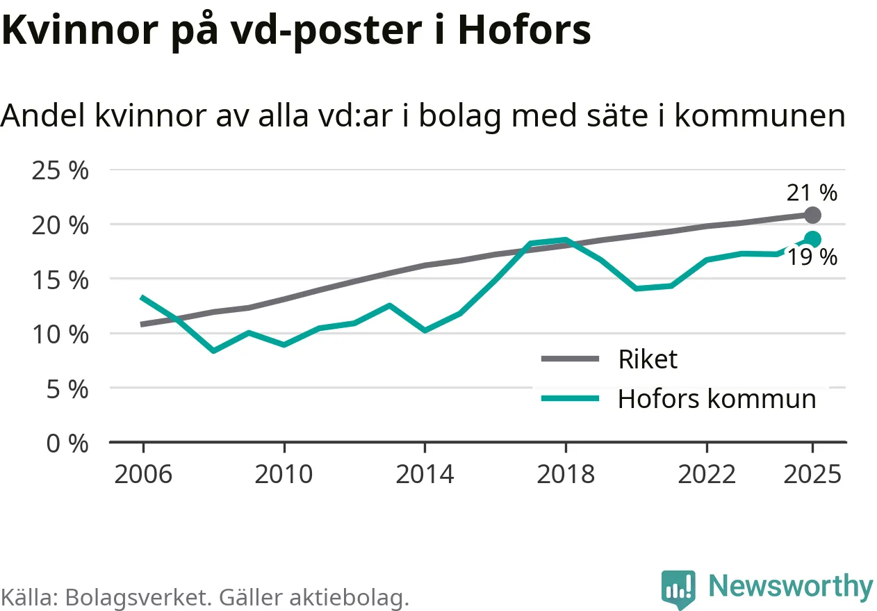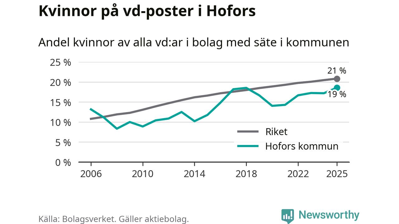 Det är fortfarande män som är vd i nästan fyra av fem bolag i Sverige och i Hofors är det alltså en något lägre andel kvinnor på vd-posten. Högst andel kvinnliga vd:ar i Gävleborg har företagen med säte i Ljusdals kommun, 22 procent. Lägst är andelen bland företagen med säte i Bollnäs kommun, 15 procent.
