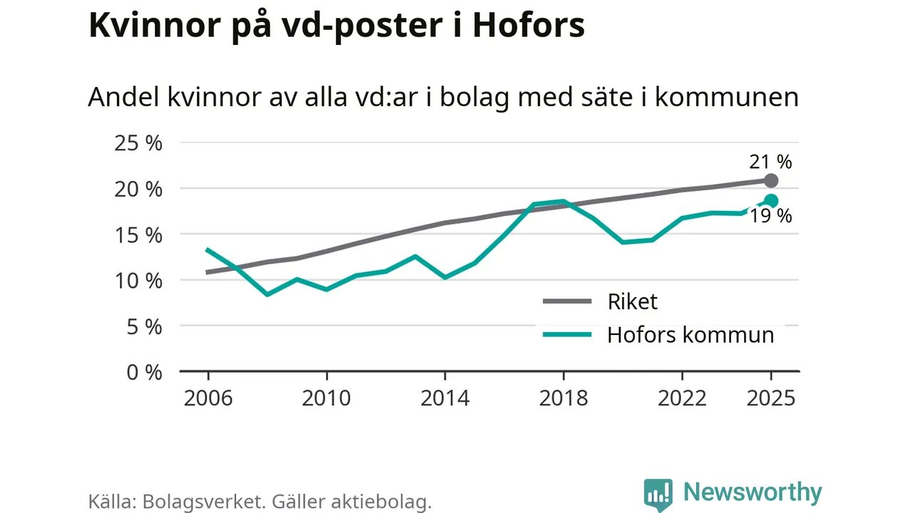 19 procent av aktiebolagen med registrerad vd i Hofors hade en kvinna på posten vid årsskiftet. Det innebär att på varje kvinnlig vd går fyra män.