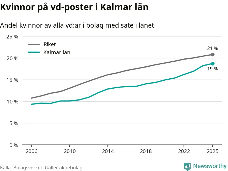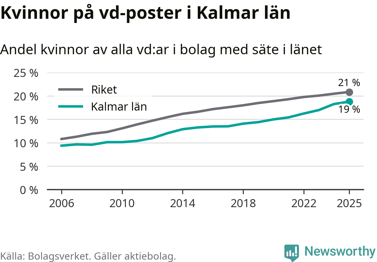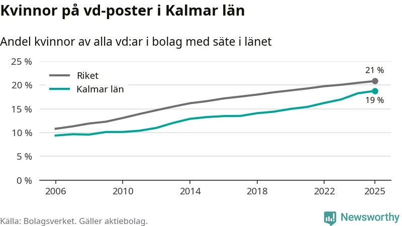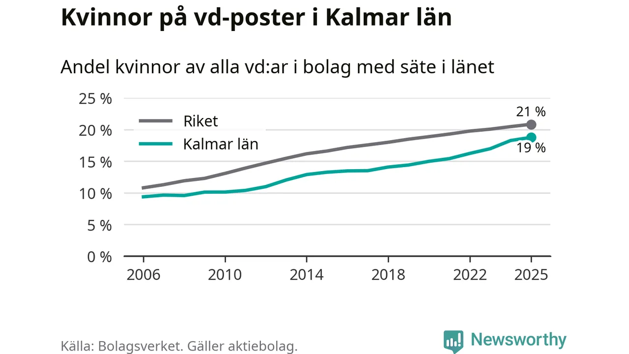 Bara var femte svenskt aktiebolag leds av en kvinna. I Kalmar län är andelen ännu lägre. Det visar siffror från Bolagsverket.