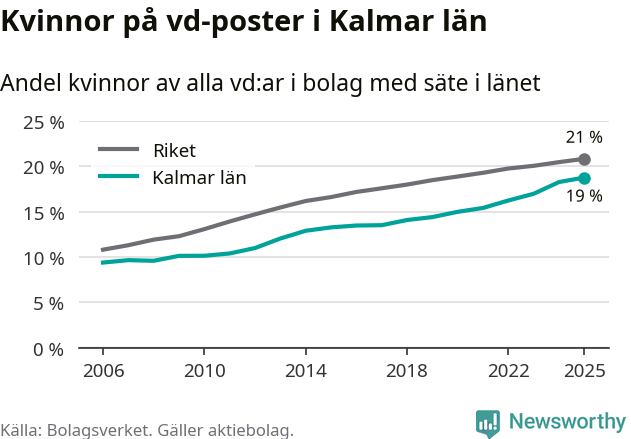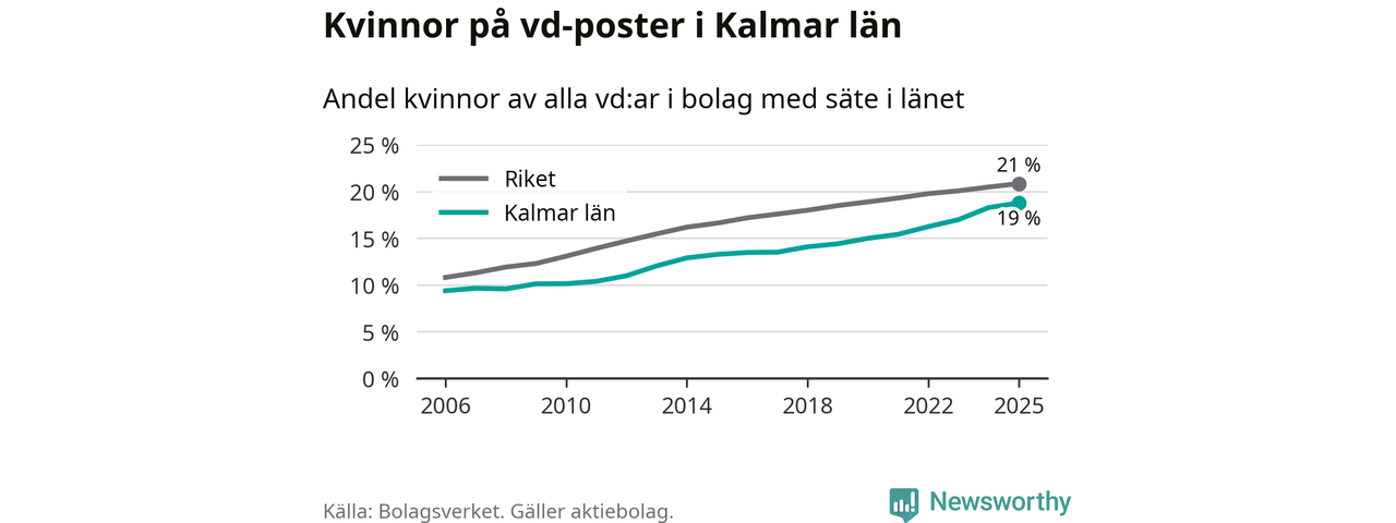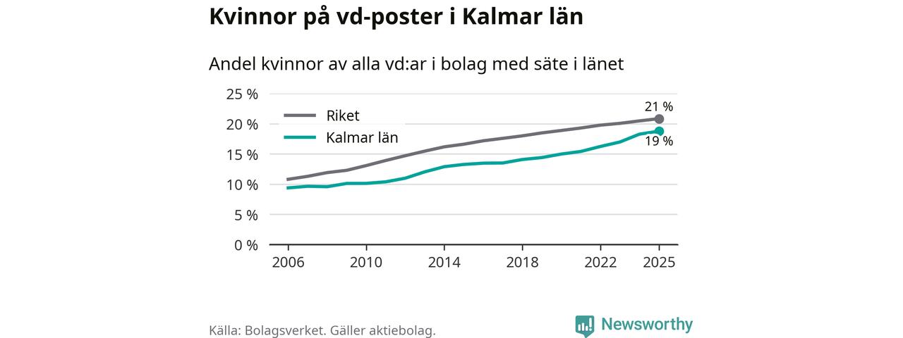 Delar man upp vd:arna i Kalmar län efter ålder är andelen kvinnor högre bland dem under 50 år. Där är 22 procent kvinnor, jämfört med 17 procent i den äldre gruppen. I riket som helhet är 22 procent av vd:arna som är under 50 år kvinnor, medan motsvarande siffra för direktörerna som är äldre är 20 procent.