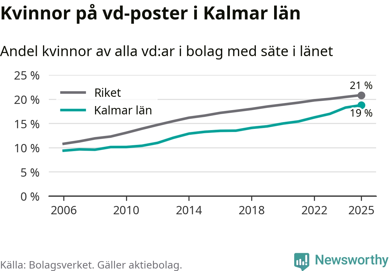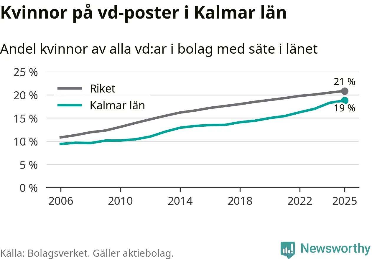 19 procent av aktiebolagen med registrerad vd i Kalmar län hade en kvinna på posten vid årsskiftet. Det innebär att på varje kvinnlig vd går fyra män.