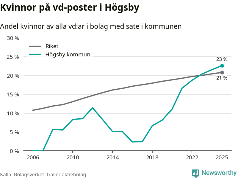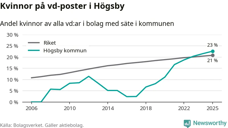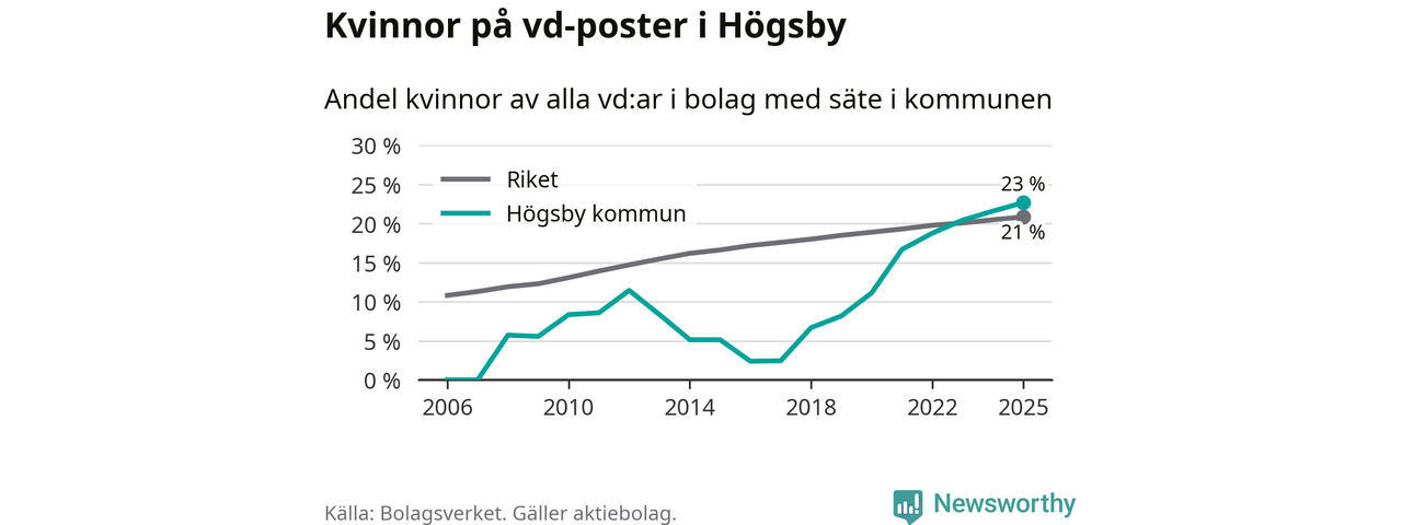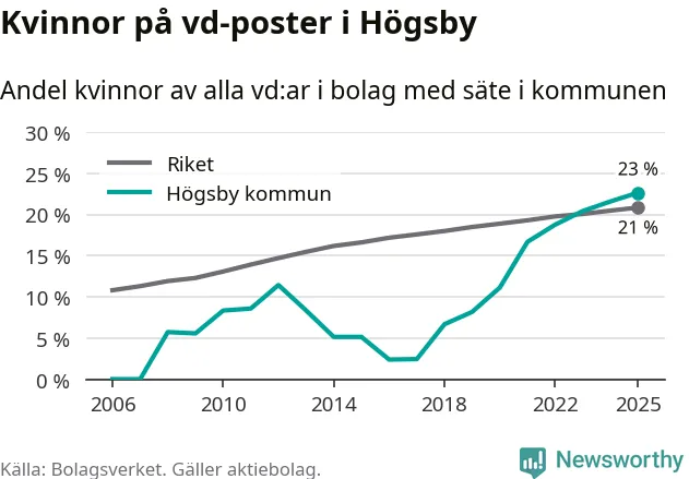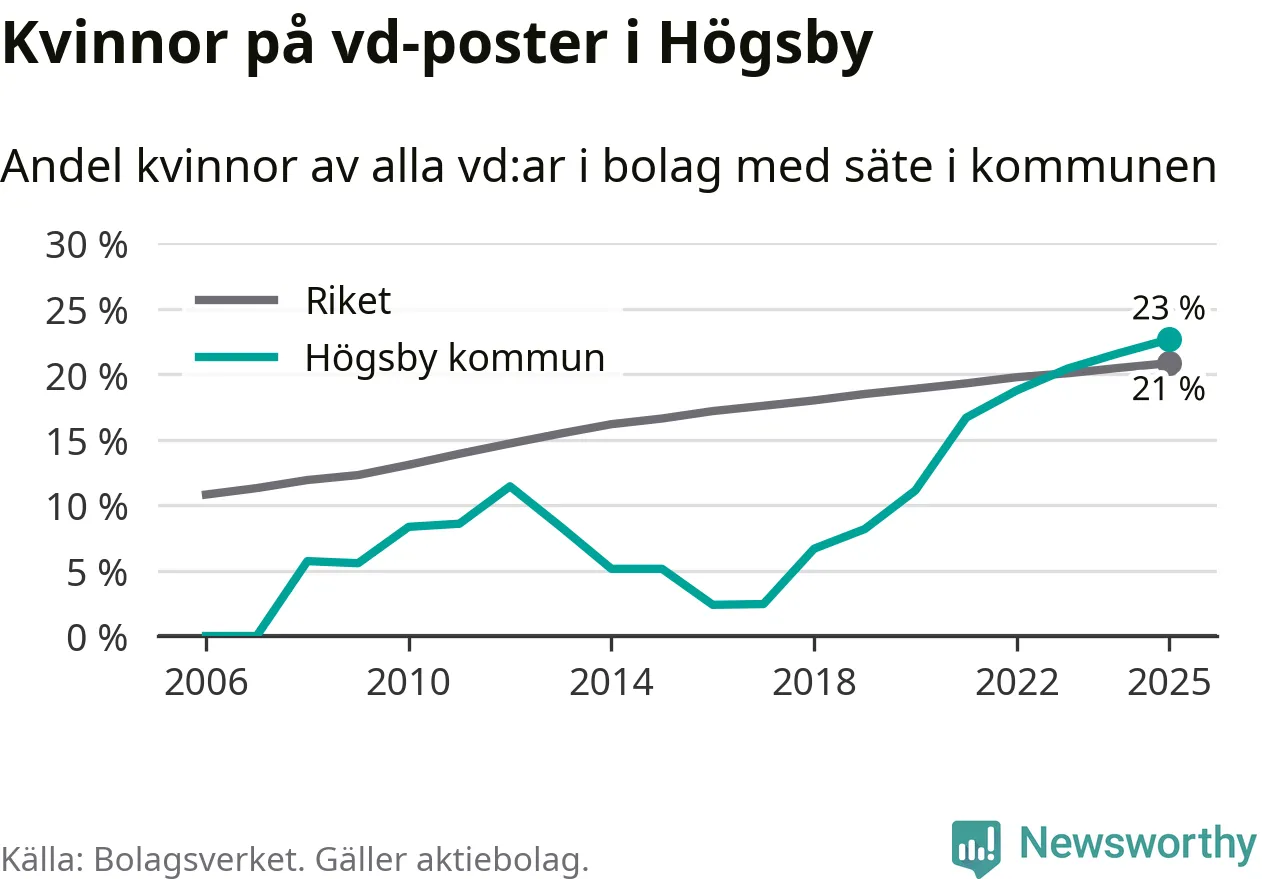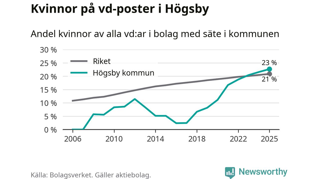 23 procent av aktiebolagen med registrerad vd i Högsby hade en kvinna på posten vid årsskiftet. Det innebär att på varje kvinnlig vd går tre män.