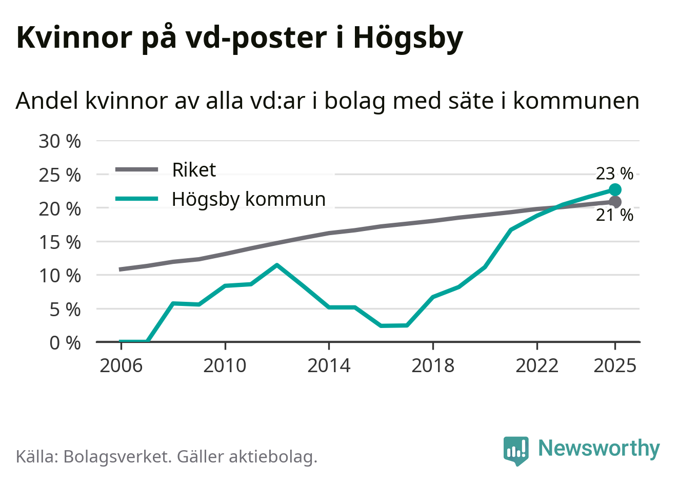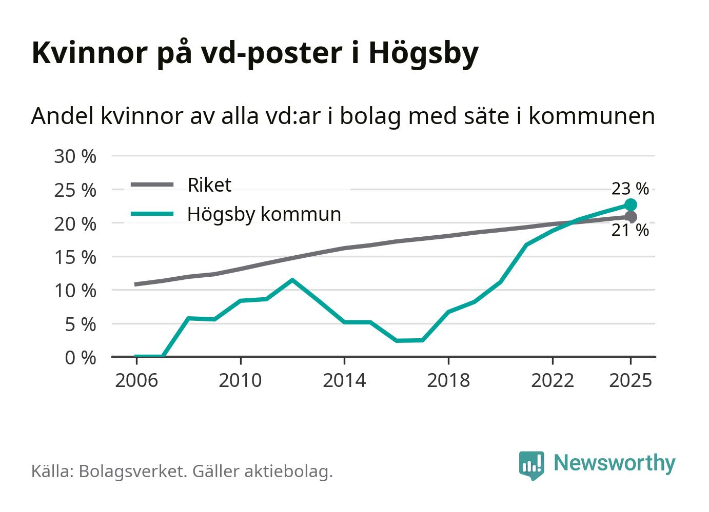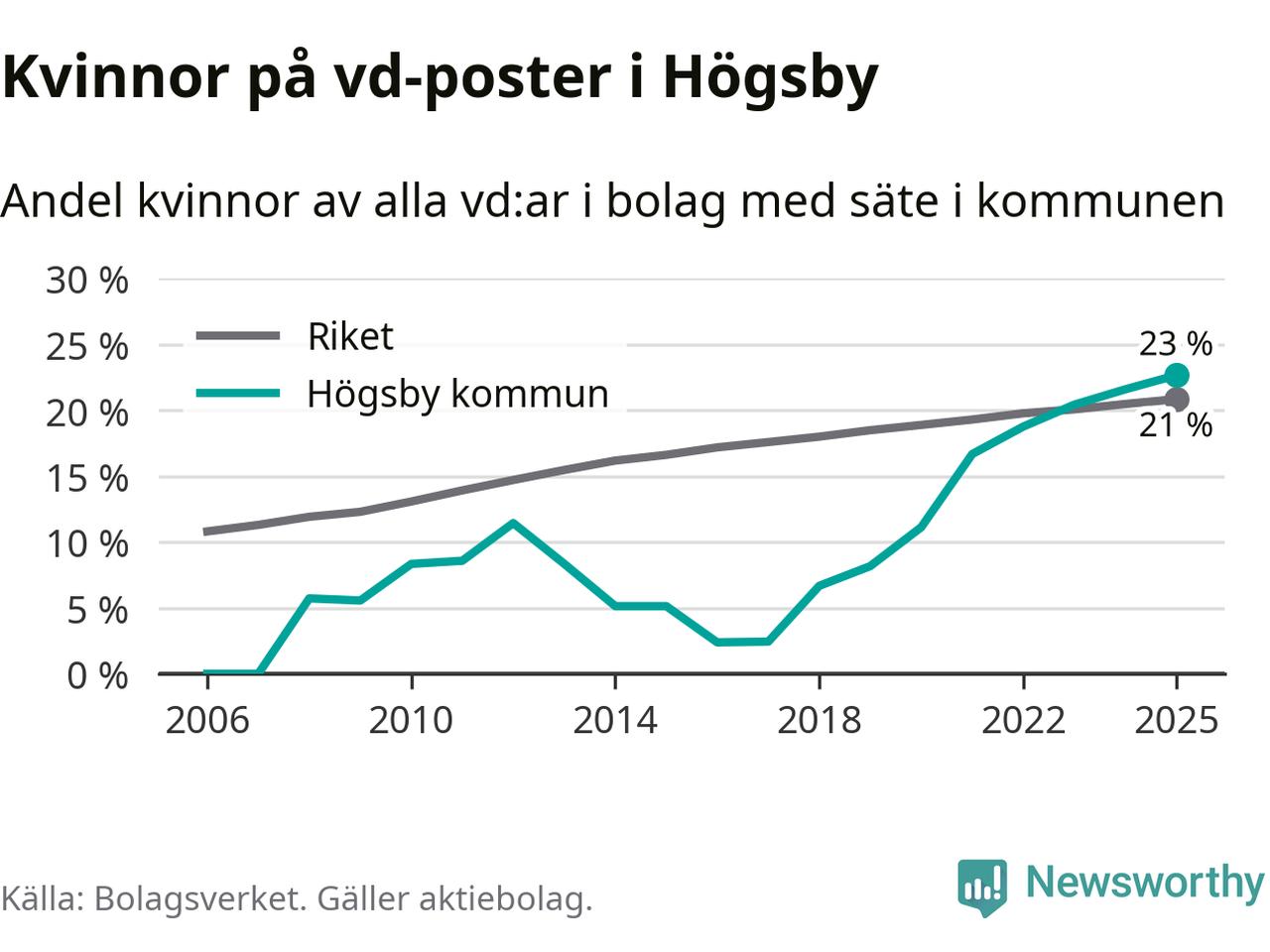 23 procent av aktiebolagen med registrerad vd i Högsby hade en kvinna på posten vid årsskiftet. Det innebär att på varje kvinnlig vd går tre män.