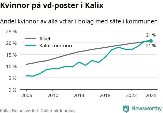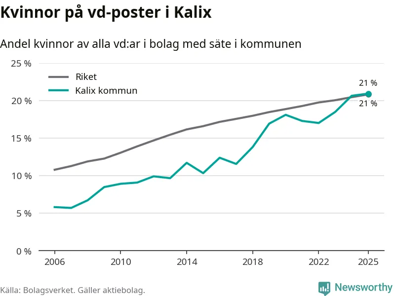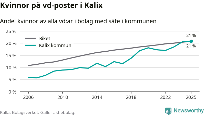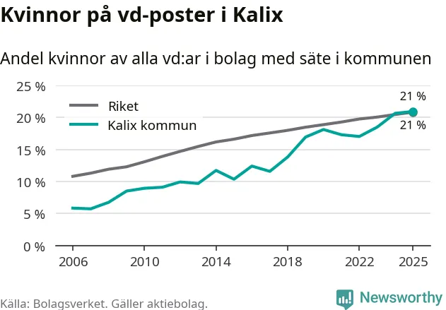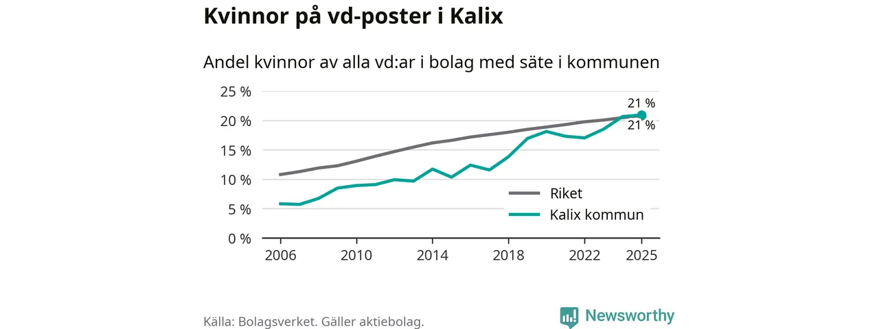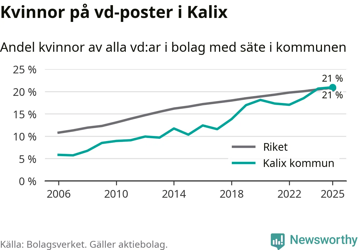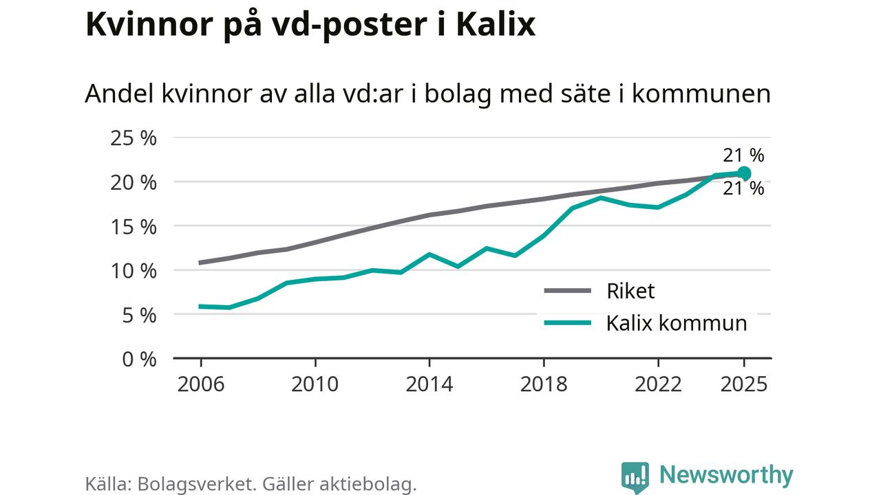 Det är fortfarande män som är vd i nästan fyra av fem bolag i Sverige och könsfördelningen alltså ser ungefär likadan ut i Kalix. Högst andel kvinnliga vd:ar i Norrbotten har företagen med säte i Bodens kommun, 25 procent. Lägst är andelen bland företagen med säte i Övertorneå kommun, 6 procent. I Övertorneå rör det sig om 63 företag totalt och även små förändringar får stora utslag i andelen kvinnliga vd:ar.