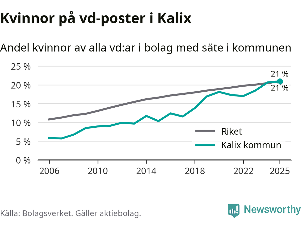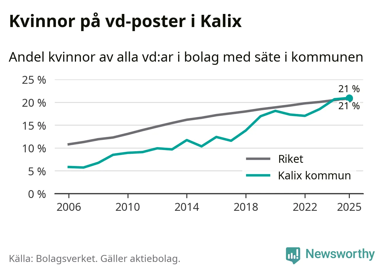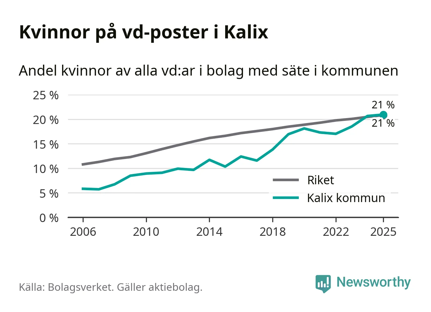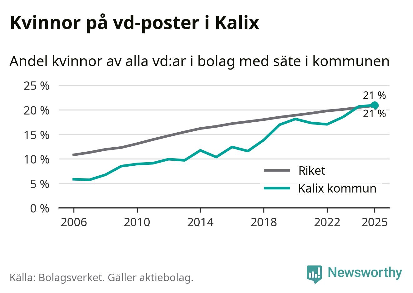 Det är fortfarande män som är vd i nästan fyra av fem bolag i Sverige och könsfördelningen alltså ser ungefär likadan ut i Kalix. Högst andel kvinnliga vd:ar i Norrbotten har företagen med säte i Bodens kommun, 25 procent. Lägst är andelen bland företagen med säte i Övertorneå kommun, 6 procent. I Övertorneå rör det sig om 63 företag totalt och även små förändringar får stora utslag i andelen kvinnliga vd:ar.