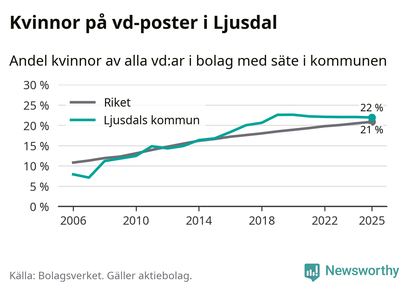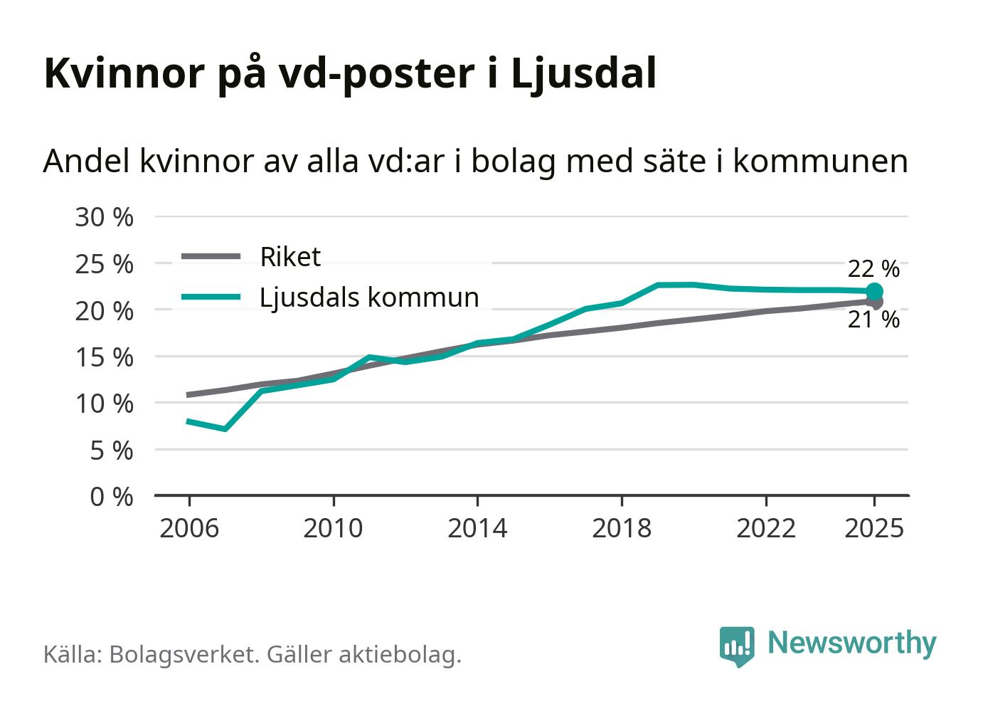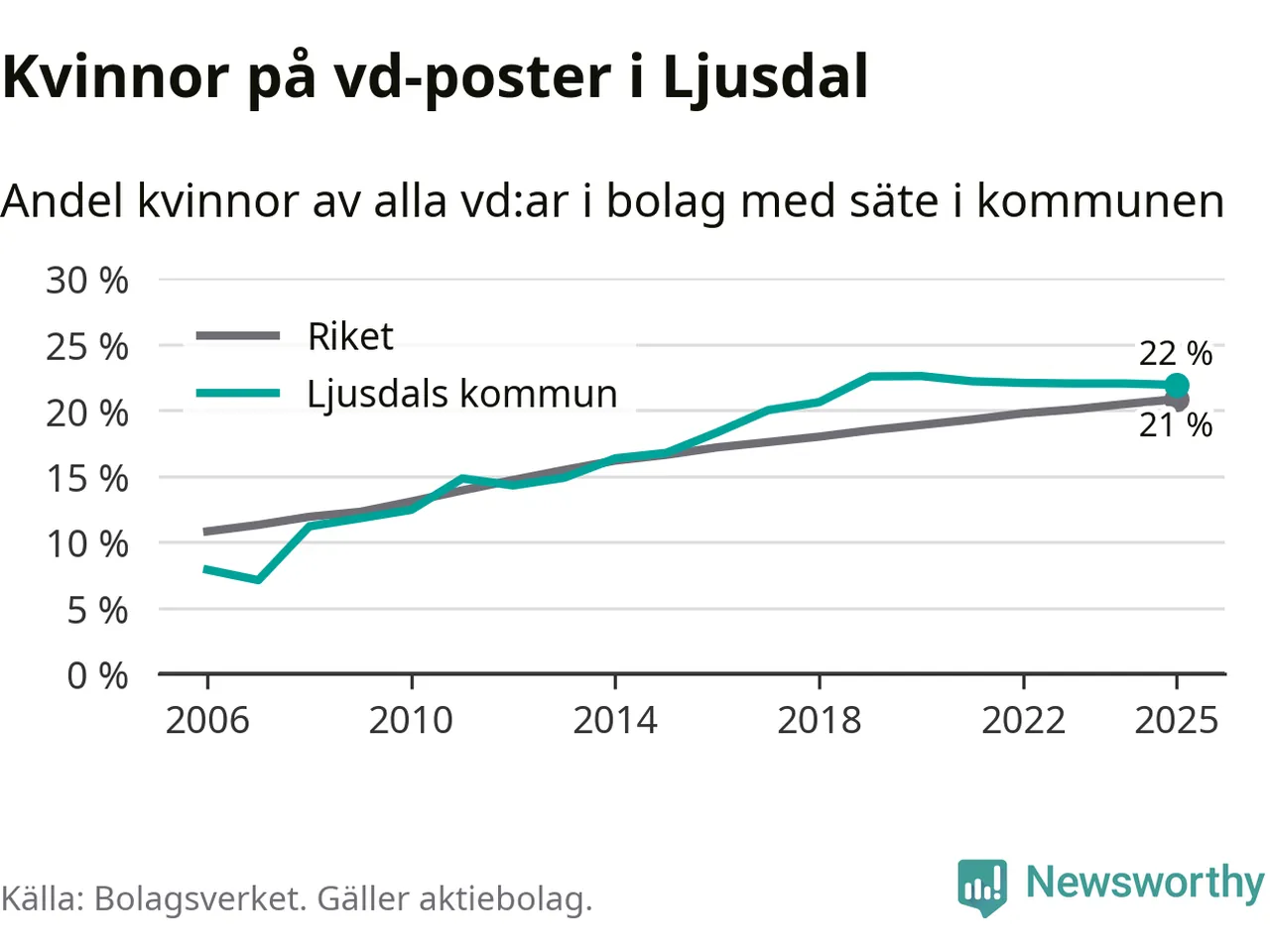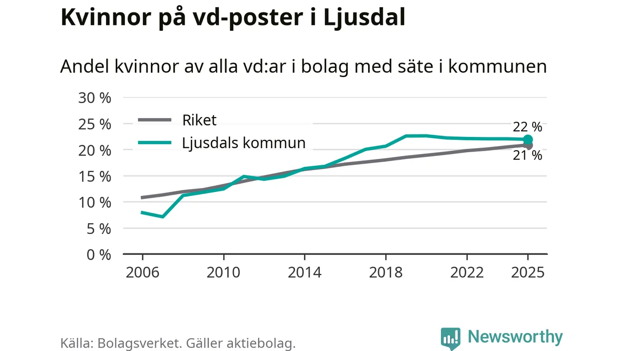 22 procent av aktiebolagen med registrerad vd i Ljusdal hade en kvinna på posten vid årsskiftet. Det innebär att på varje kvinnlig vd går nästan fyra män.
