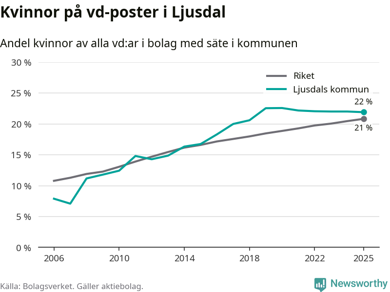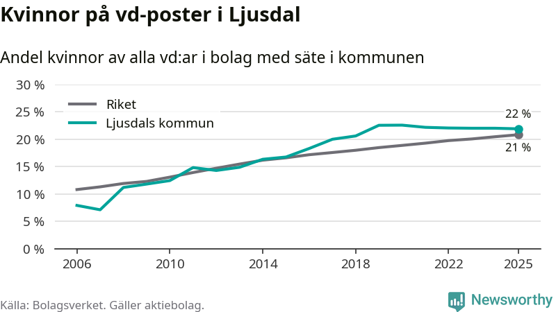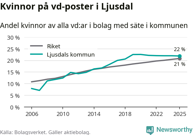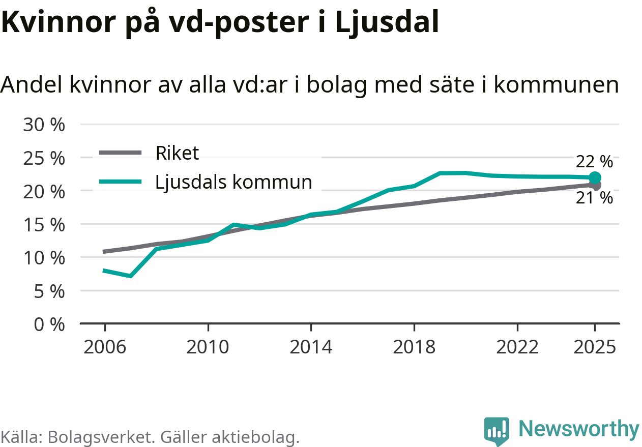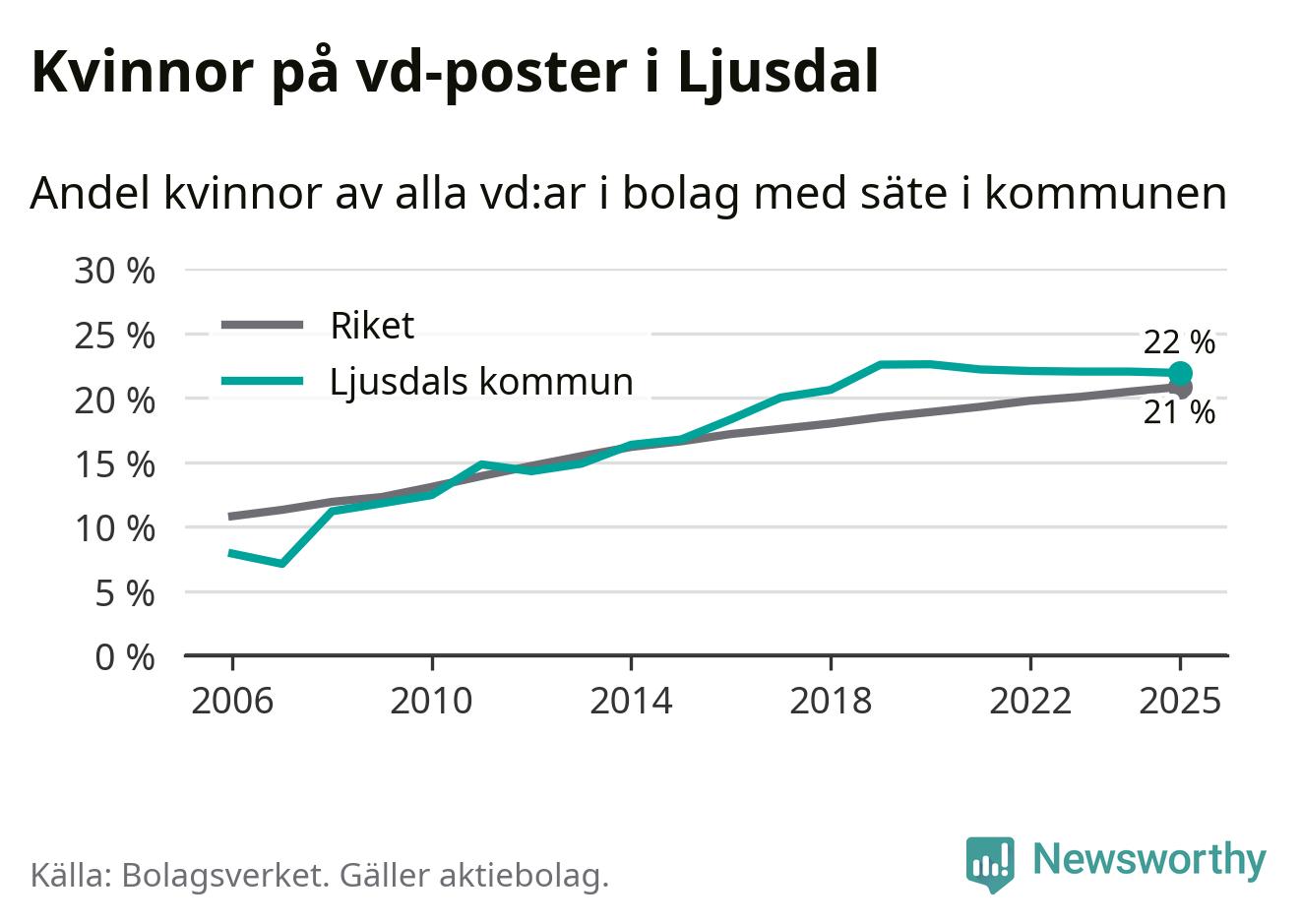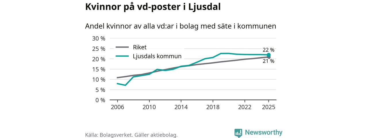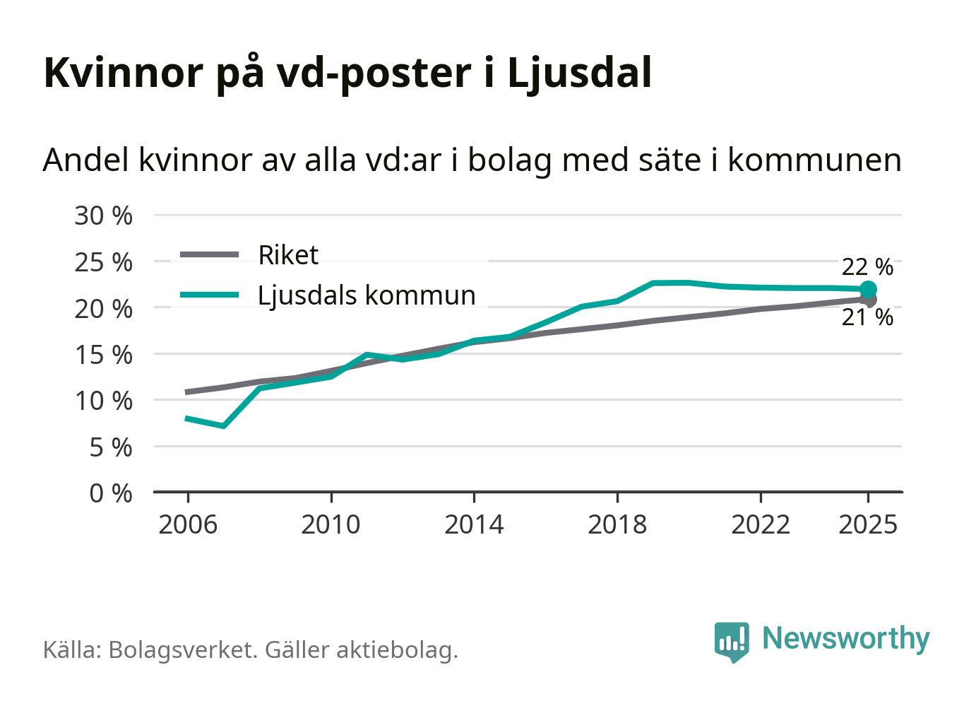 22 procent av aktiebolagen med registrerad vd i Ljusdal hade en kvinna på posten vid årsskiftet. Det innebär att på varje kvinnlig vd går nästan fyra män.
