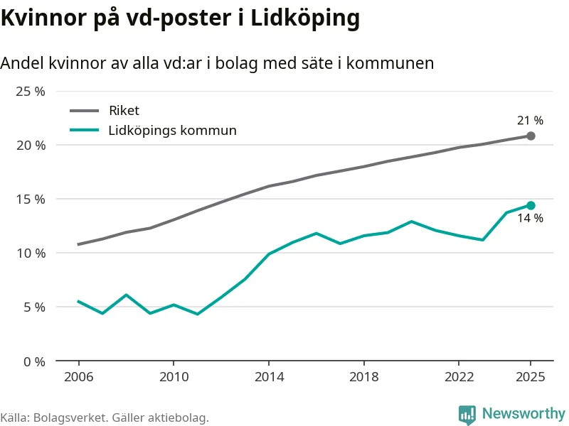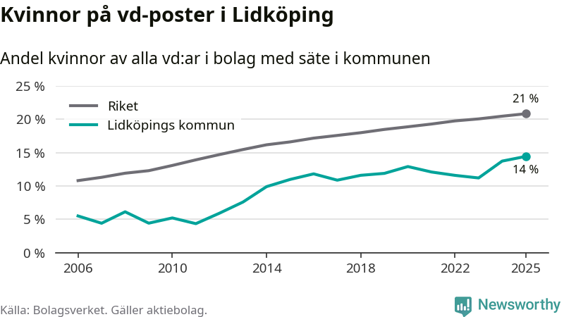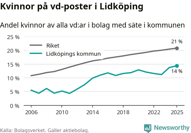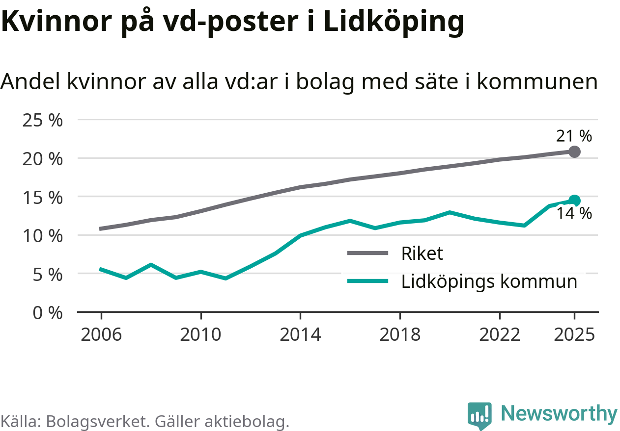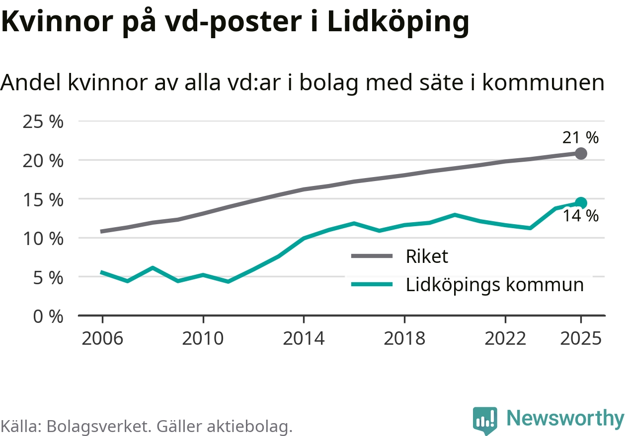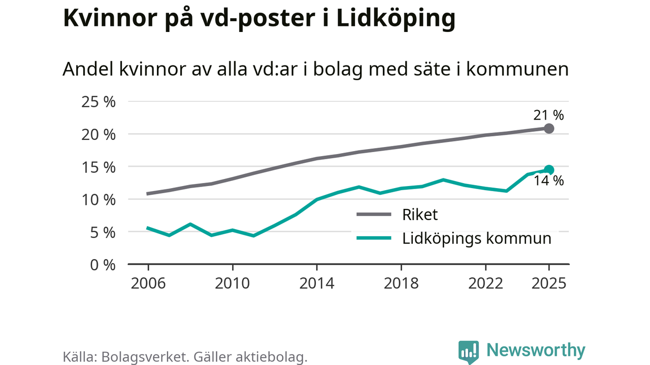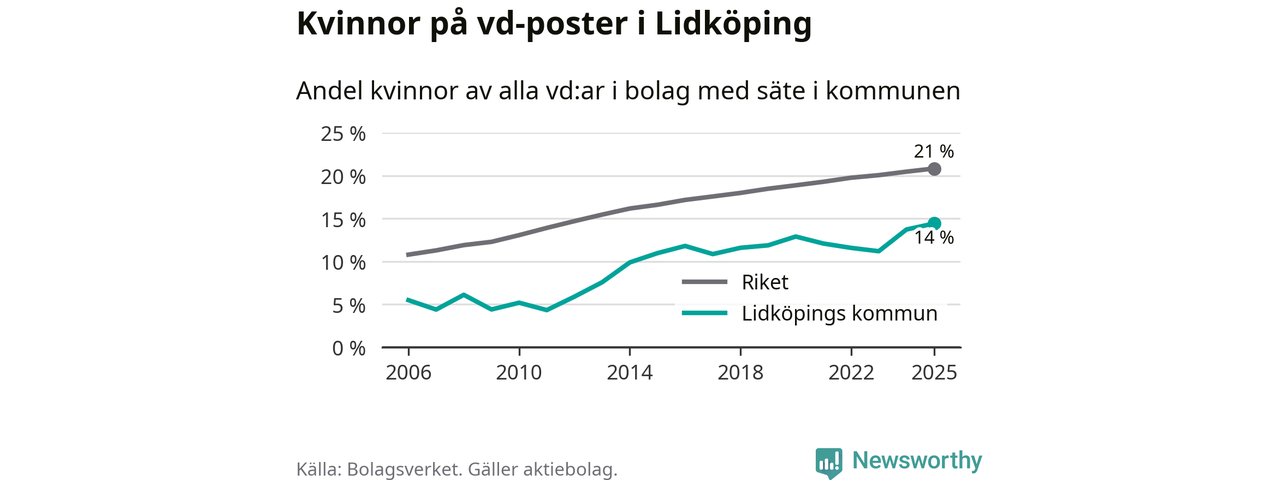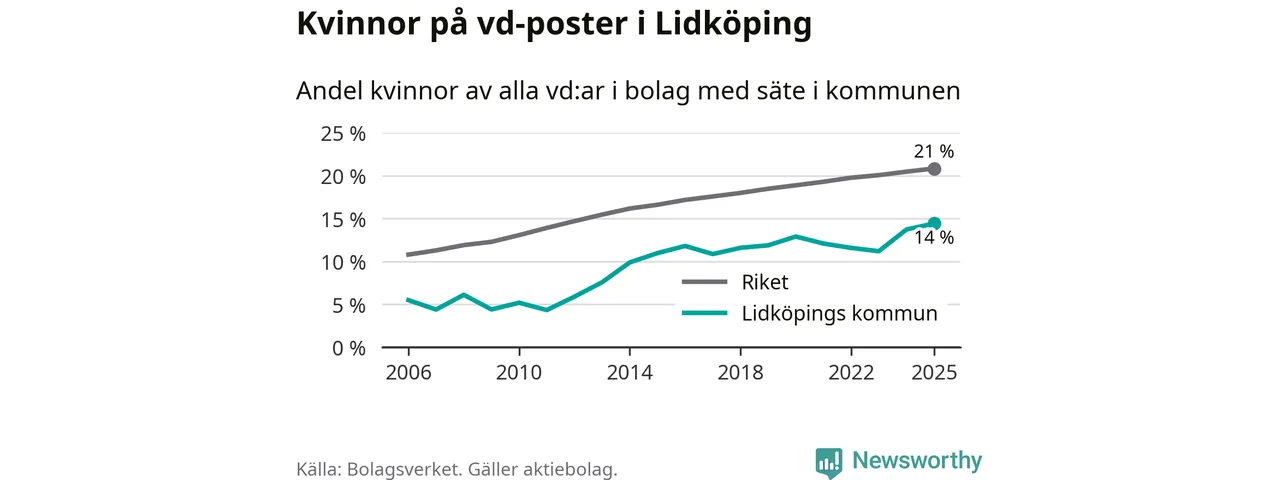 14 procent av aktiebolagen med registrerad vd i Lidköping hade en kvinna på posten vid årsskiftet. Det innebär att på varje kvinnlig vd går sex män.
