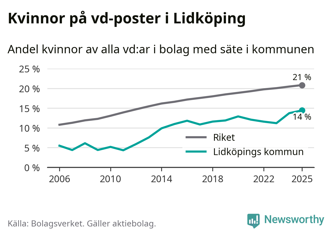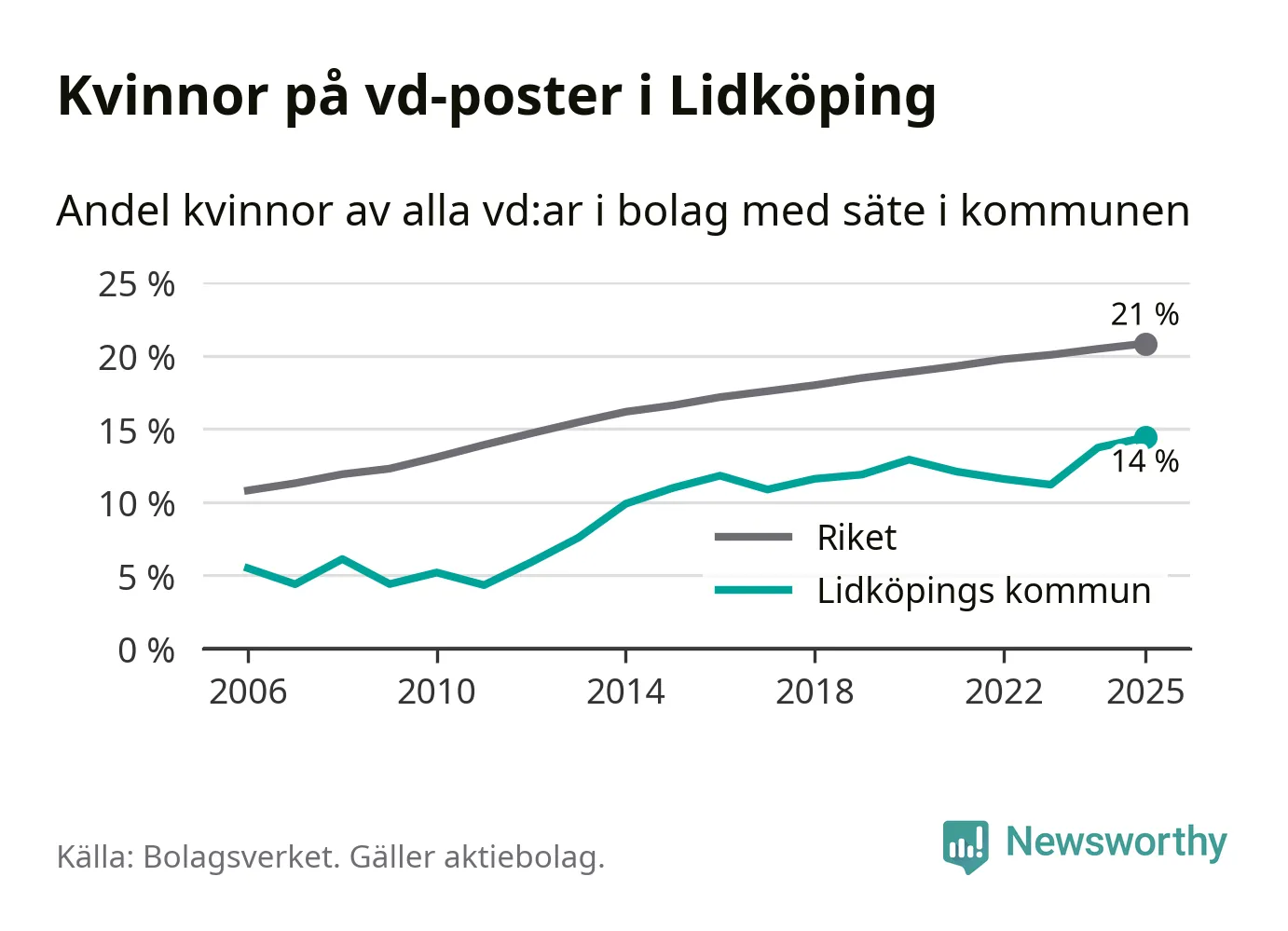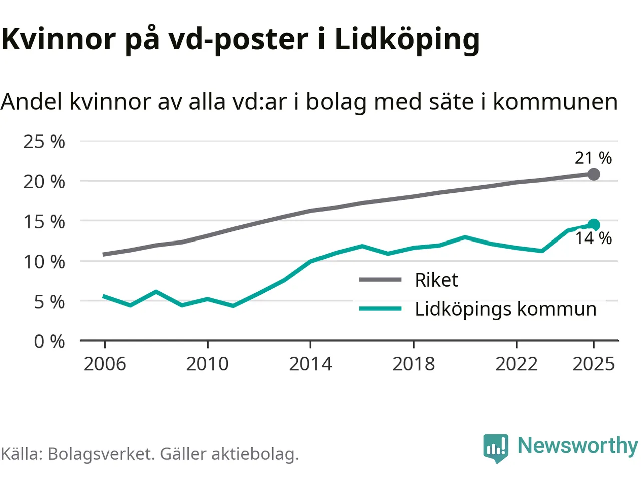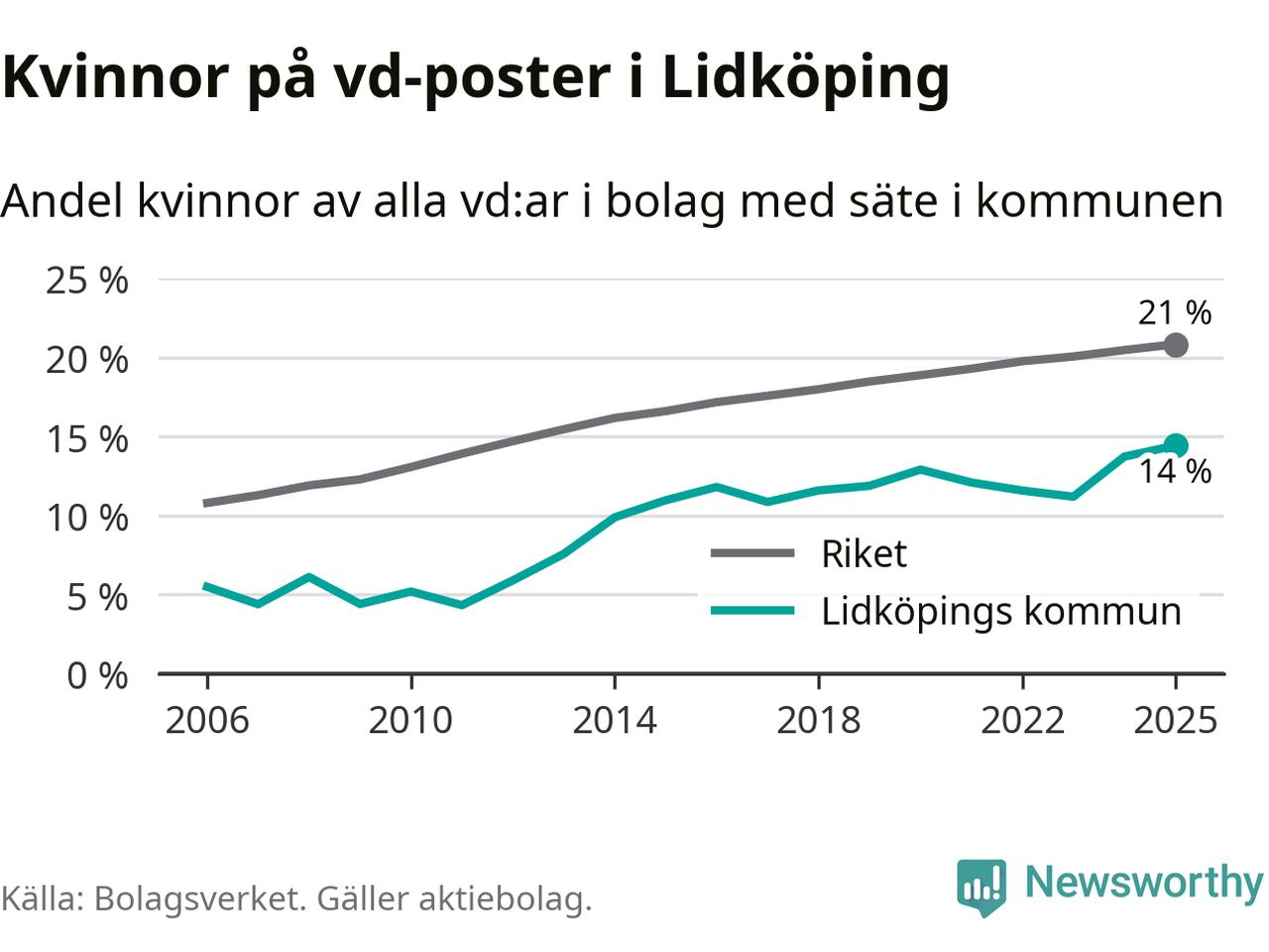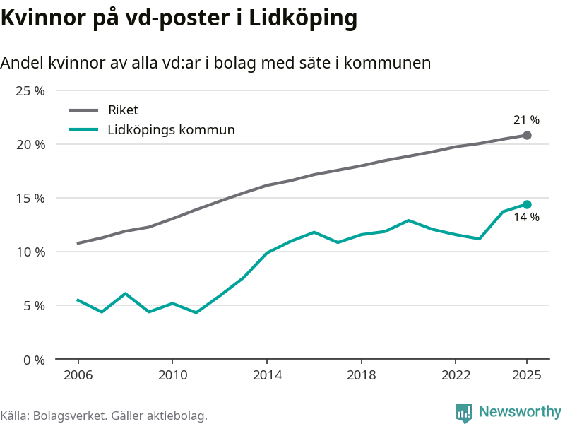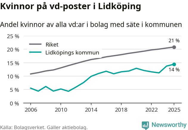 14 procent av aktiebolagen med registrerad vd i Lidköping hade en kvinna på posten vid årsskiftet. Det innebär att på varje kvinnlig vd går sex män.