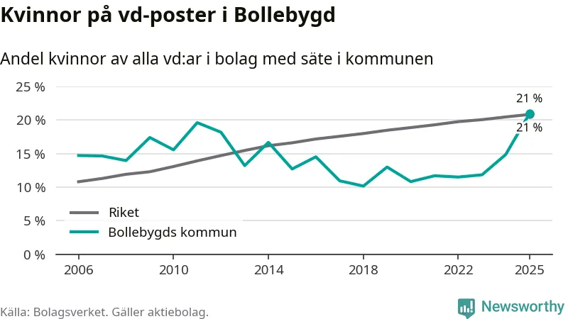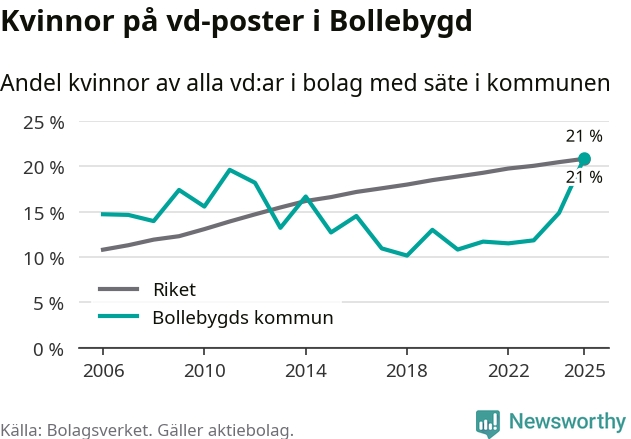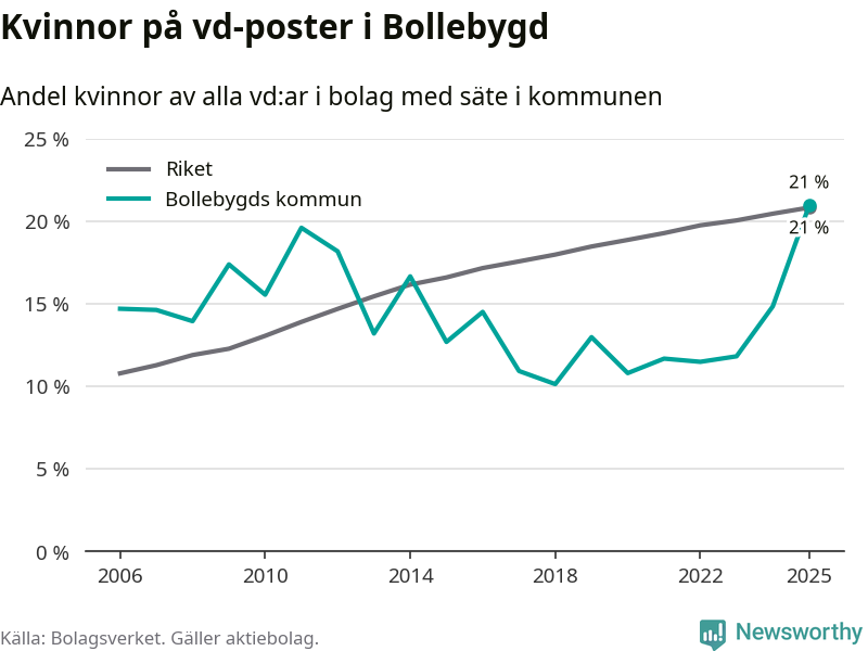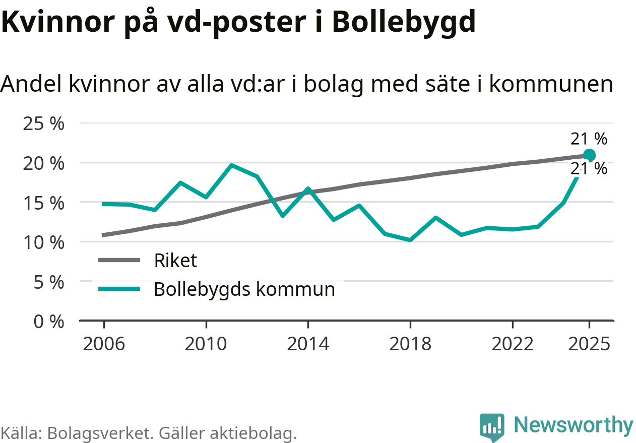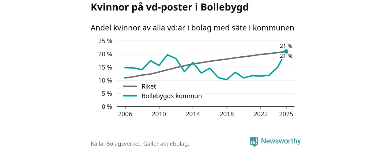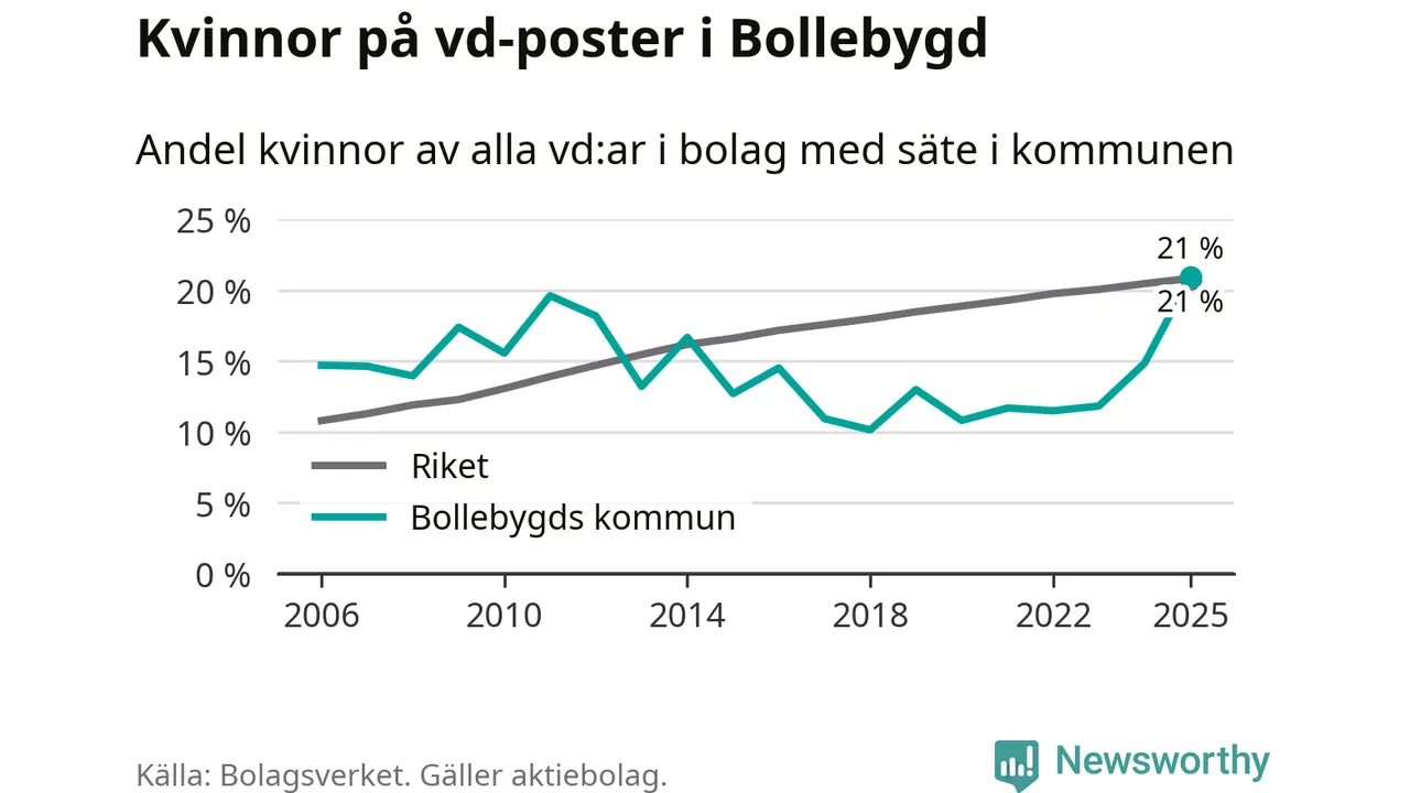 21 procent av aktiebolagen med registrerad vd i Bollebygd hade en kvinna på posten vid årsskiftet. Det innebär att på varje kvinnlig vd går fyra män.