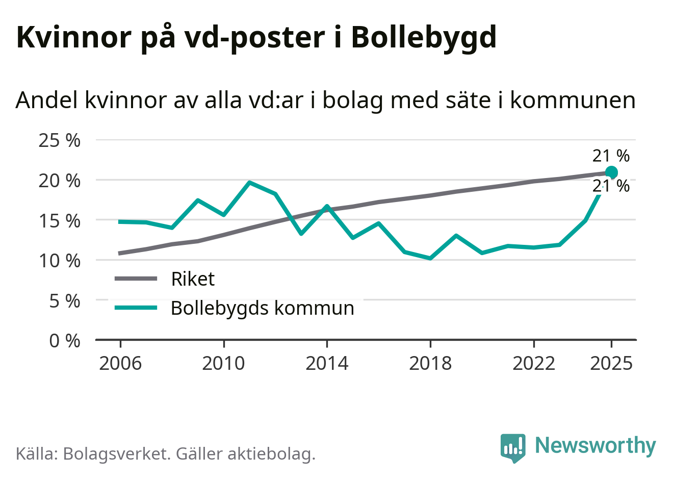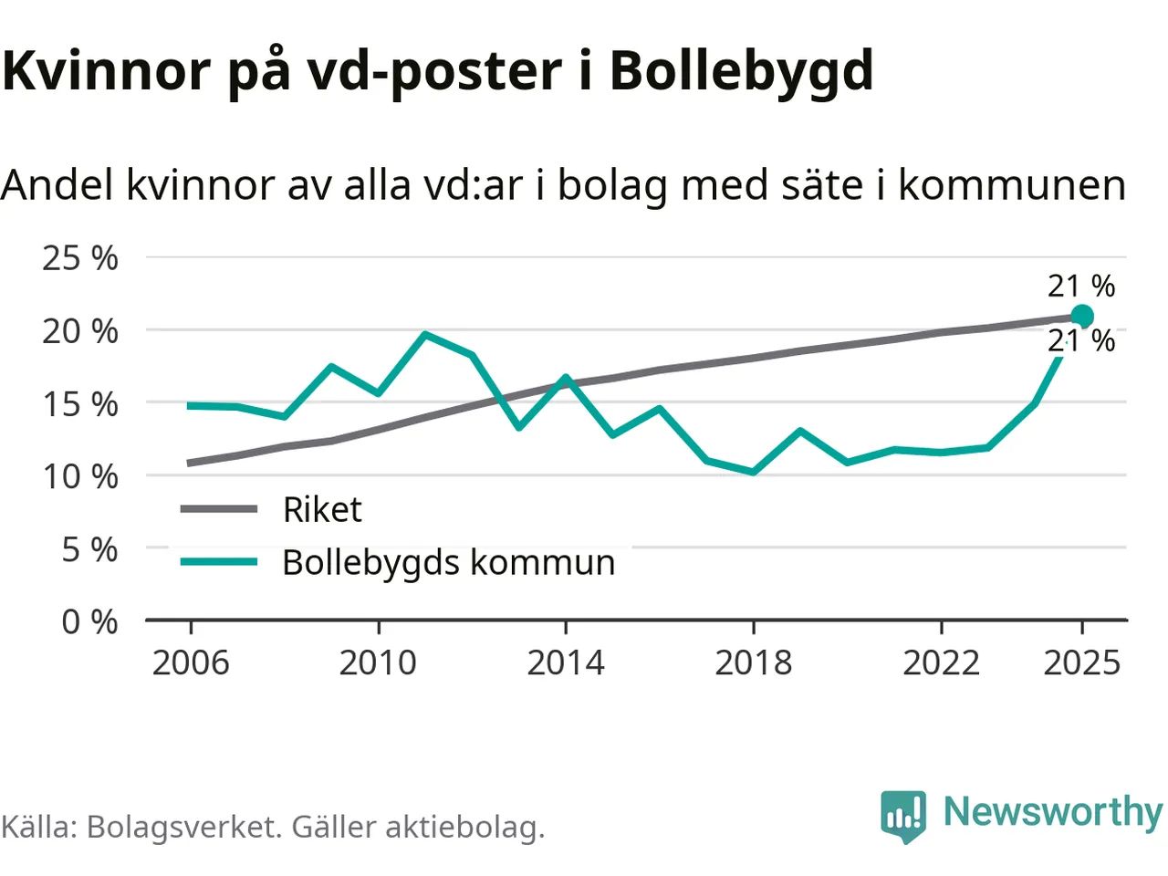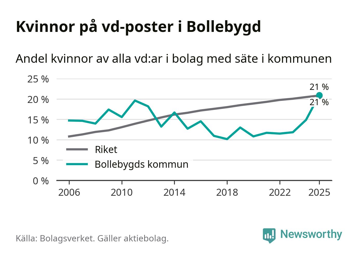21 procent av aktiebolagen med registrerad vd i Bollebygd hade en kvinna på posten vid årsskiftet. Det innebär att på varje kvinnlig vd går fyra män.