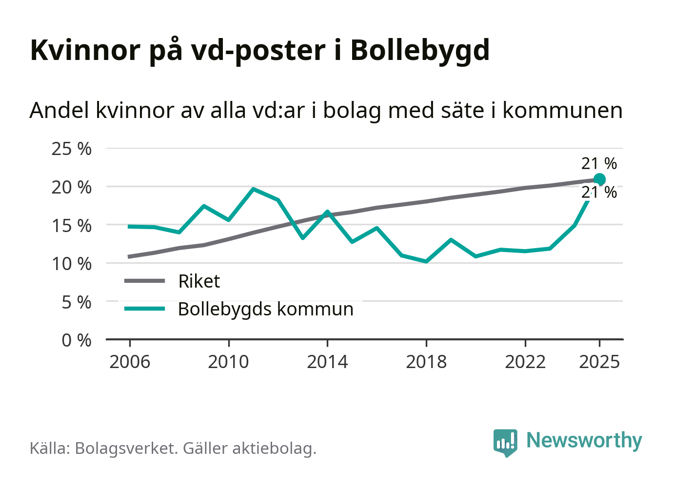 I riket som helhet är 22 procent av vd:arna som är under 50 år kvinnor, medan motsvarande siffra för direktörerna som är äldre är 20 procent. I Bollebygd är det ingen större skillnad i andel kvinnliga vd:ar i de olika åldersgrupperna.