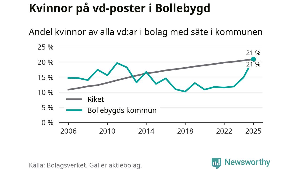 Det är fortfarande män som är vd i nästan fyra av fem bolag i Sverige och könsfördelningen alltså ser ungefär likadan ut i Bollebygd. Högst andel kvinnliga vd:ar i Västra Götaland har företagen med säte i Dals-Eds kommun, 31 procent. Där rör det sig dock om relativt få företag – 45 stycken totalt – och även små förändringar får stora utslag i andelen kvinnliga vd:ar. Lägst är andelen bland företagen med säte i Munkedals kommun, 9 procent.