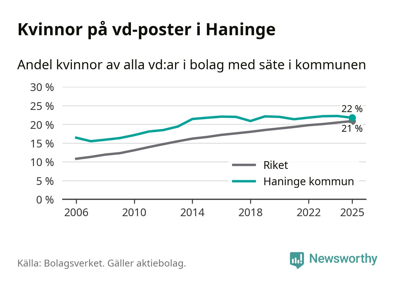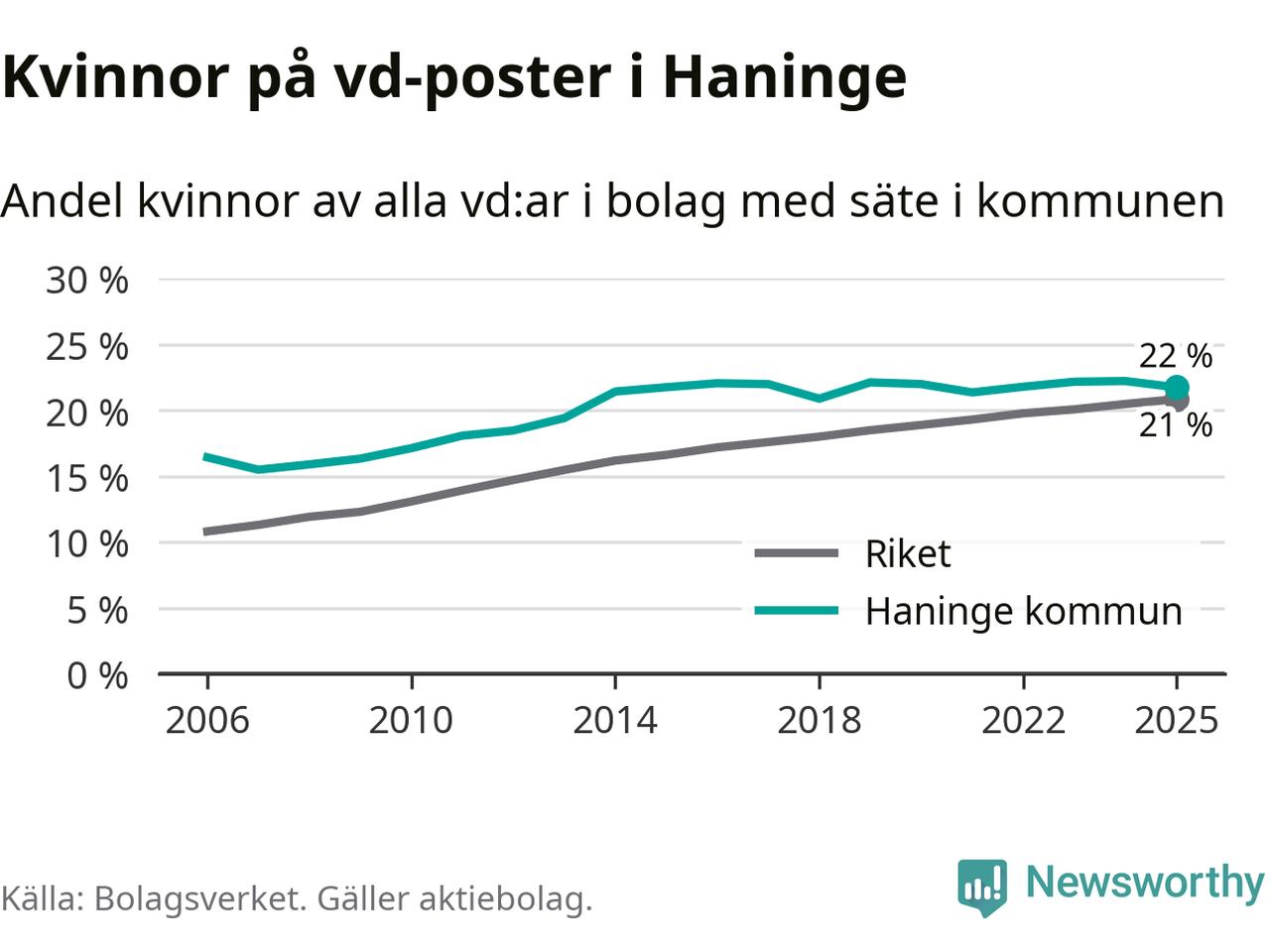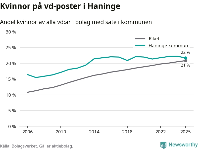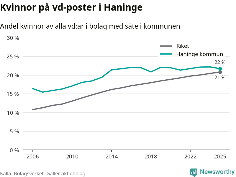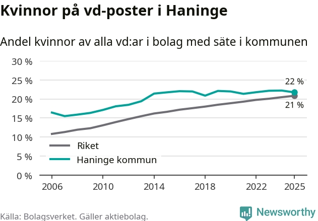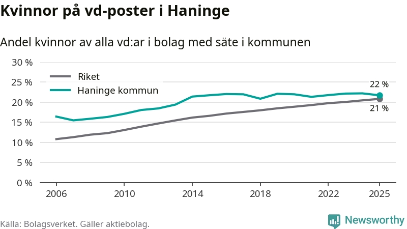 Bara var femte svenskt aktiebolag leds av en kvinna. Och Haningeföretagen ligger nära rikssnittet. Det visar siffror från Bolagsverket.