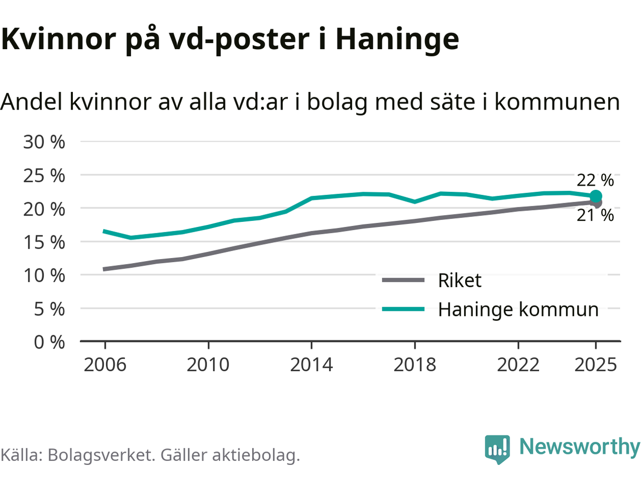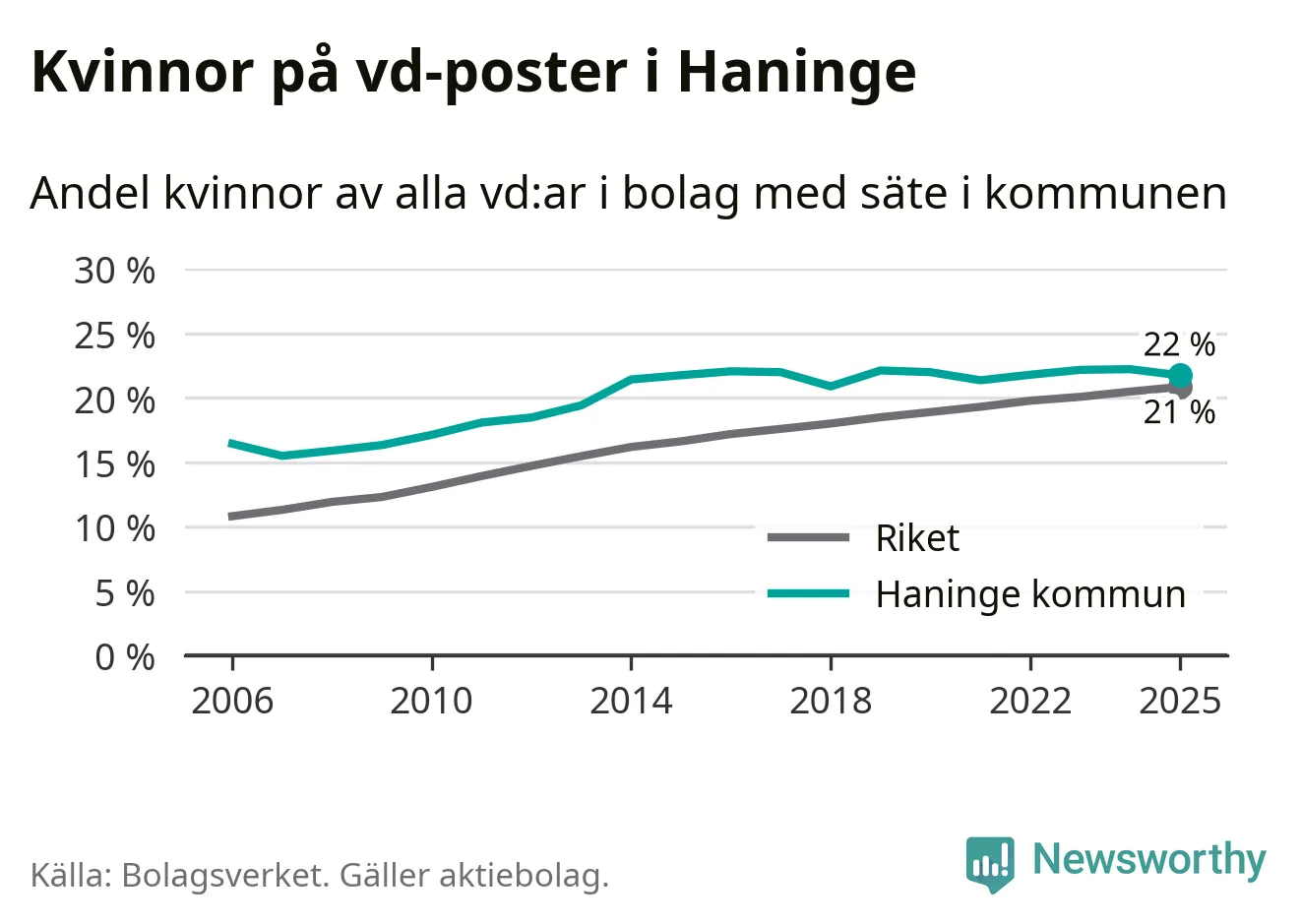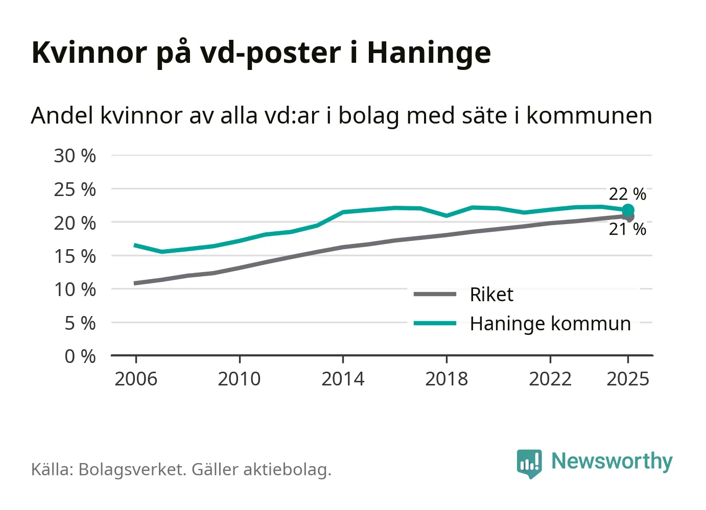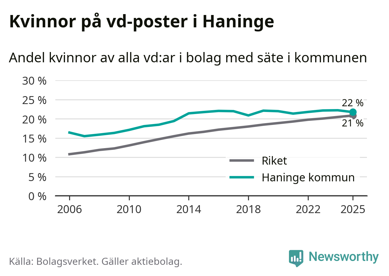 Bara var femte svenskt aktiebolag leds av en kvinna. Och Haningeföretagen ligger nära rikssnittet. Det visar siffror från Bolagsverket.