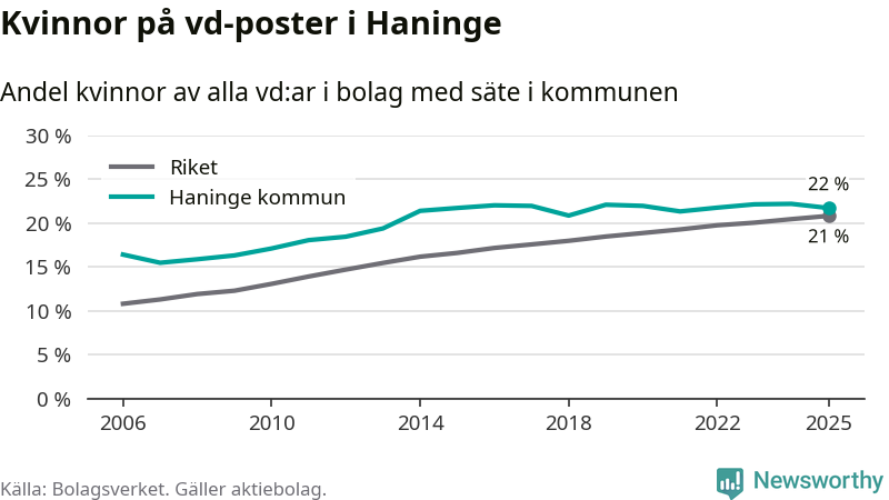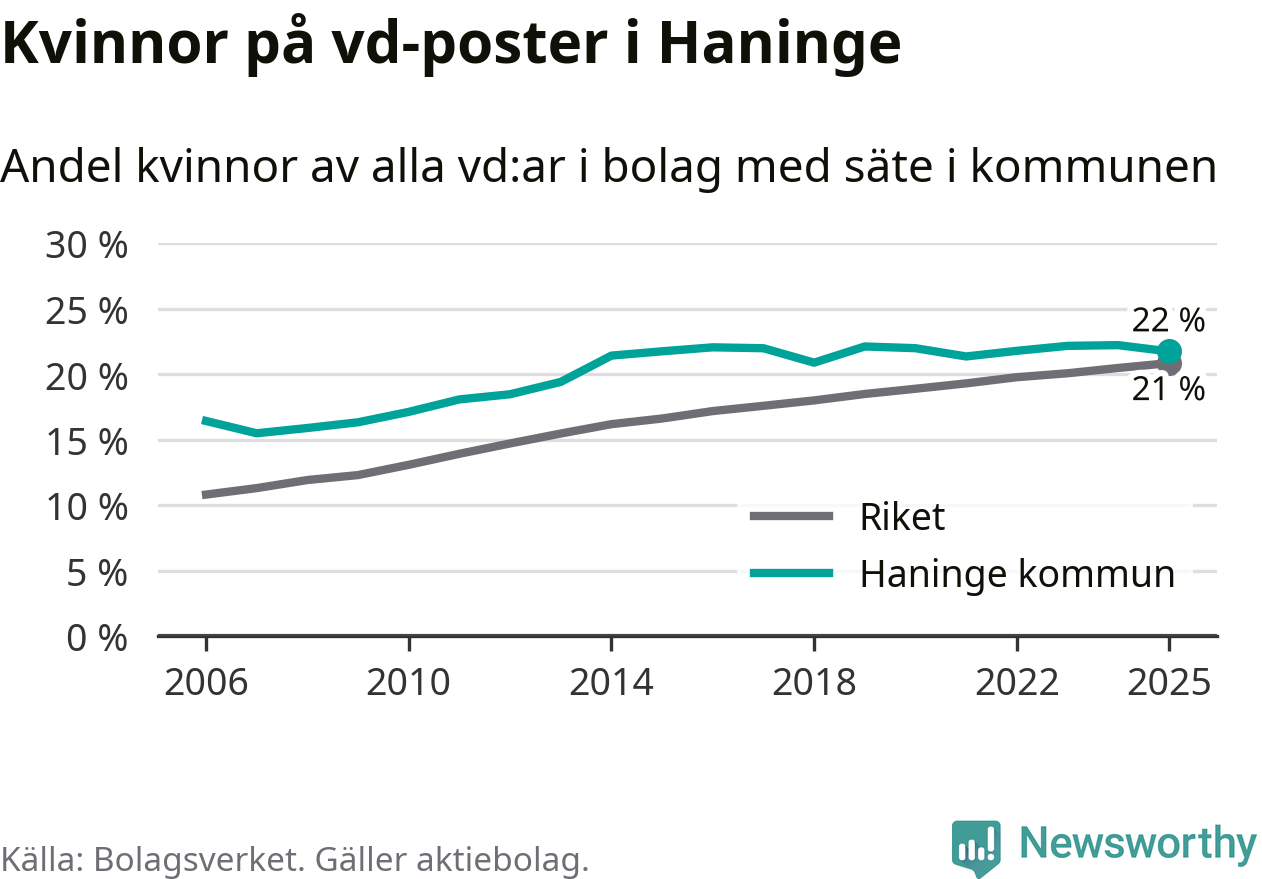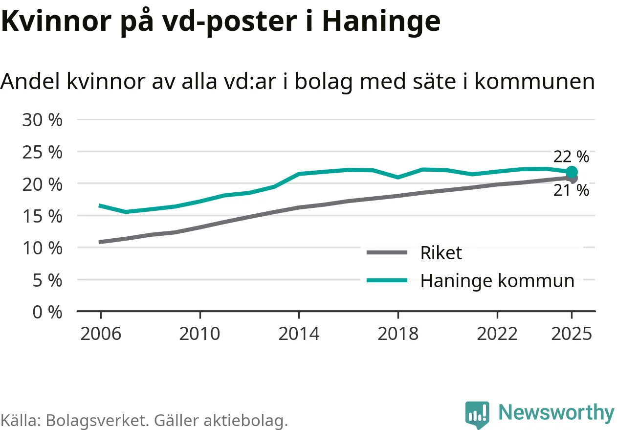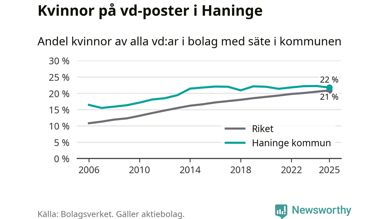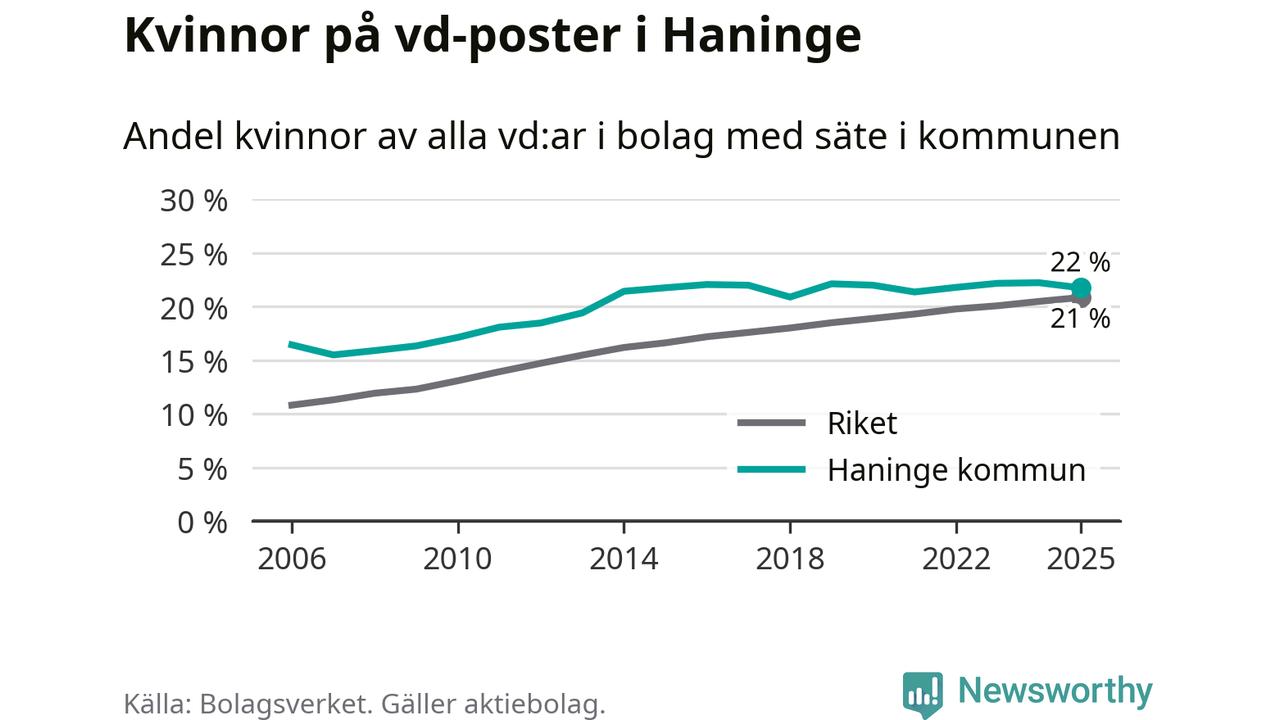 Det är fortfarande män som är vd i nästan fyra av fem bolag i Sverige och könsfördelningen alltså ser ungefär likadan ut i Haninge. Högst andel kvinnliga vd:ar i Stockholms län har företagen med säte i Danderyds kommun, 32 procent. Lägst är andelen bland företagen med säte i Nykvarns kommun, 18 procent.