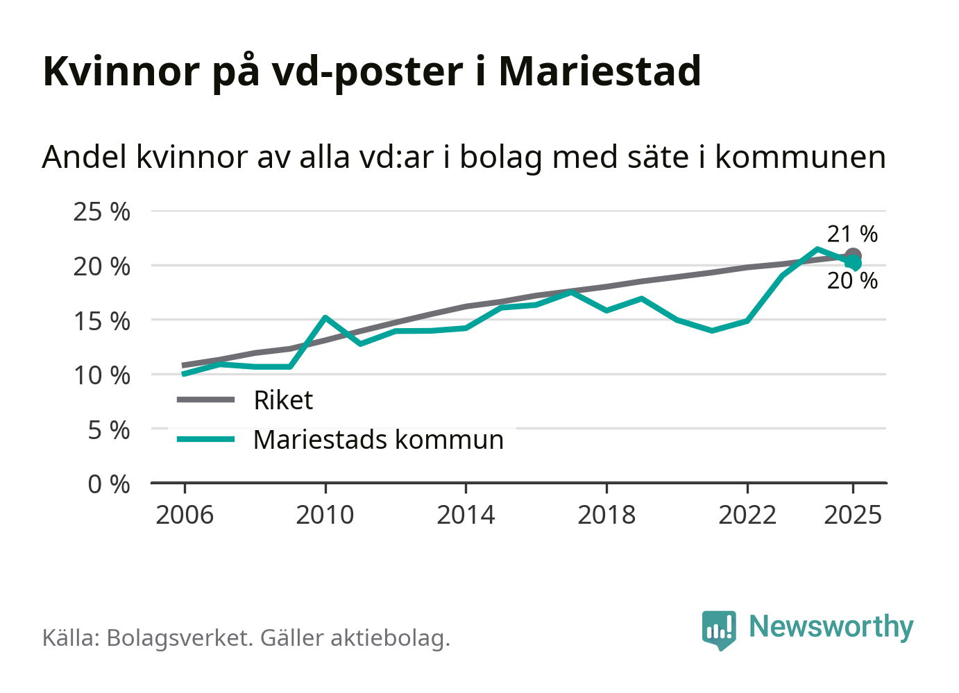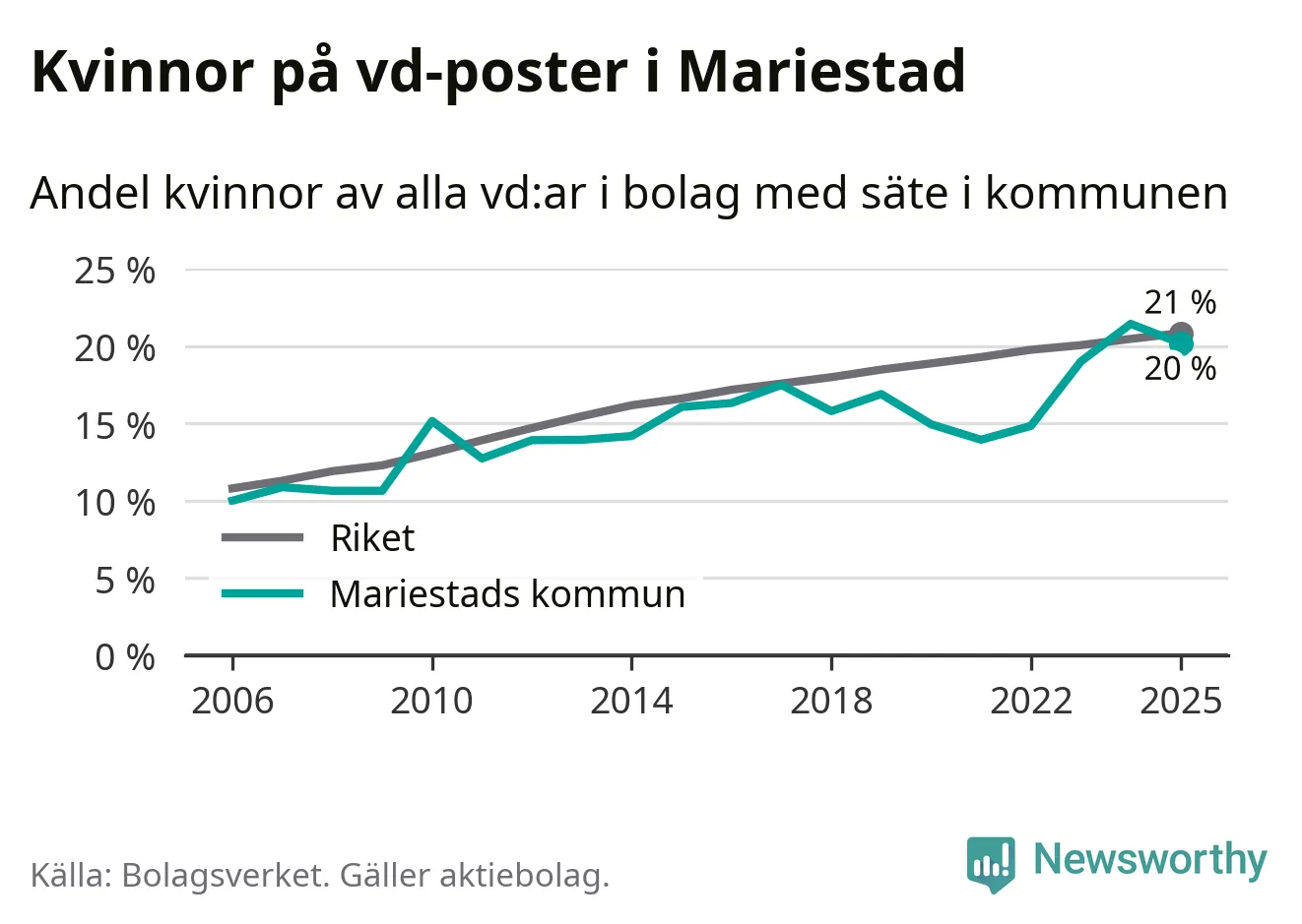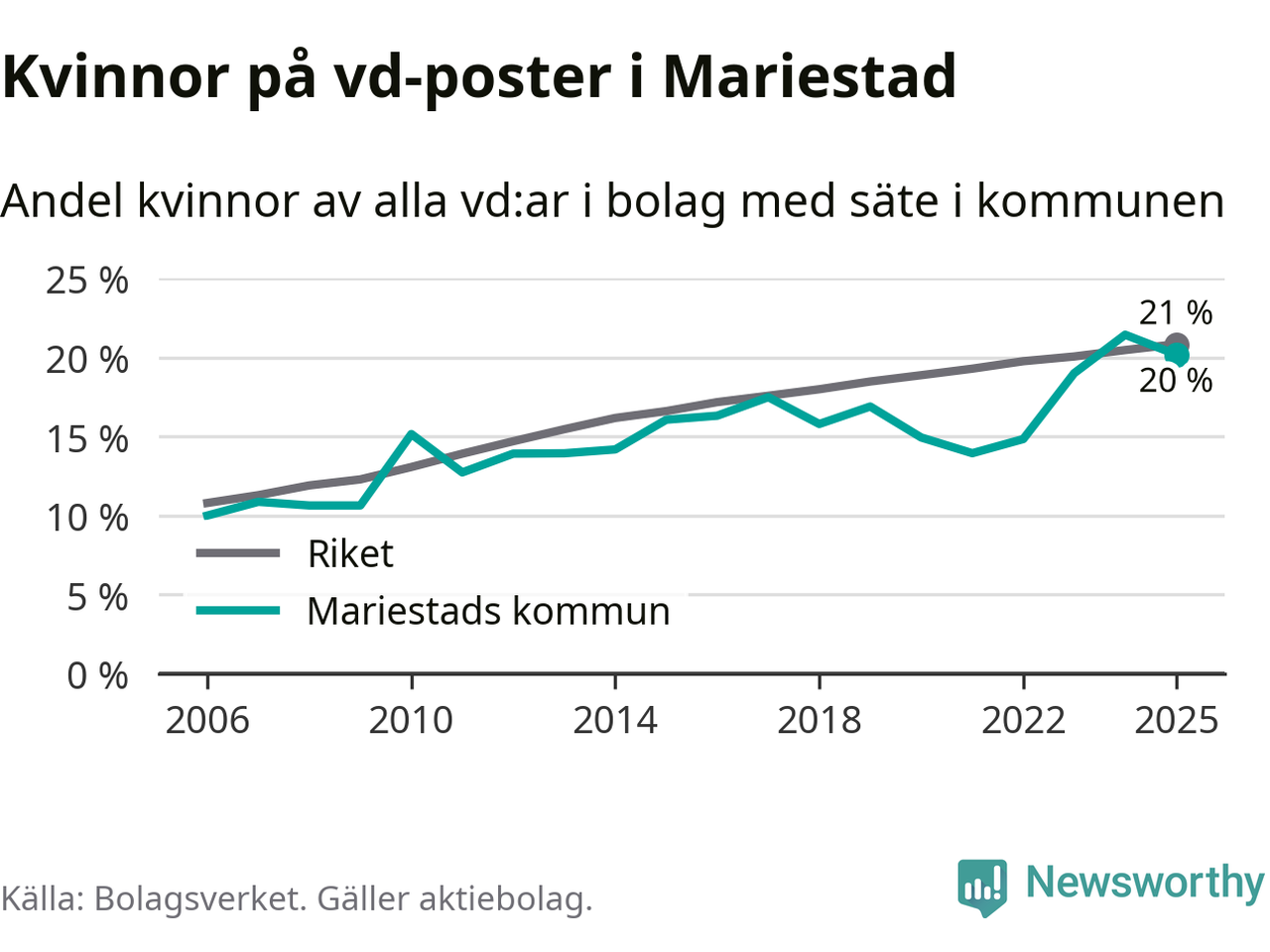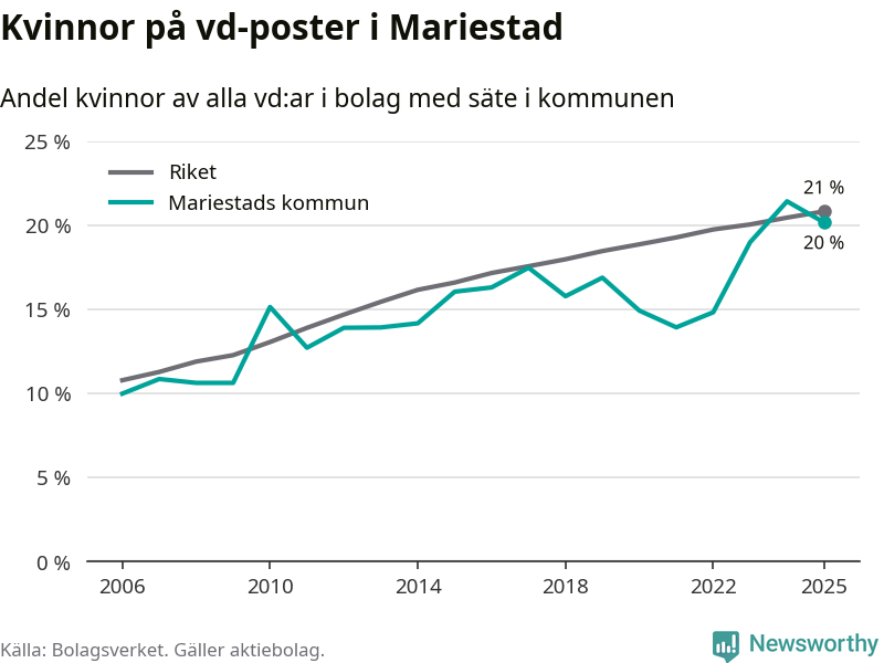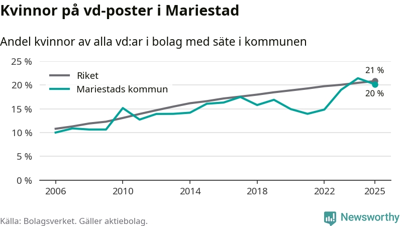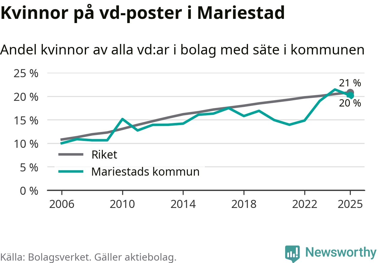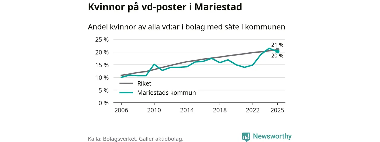 Det är fortfarande män som är vd i nästan fyra av fem bolag i Sverige och könsfördelningen alltså ser ungefär likadan ut i Mariestad. Högst andel kvinnliga vd:ar i Västra Götaland har företagen med säte i Dals-Eds kommun, 31 procent. Där rör det sig dock om relativt få företag – 45 stycken totalt – och även små förändringar får stora utslag i andelen kvinnliga vd:ar. Lägst är andelen bland företagen med säte i Munkedals kommun, 9 procent.