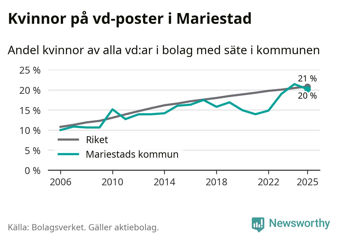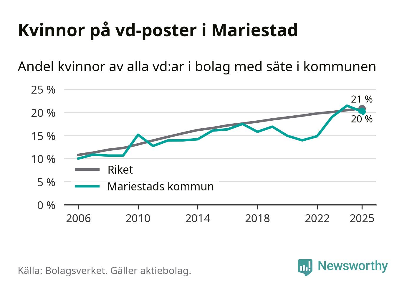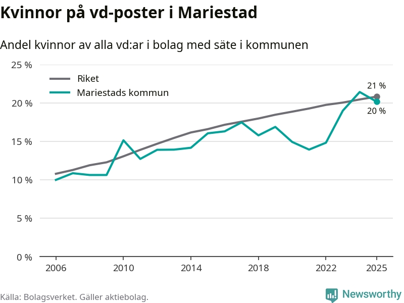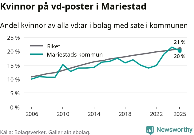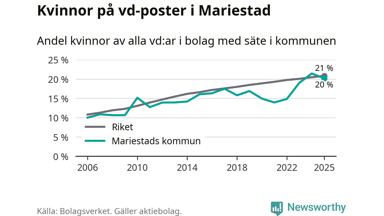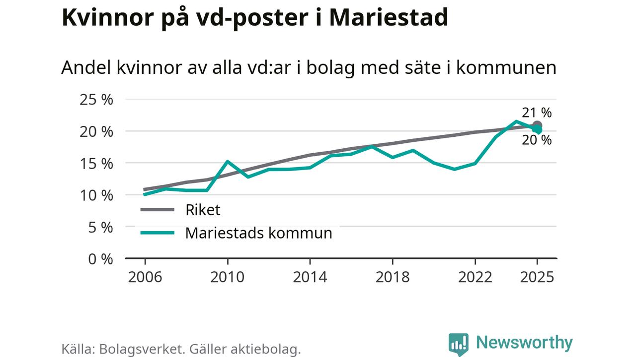 20 procent av aktiebolagen med registrerad vd i Mariestad hade en kvinna på posten vid årsskiftet. Det innebär att på varje kvinnlig vd går fyra män.