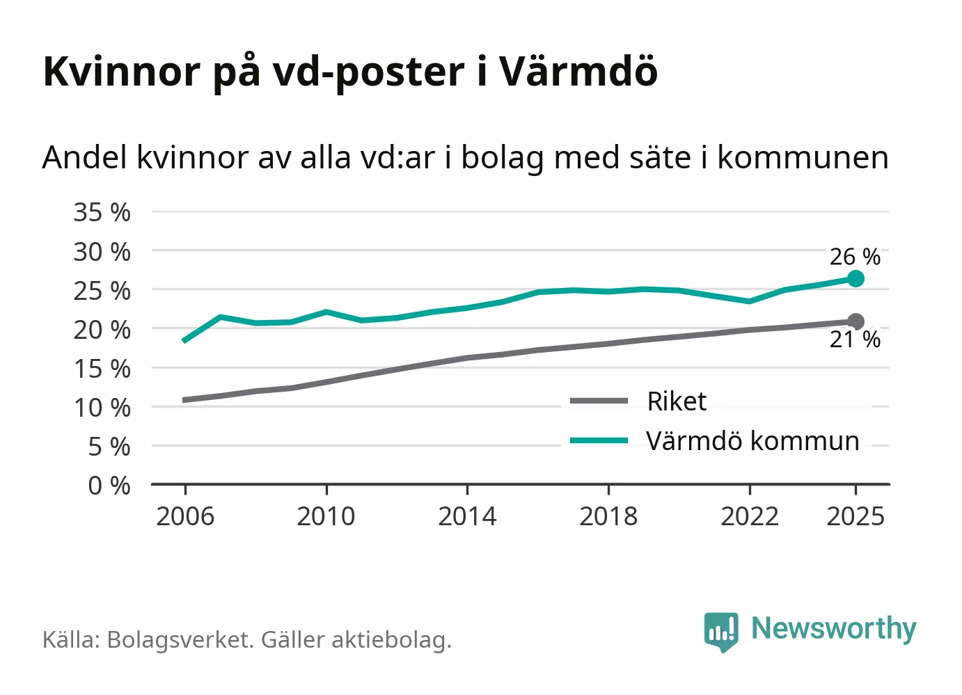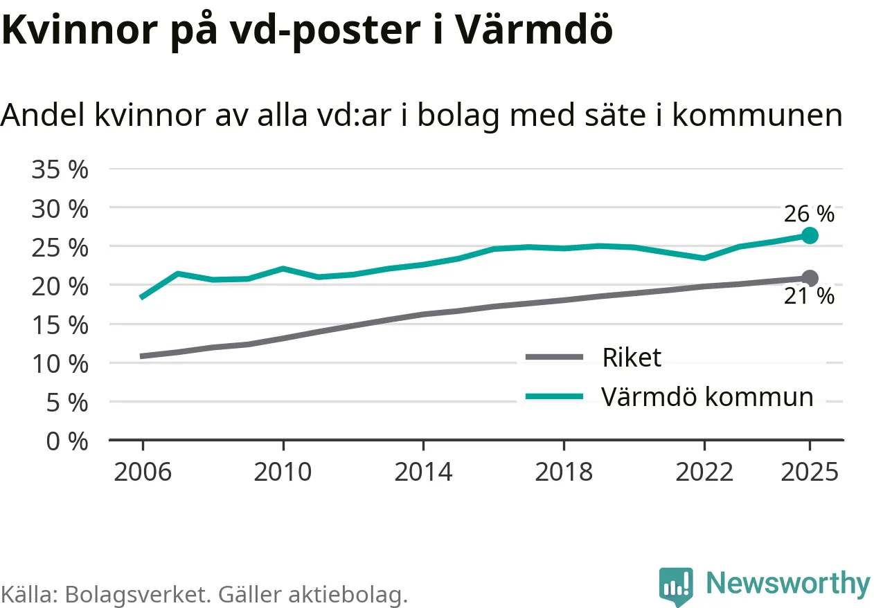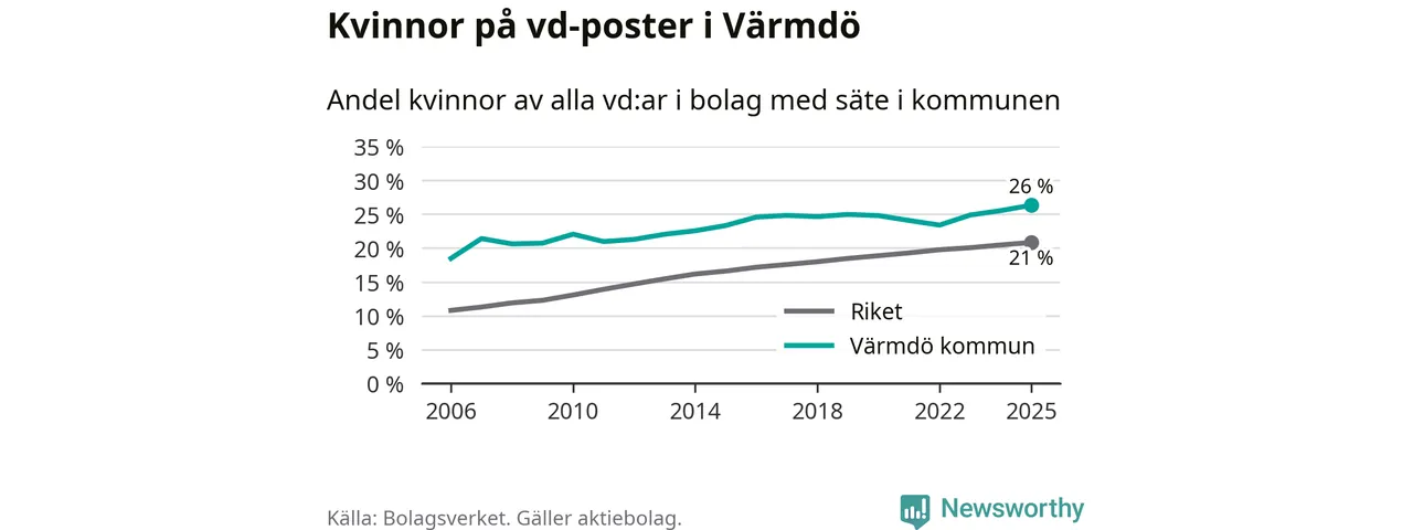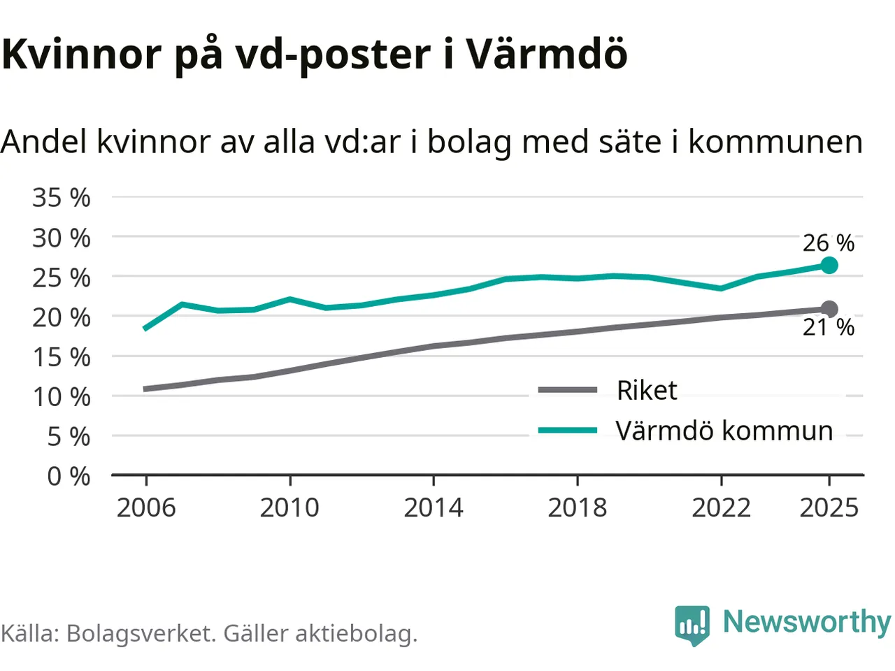 Det är fortfarande män som är vd i nästan fyra av fem bolag i Sverige, men i Värmdö är det alltså en högre andel kvinnor på vd-posten. Högst andel kvinnliga vd:ar i Stockholms län har företagen med säte i Danderyds kommun, 32 procent. Lägst är andelen bland företagen med säte i Nykvarns kommun, 18 procent.