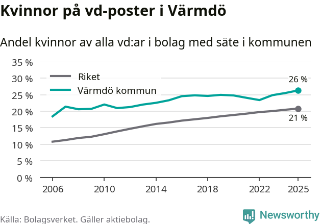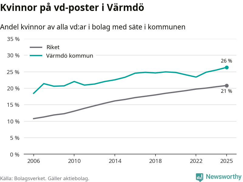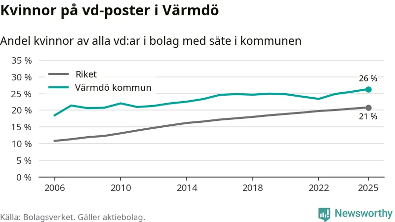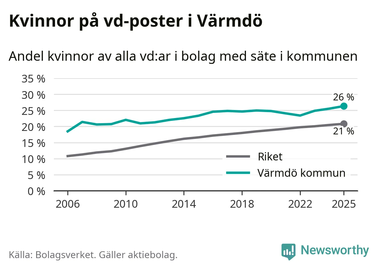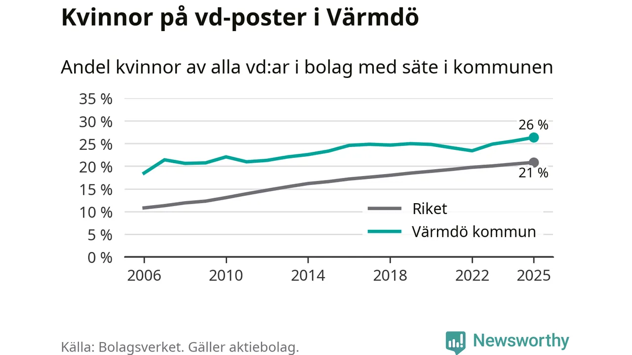 Det är fortfarande män som är vd i nästan fyra av fem bolag i Sverige, men i Värmdö är det alltså en högre andel kvinnor på vd-posten. Högst andel kvinnliga vd:ar i Stockholms län har företagen med säte i Danderyds kommun, 32 procent. Lägst är andelen bland företagen med säte i Nykvarns kommun, 18 procent.