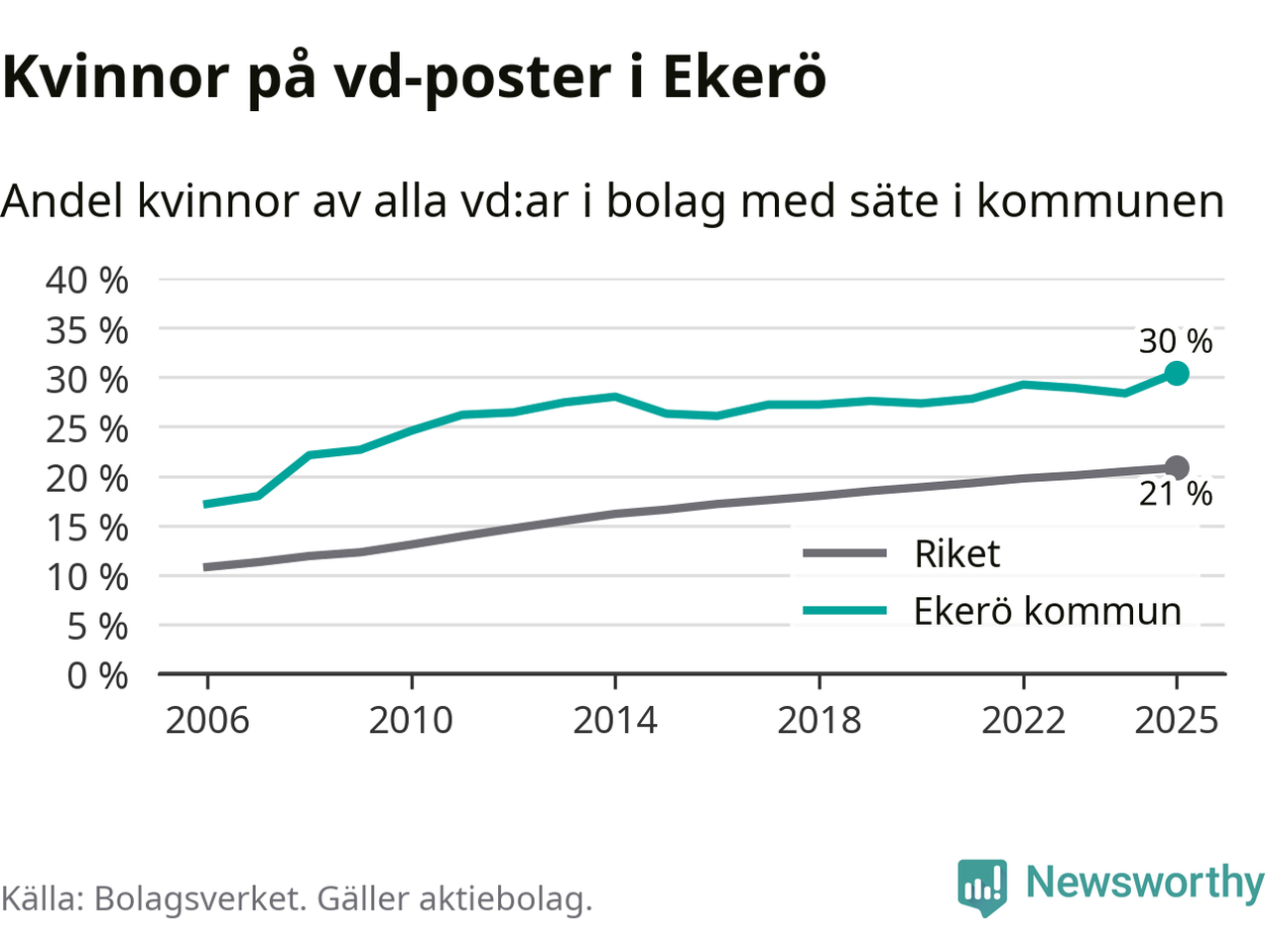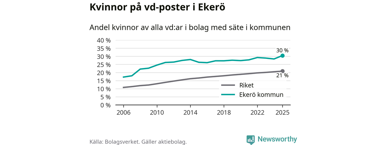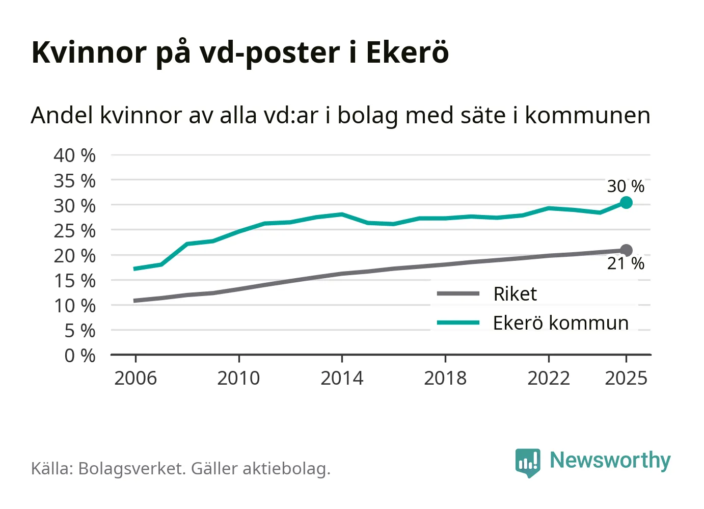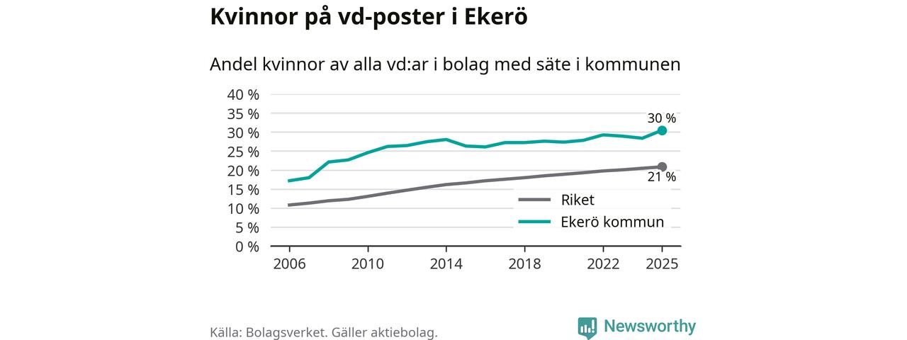 Det är fortfarande män som är vd i nästan fyra av fem bolag i Sverige, men i Ekerö är det alltså en högre andel kvinnor på vd-posten. Högst andel kvinnliga vd:ar i Stockholms län har företagen med säte i Danderyds kommun, 32 procent. Lägst är andelen bland företagen med säte i Nykvarns kommun, 18 procent.