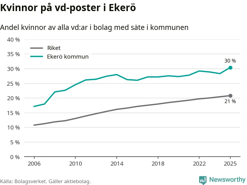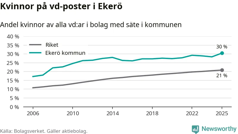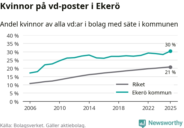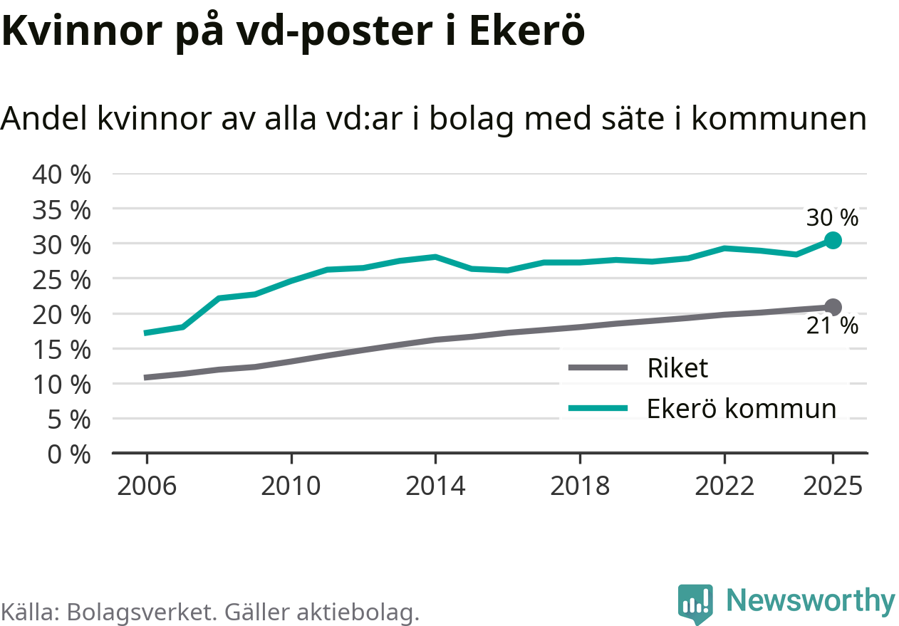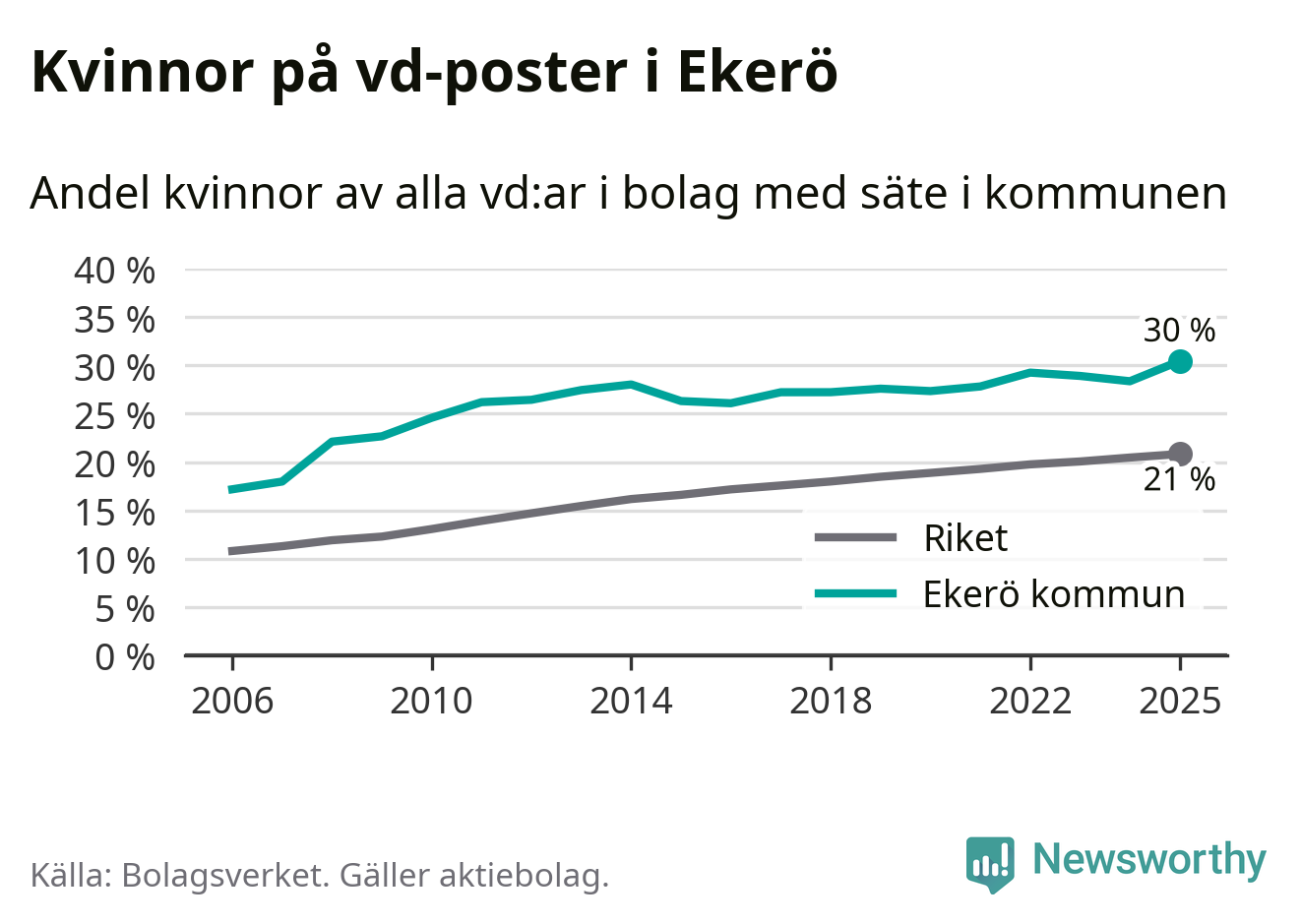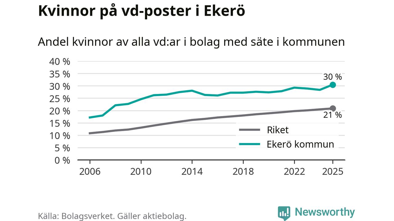 Det är fortfarande män som är vd i nästan fyra av fem bolag i Sverige, men i Ekerö är det alltså en högre andel kvinnor på vd-posten. Högst andel kvinnliga vd:ar i Stockholms län har företagen med säte i Danderyds kommun, 32 procent. Lägst är andelen bland företagen med säte i Nykvarns kommun, 18 procent.
