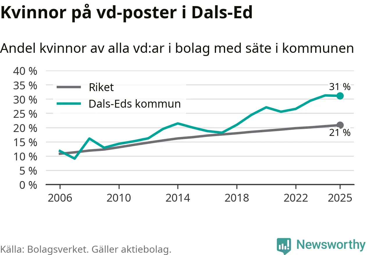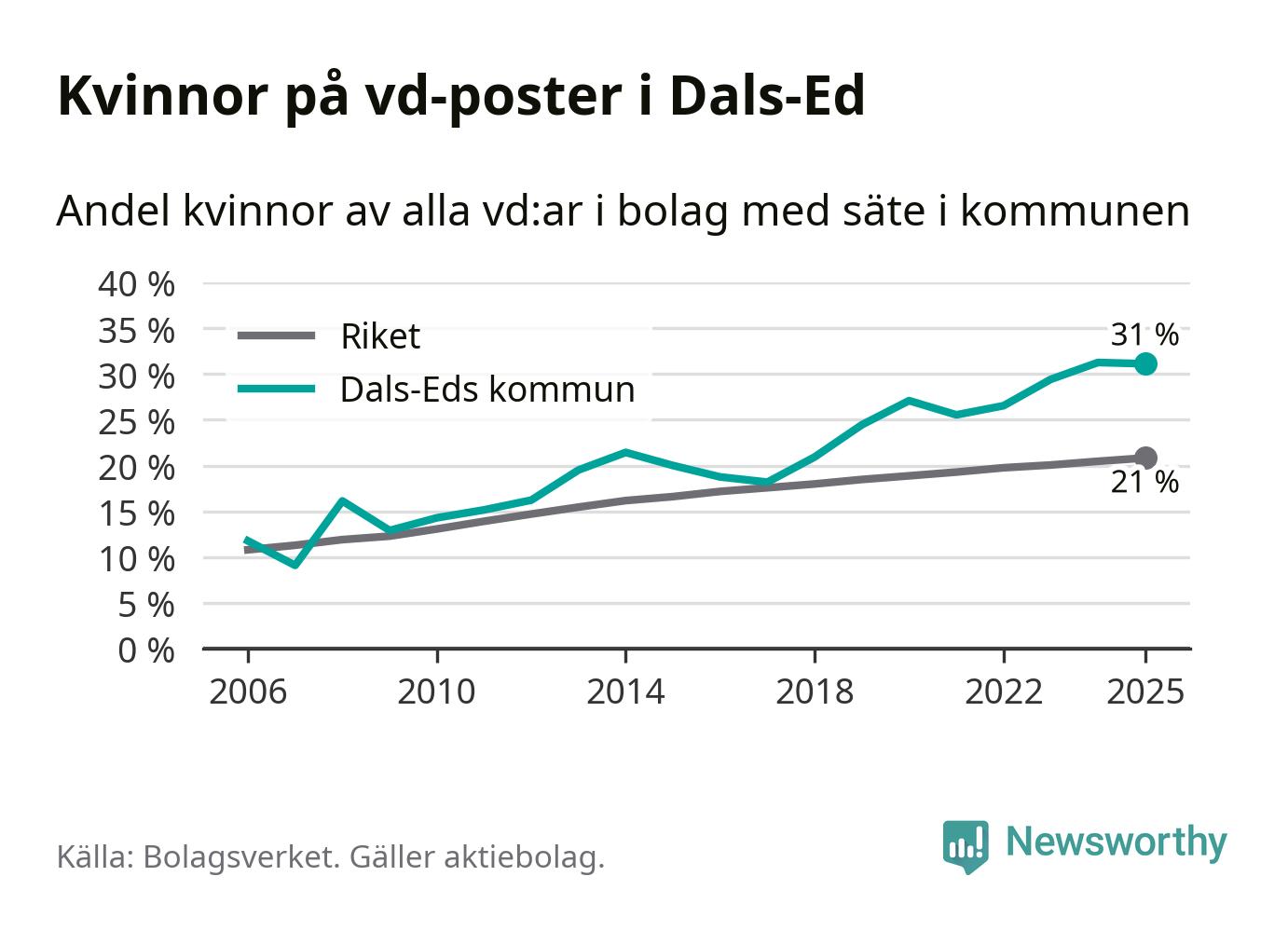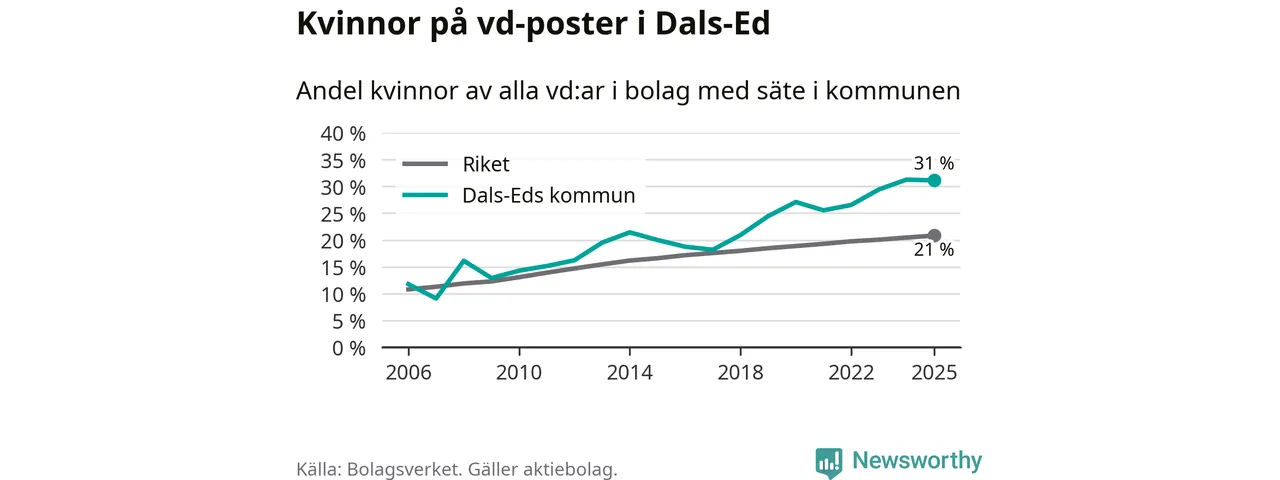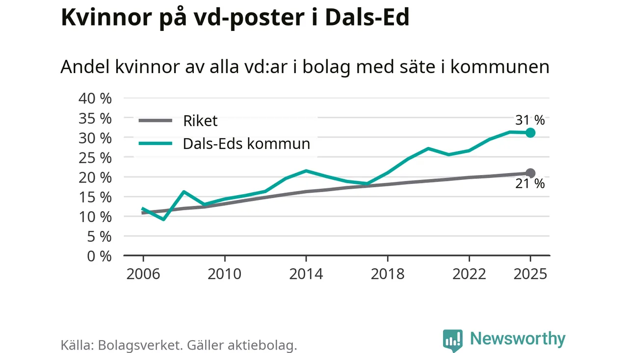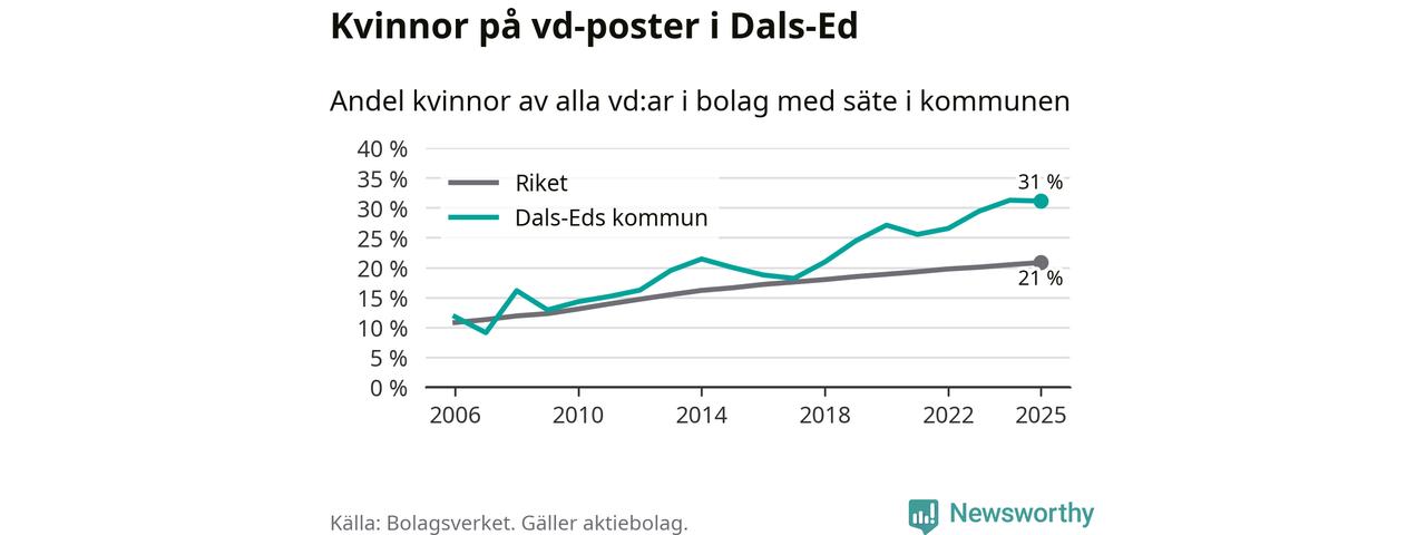 Det är fortfarande män som är vd i nästan fyra av fem bolag i Sverige, men i Dals-Ed är det alltså en högre andel kvinnor på vd-posten. 31 procent är den tredje högsta andelen av alla kommuner i Sverige – och den högsta andelen i Västra Götaland. Lägsta andelen kvinnor i länet har företagen med säte i Munkedals kommun, 9 procent.