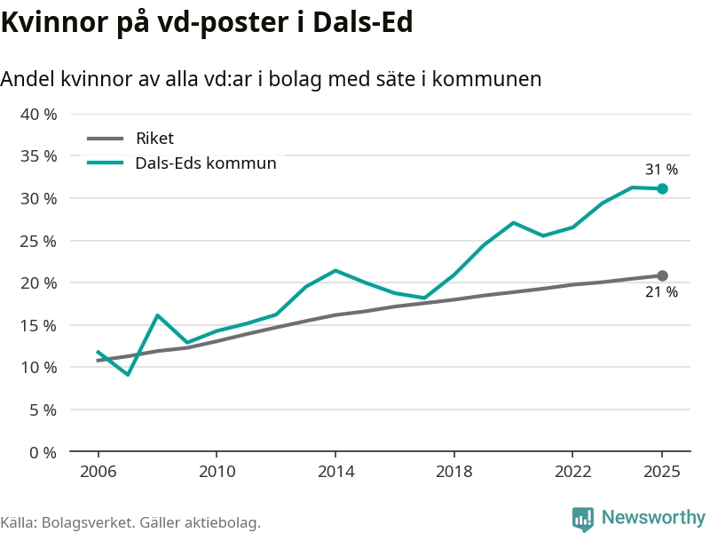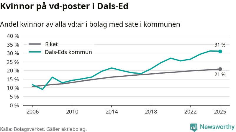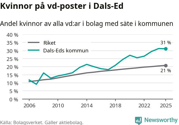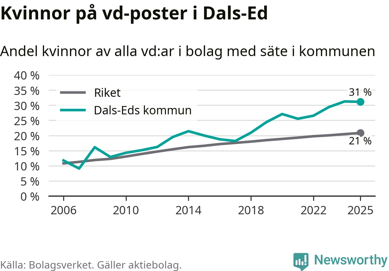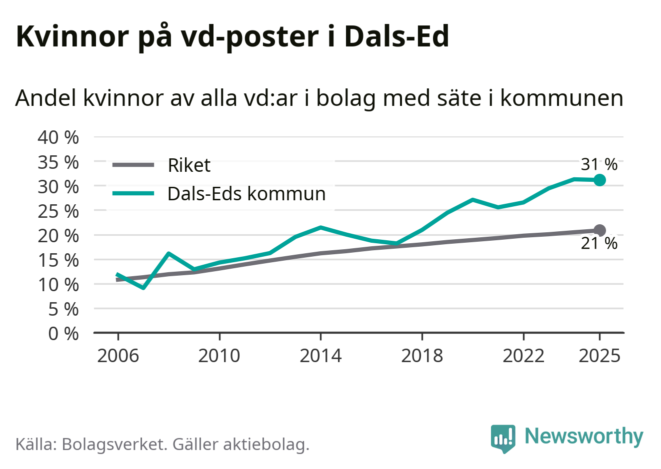 Det är fortfarande män som är vd i nästan fyra av fem bolag i Sverige, men i Dals-Ed är det alltså en högre andel kvinnor på vd-posten. 31 procent är den tredje högsta andelen av alla kommuner i Sverige – och den högsta andelen i Västra Götaland. Lägsta andelen kvinnor i länet har företagen med säte i Munkedals kommun, 9 procent.