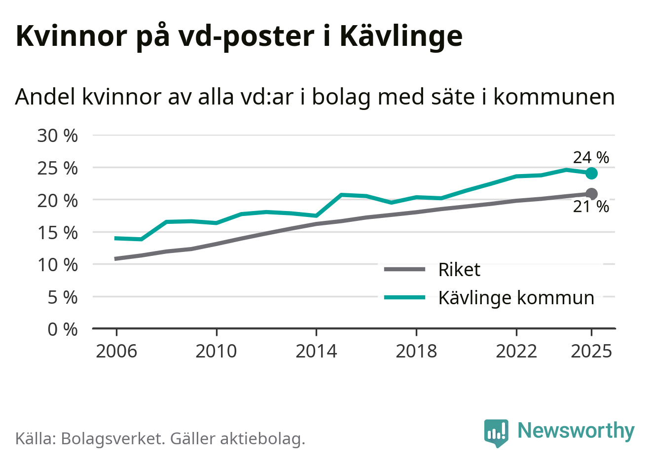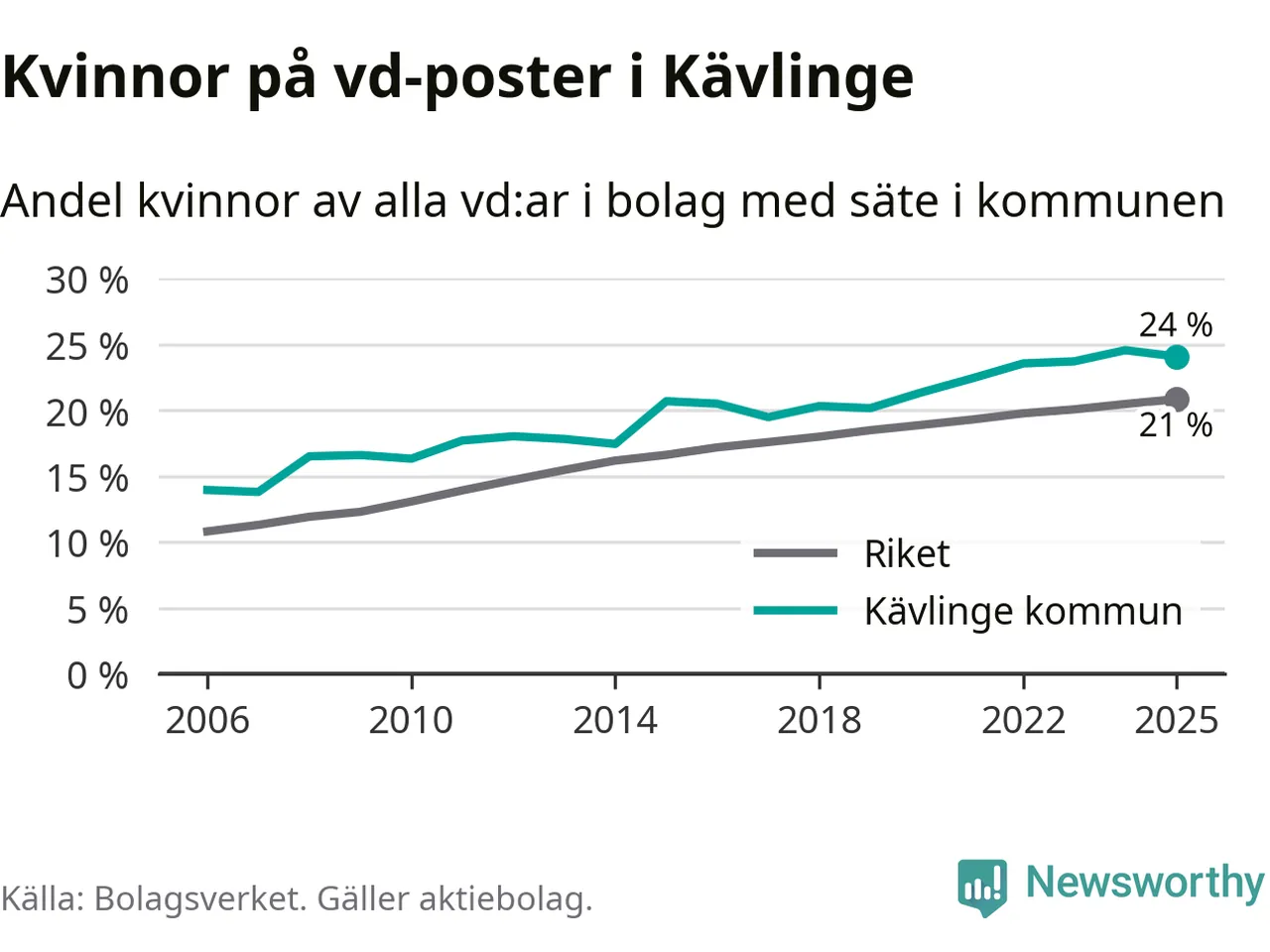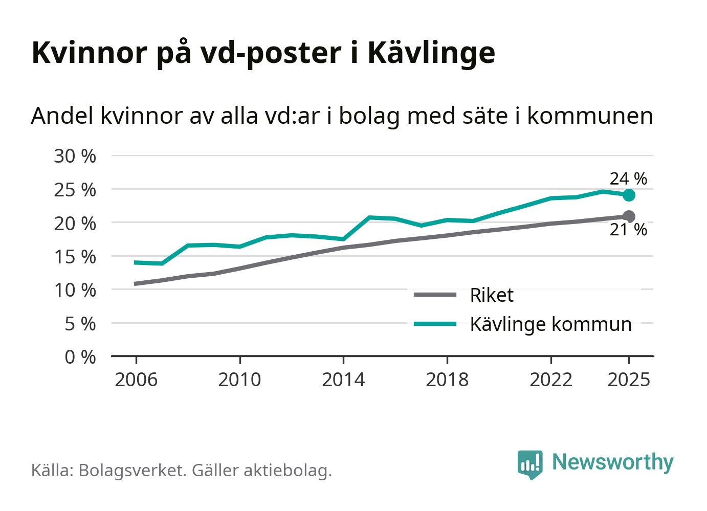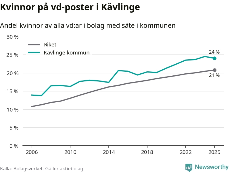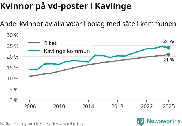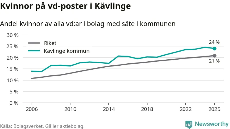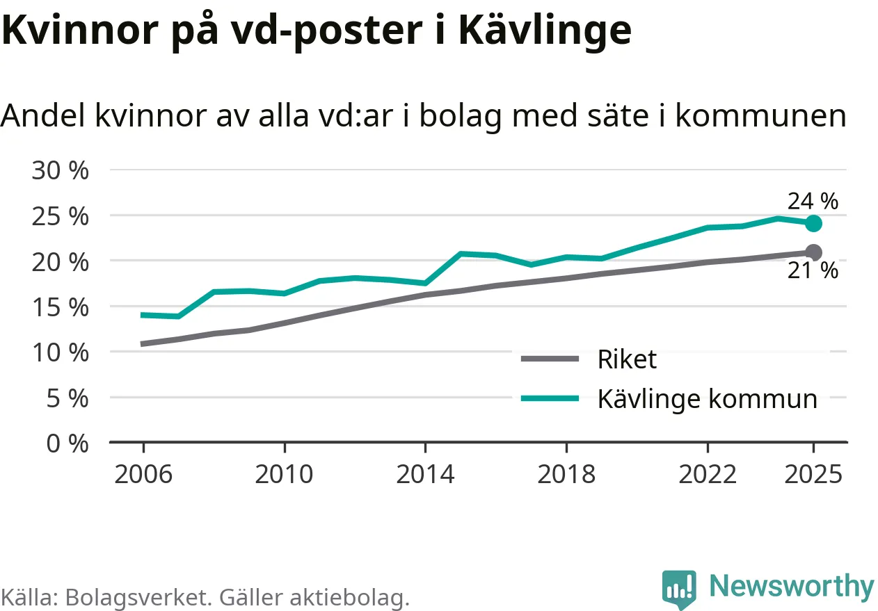 24 procent av aktiebolagen med registrerad vd i Kävlinge hade en kvinna på posten vid årsskiftet. Det innebär att på varje kvinnlig vd går tre män.