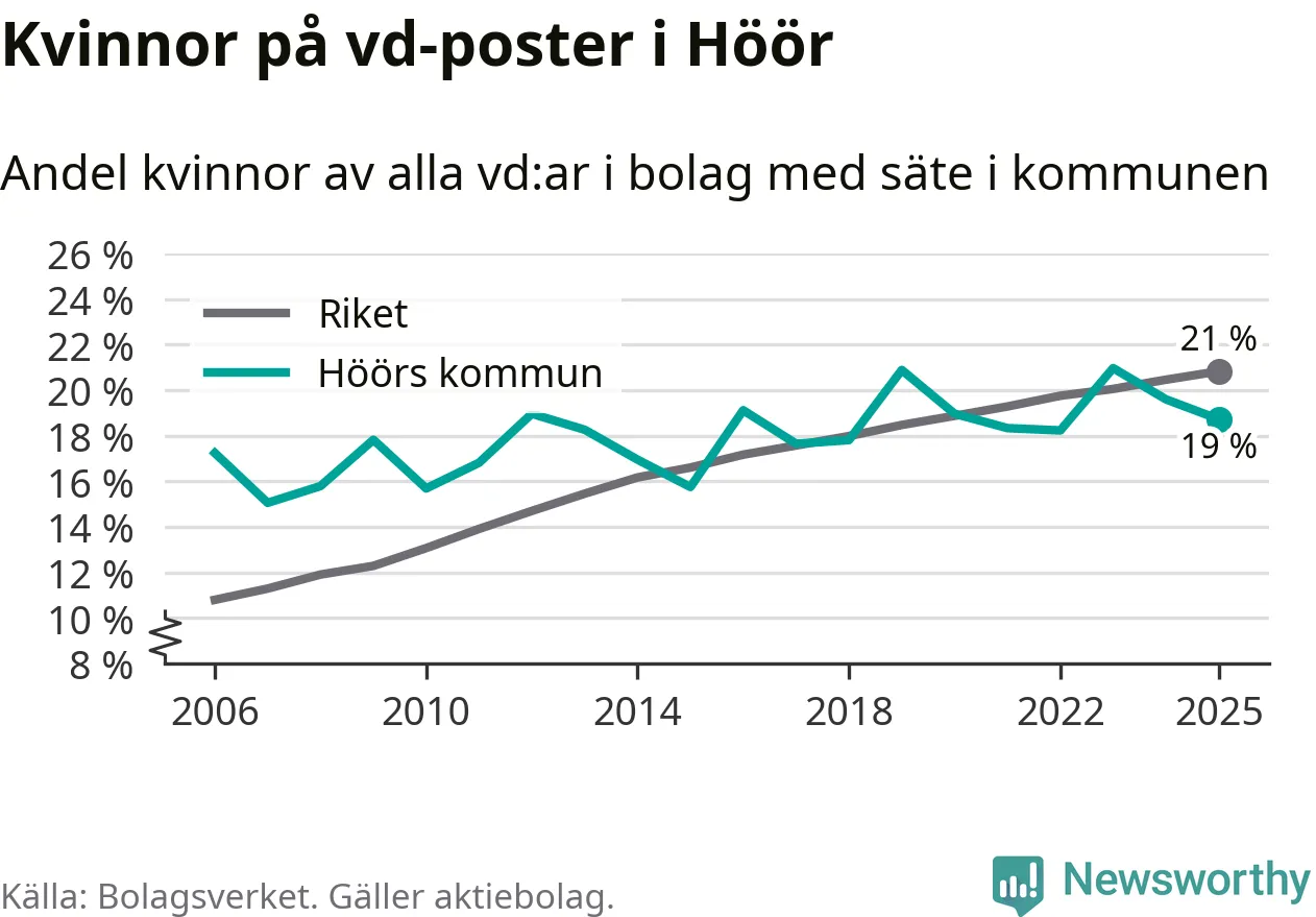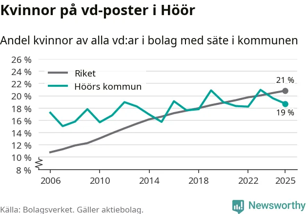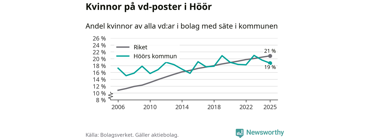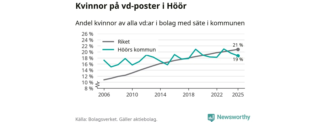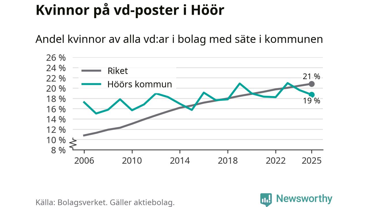 Det är fortfarande män som är vd i nästan fyra av fem bolag i Sverige och i Höör är det alltså en något lägre andel kvinnor på vd-posten. Högst andel kvinnliga vd:ar i Skåne har företagen med säte i Tomelilla kommun, 30 procent. Lägst är andelen bland företagen med säte i Perstorps kommun, 13 procent. I Perstorp rör det sig om 62 företag totalt och även små förändringar får stora utslag i andelen kvinnliga vd:ar.