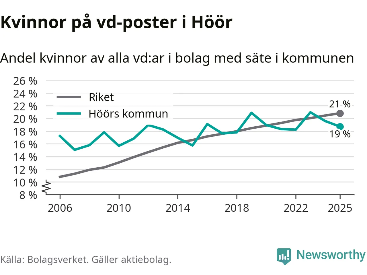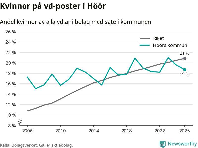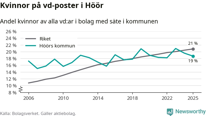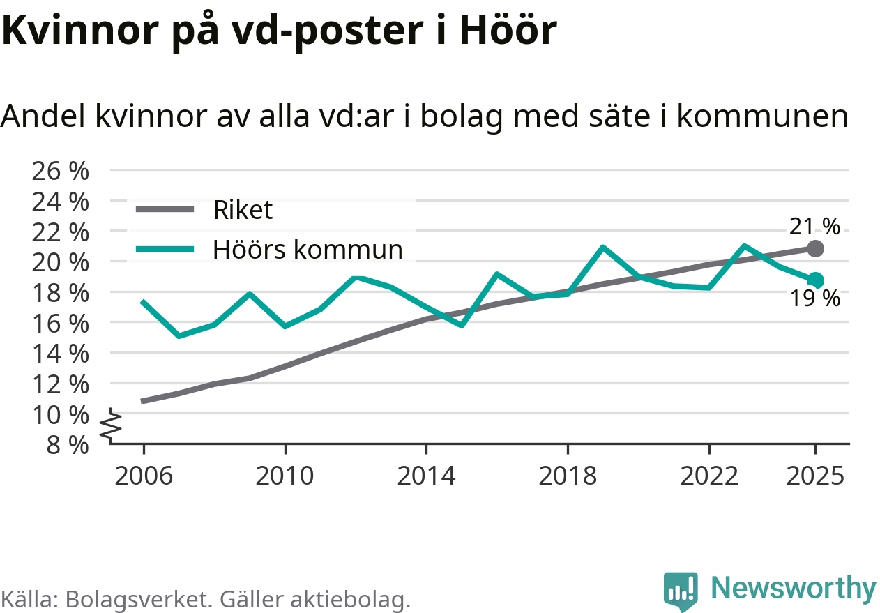 Det är fortfarande män som är vd i nästan fyra av fem bolag i Sverige och i Höör är det alltså en något lägre andel kvinnor på vd-posten. Högst andel kvinnliga vd:ar i Skåne har företagen med säte i Tomelilla kommun, 30 procent. Lägst är andelen bland företagen med säte i Perstorps kommun, 13 procent. I Perstorp rör det sig om 62 företag totalt och även små förändringar får stora utslag i andelen kvinnliga vd:ar.