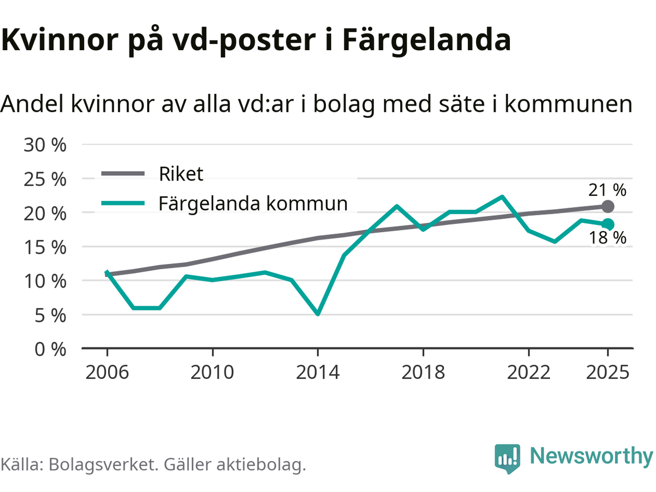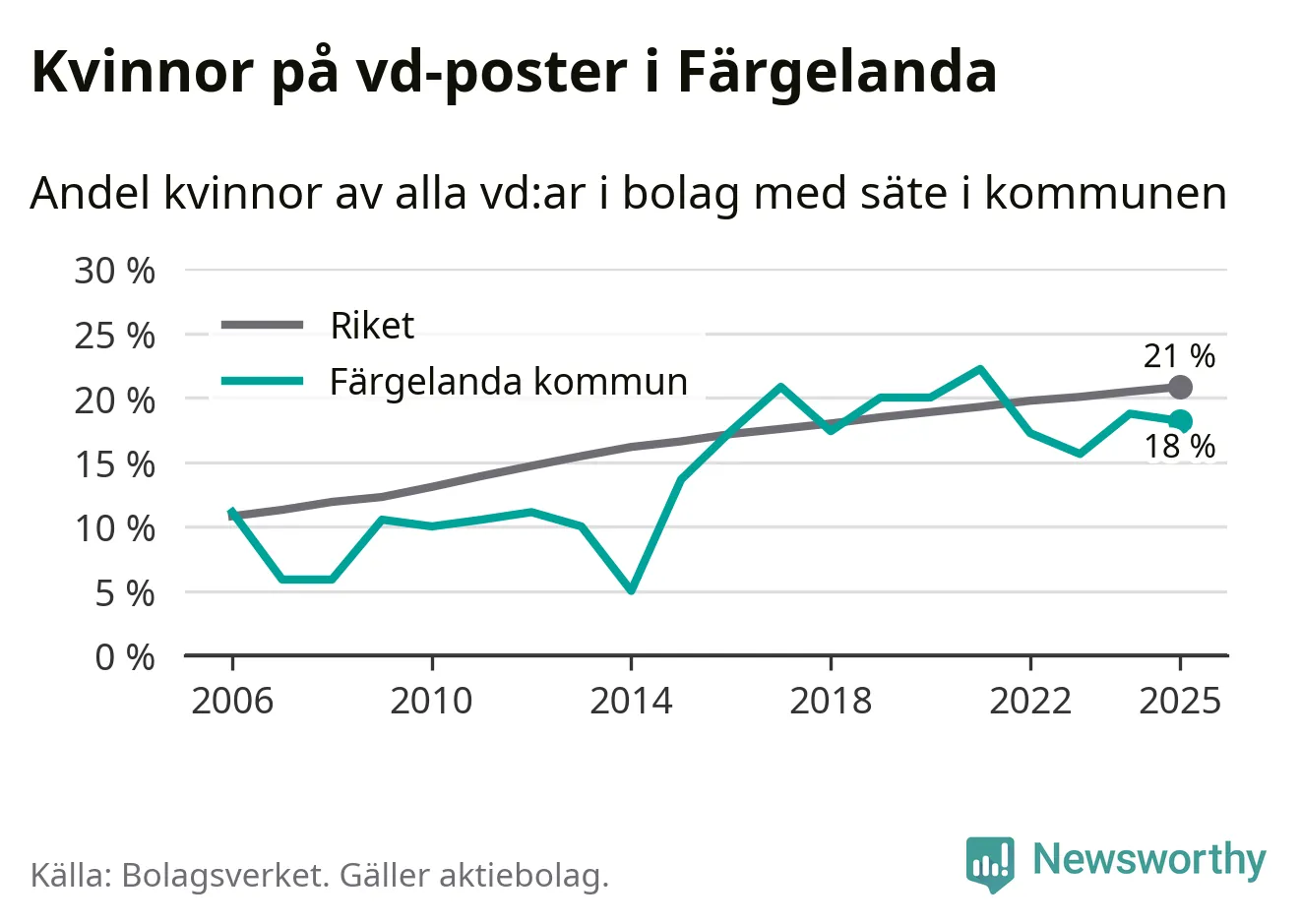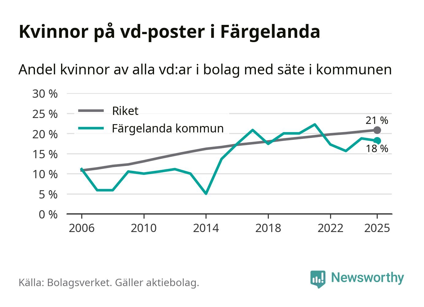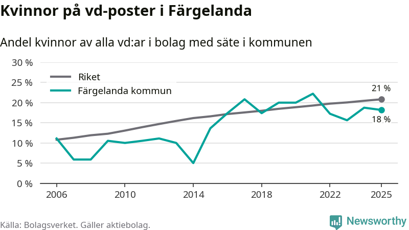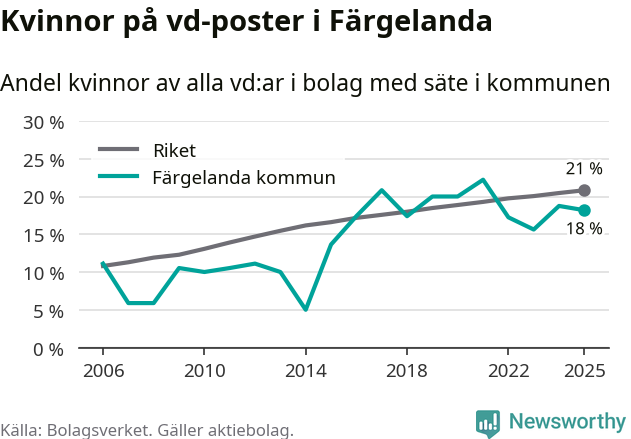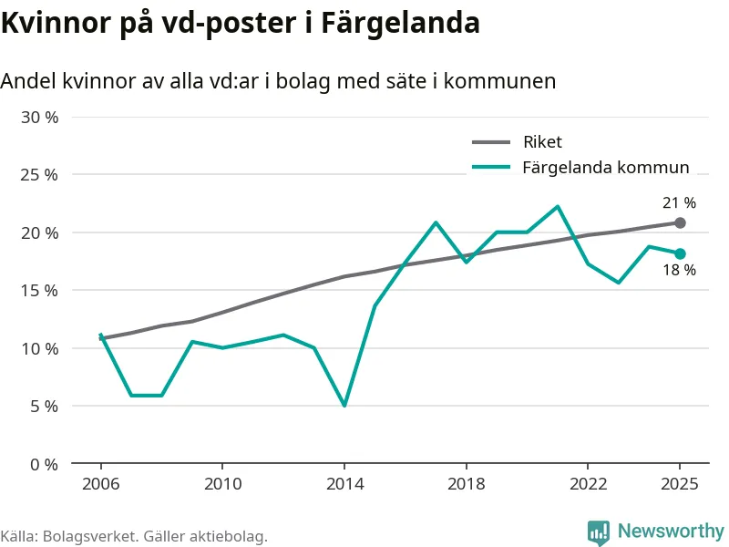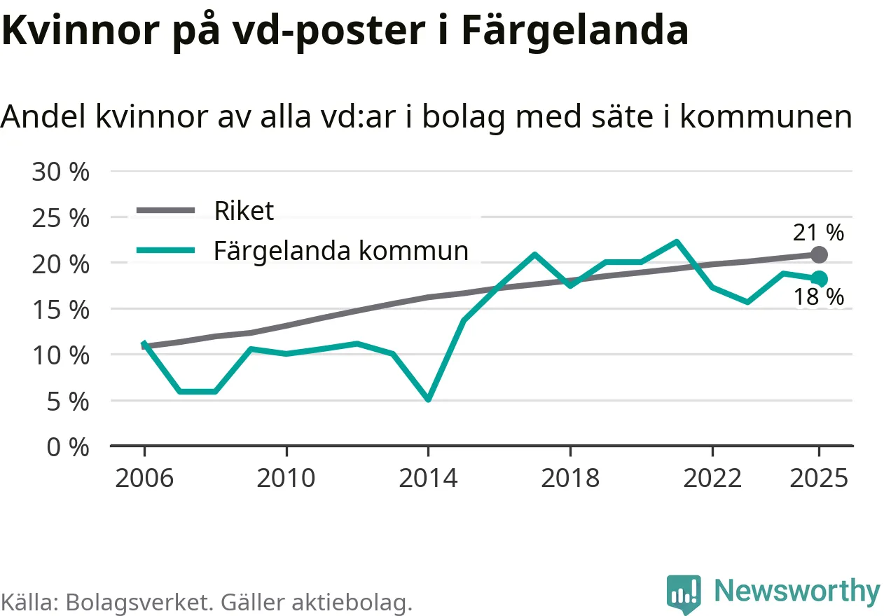 18 procent av aktiebolagen med registrerad vd i Färgelanda hade en kvinna på posten vid årsskiftet. Det innebär att på varje kvinnlig vd går fyra män.