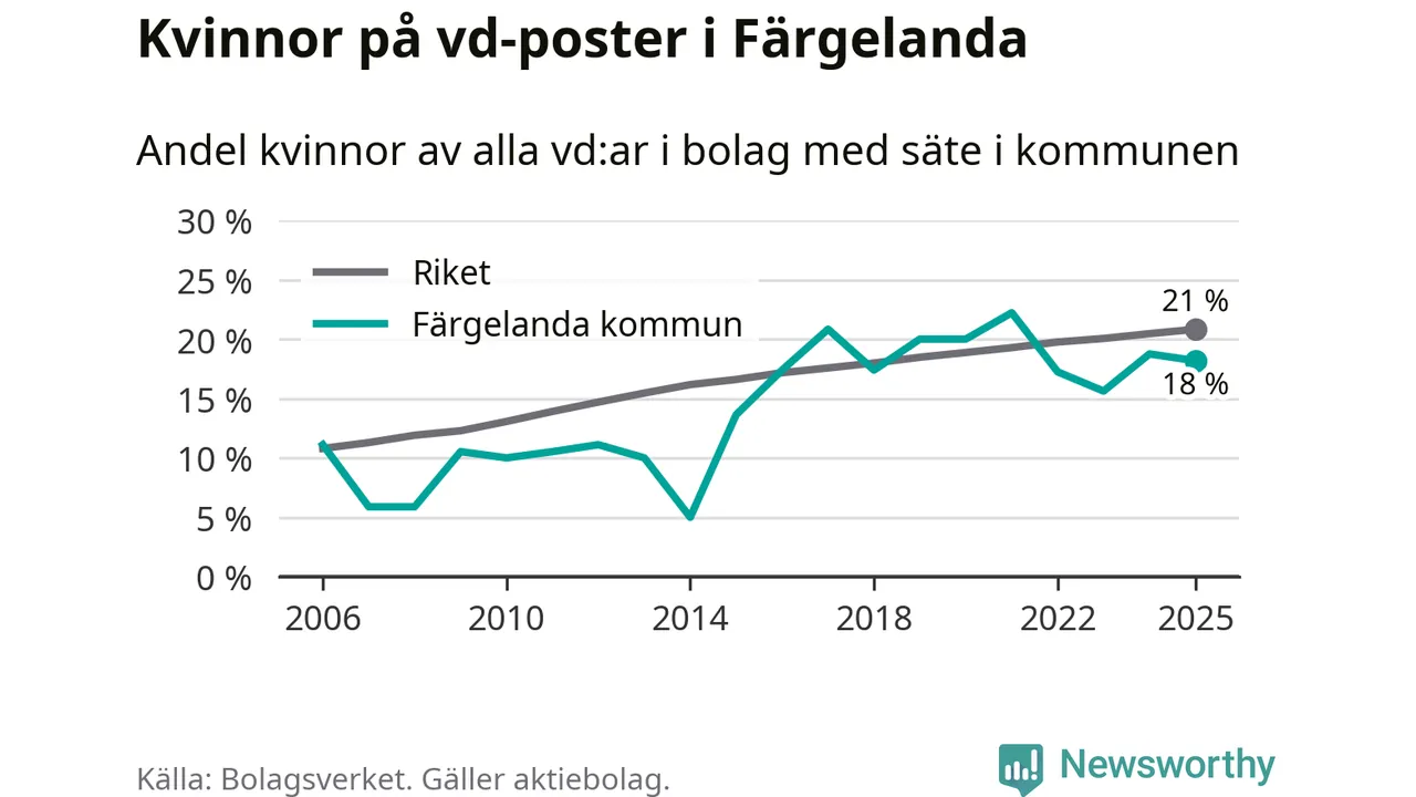 Det är fortfarande män som är vd i nästan fyra av fem bolag i Sverige och i Färgelanda är det alltså en lägre andel kvinnor på vd-posten. Högst andel kvinnliga vd:ar i Västra Götaland har företagen med säte i Dals-Eds kommun, 31 procent. Där rör det sig dock om relativt få företag – 45 stycken totalt – och även små förändringar får stora utslag i andelen kvinnliga vd:ar. Lägst är andelen bland företagen med säte i Munkedals kommun, 9 procent.