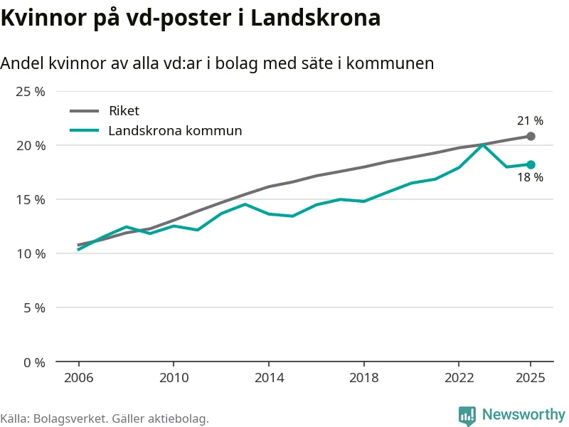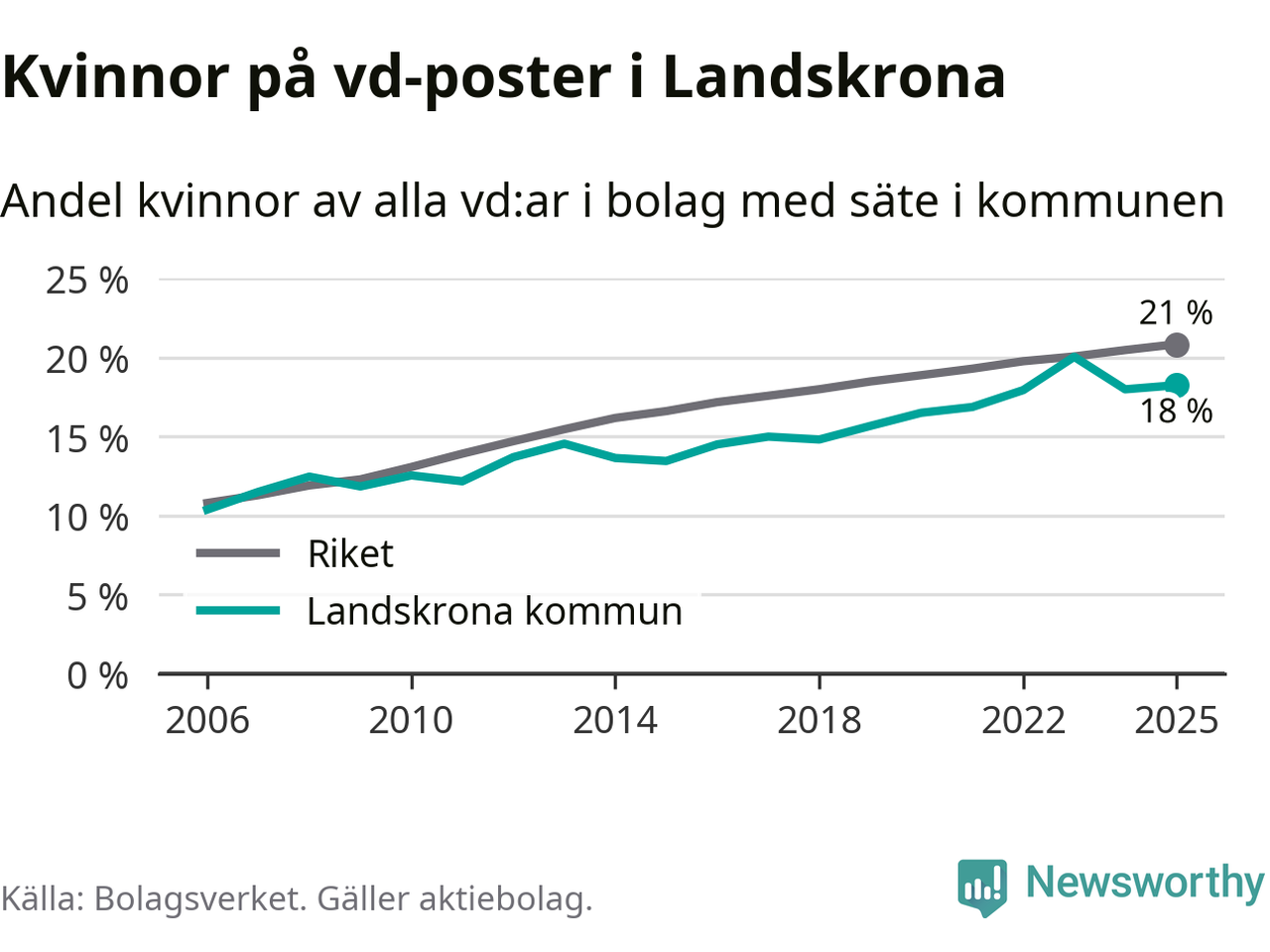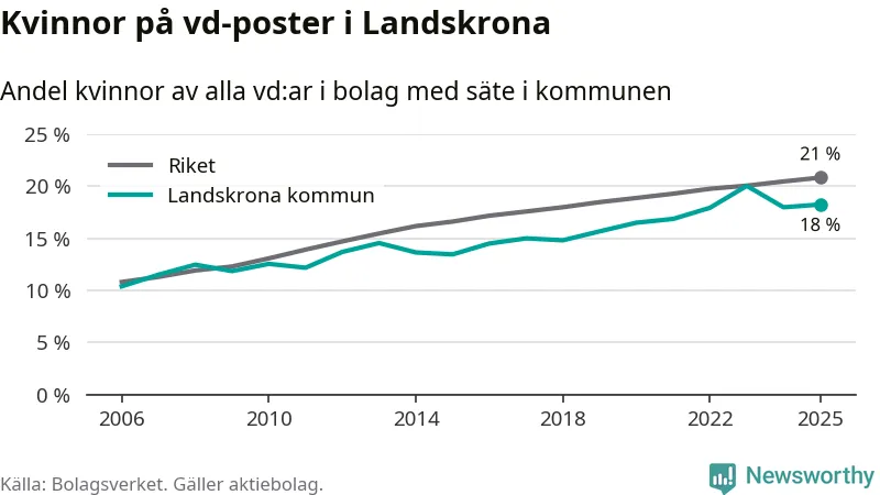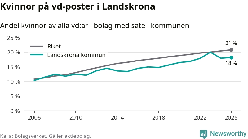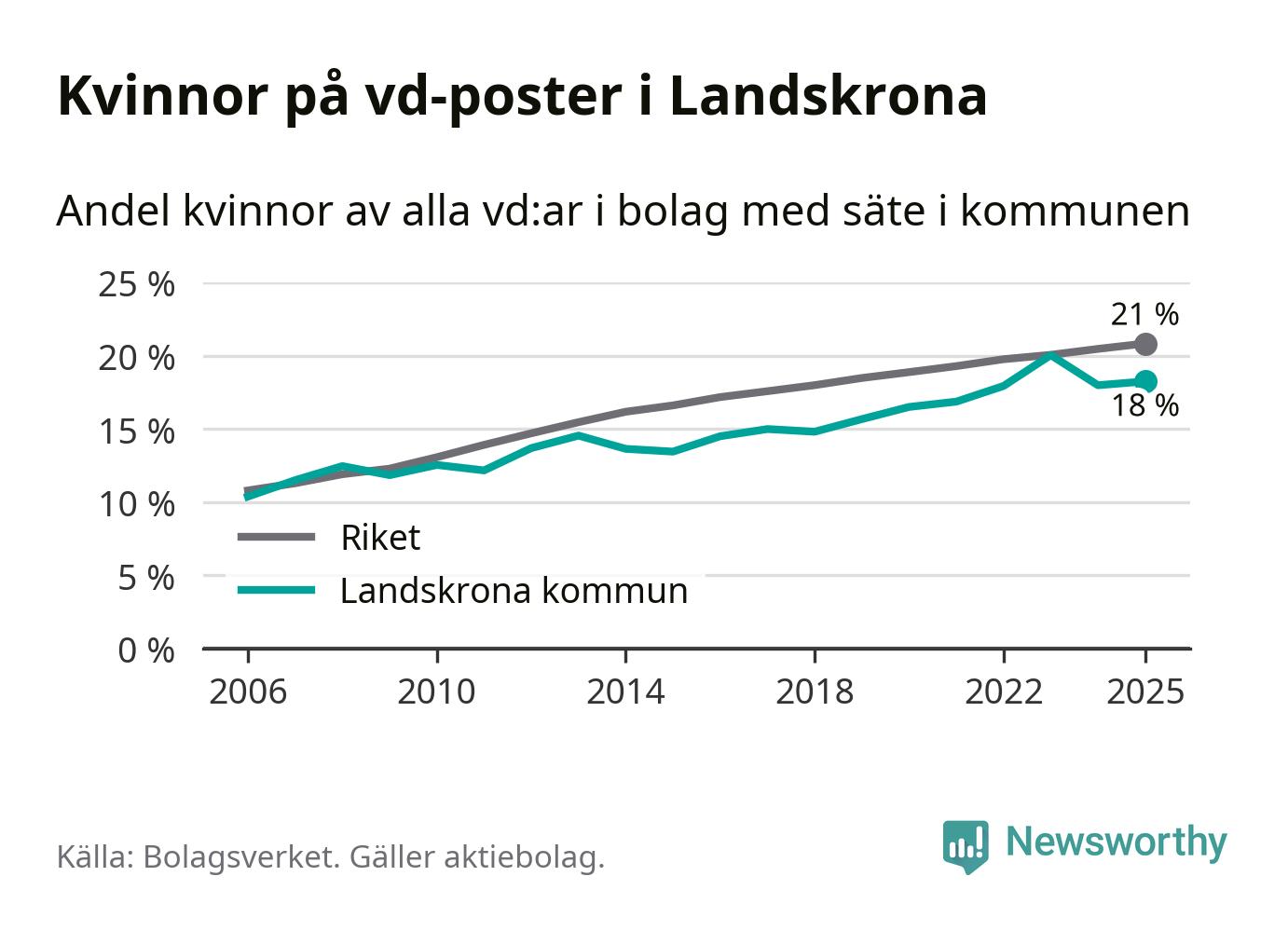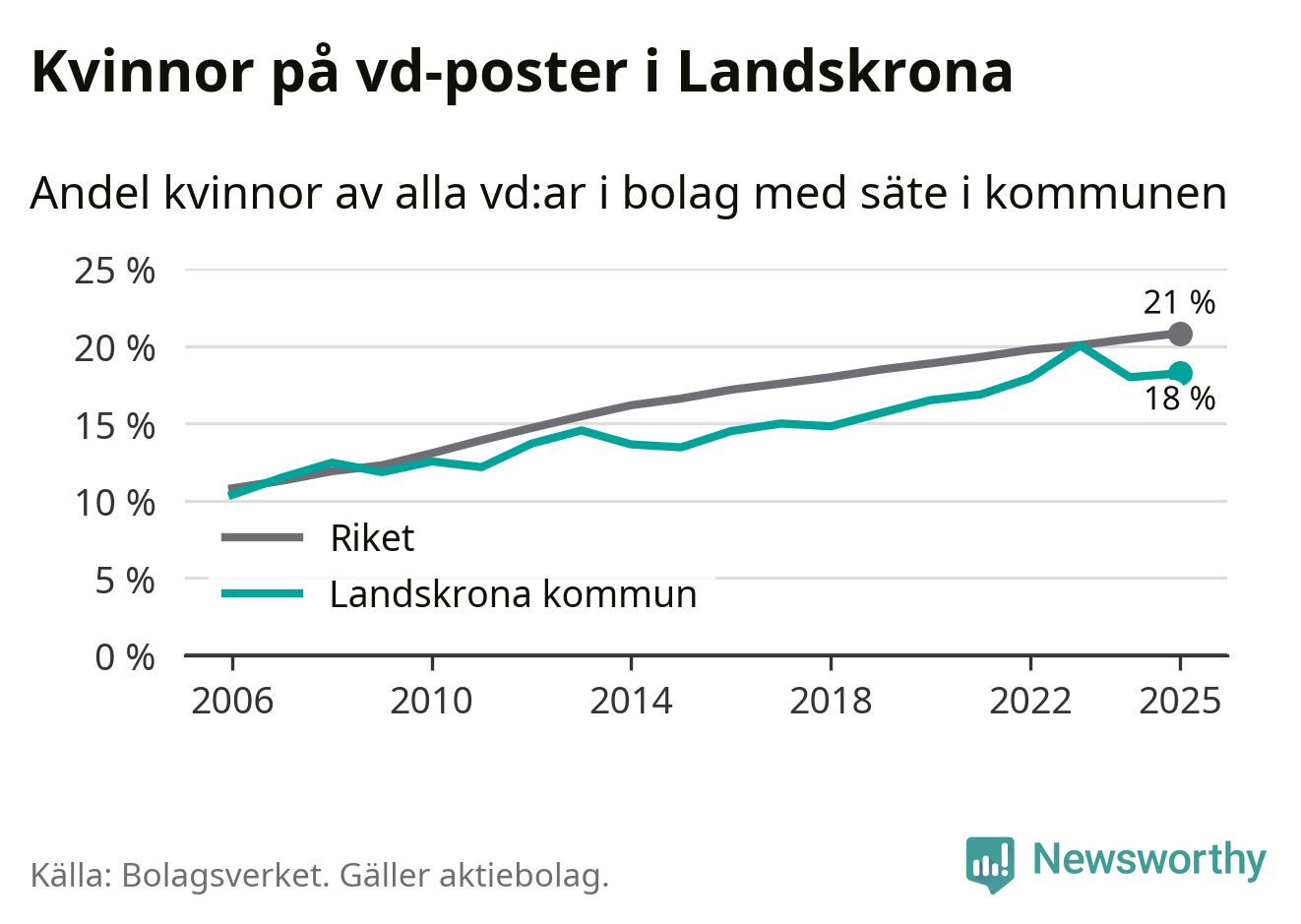 18 procent av aktiebolagen med registrerad vd i Landskrona hade en kvinna på posten vid årsskiftet. Det innebär att på varje kvinnlig vd går fyra män.