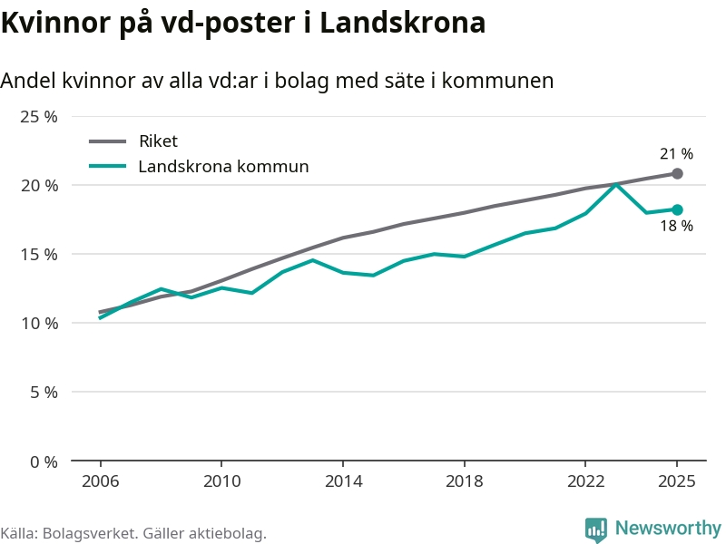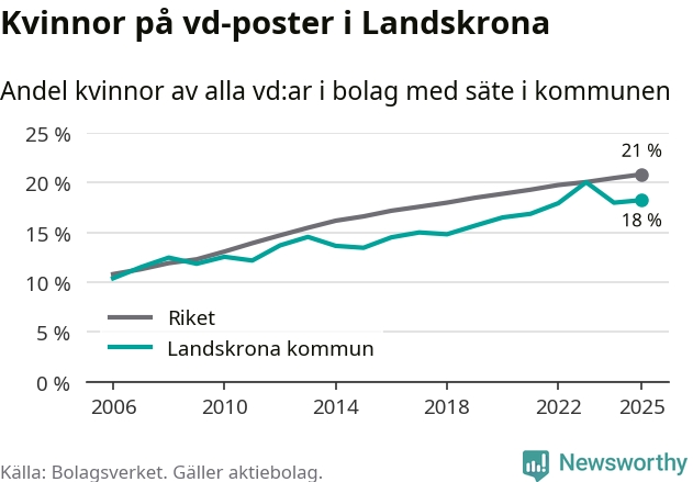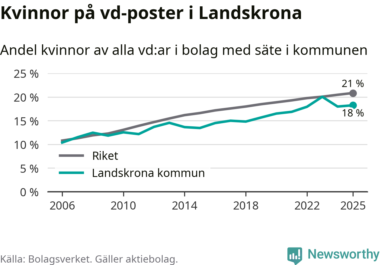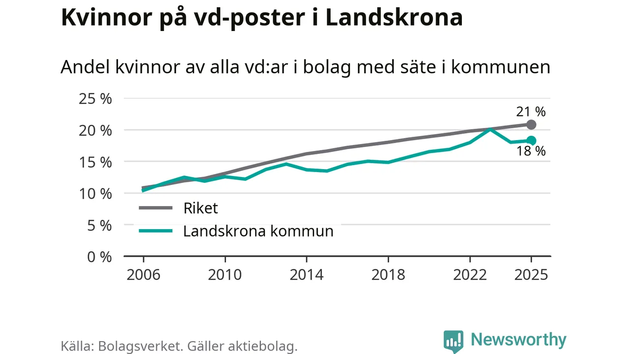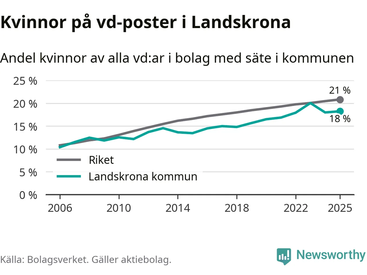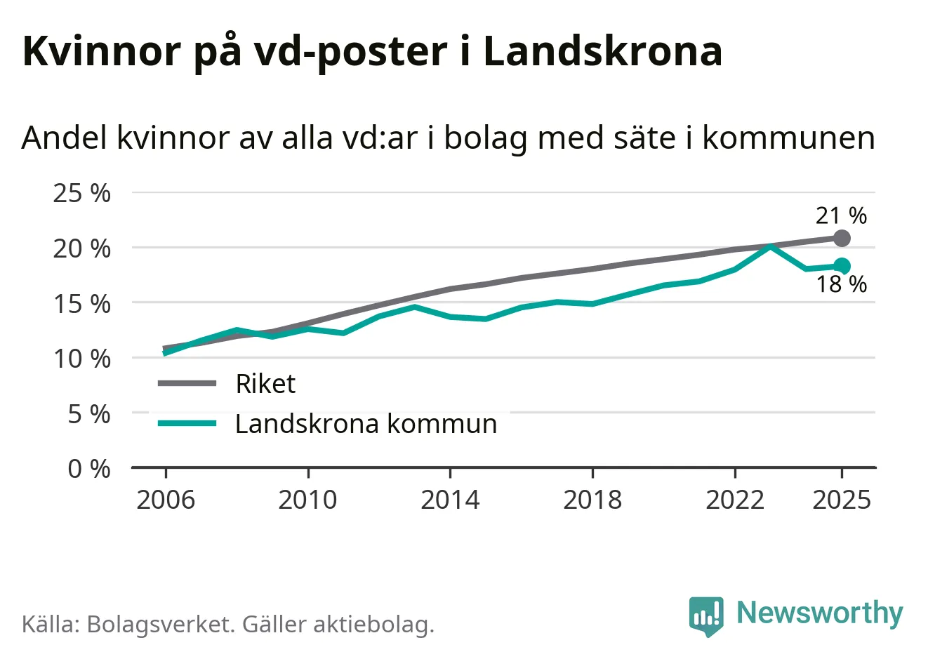 Det är fortfarande män som är vd i nästan fyra av fem bolag i Sverige och i Landskrona är det alltså en lägre andel kvinnor på vd-posten. Högst andel kvinnliga vd:ar i Skåne har företagen med säte i Tomelilla kommun, 30 procent. Lägst är andelen bland företagen med säte i Perstorps kommun, 13 procent. I Perstorp rör det sig om 62 företag totalt och även små förändringar får stora utslag i andelen kvinnliga vd:ar.