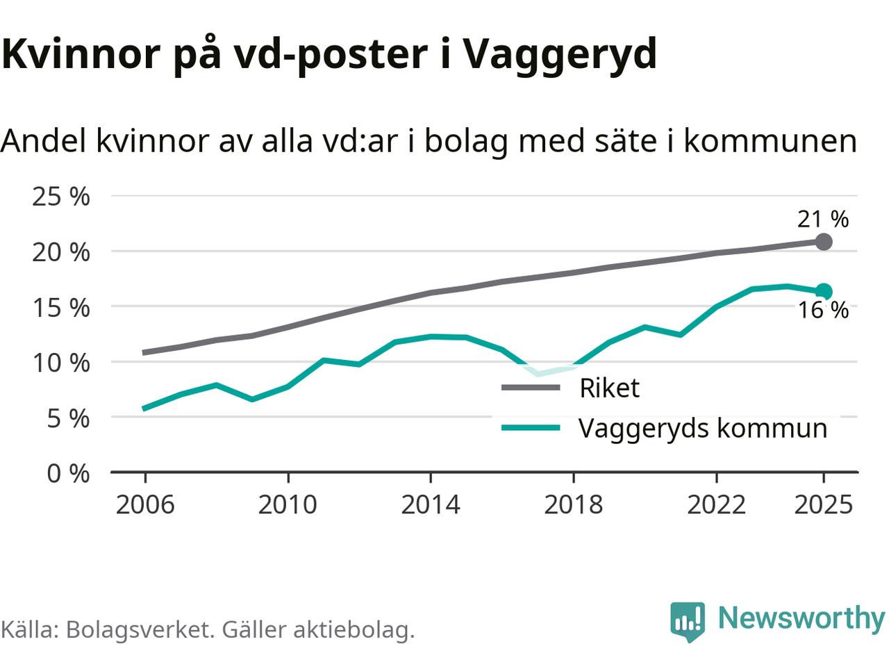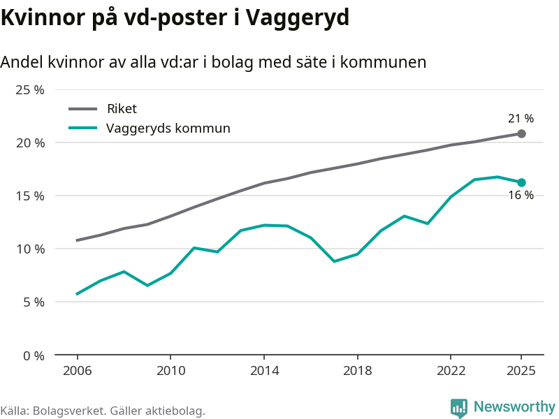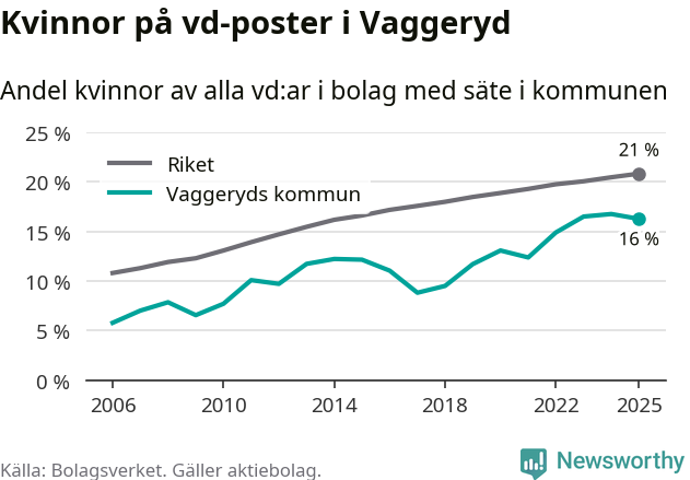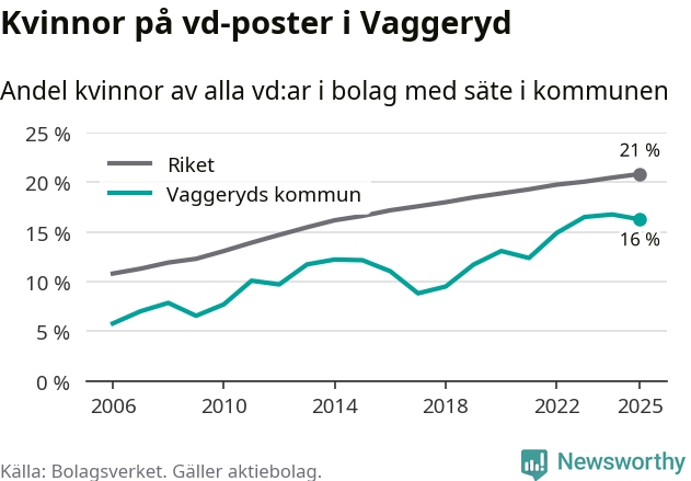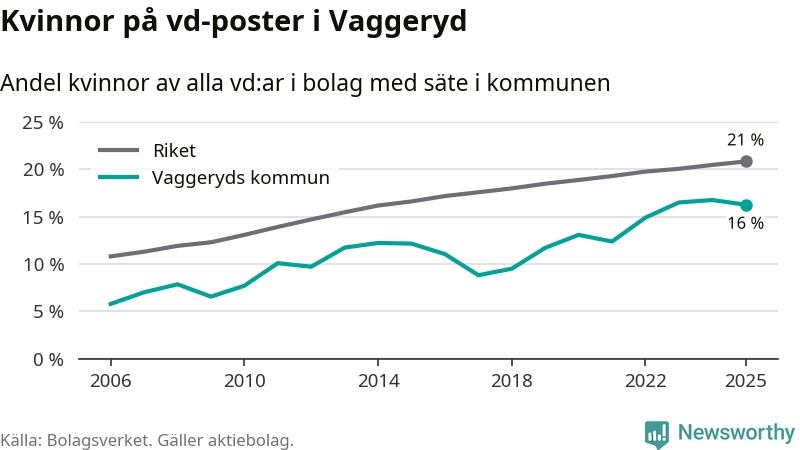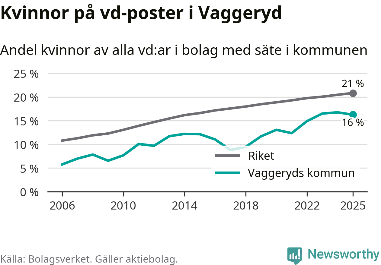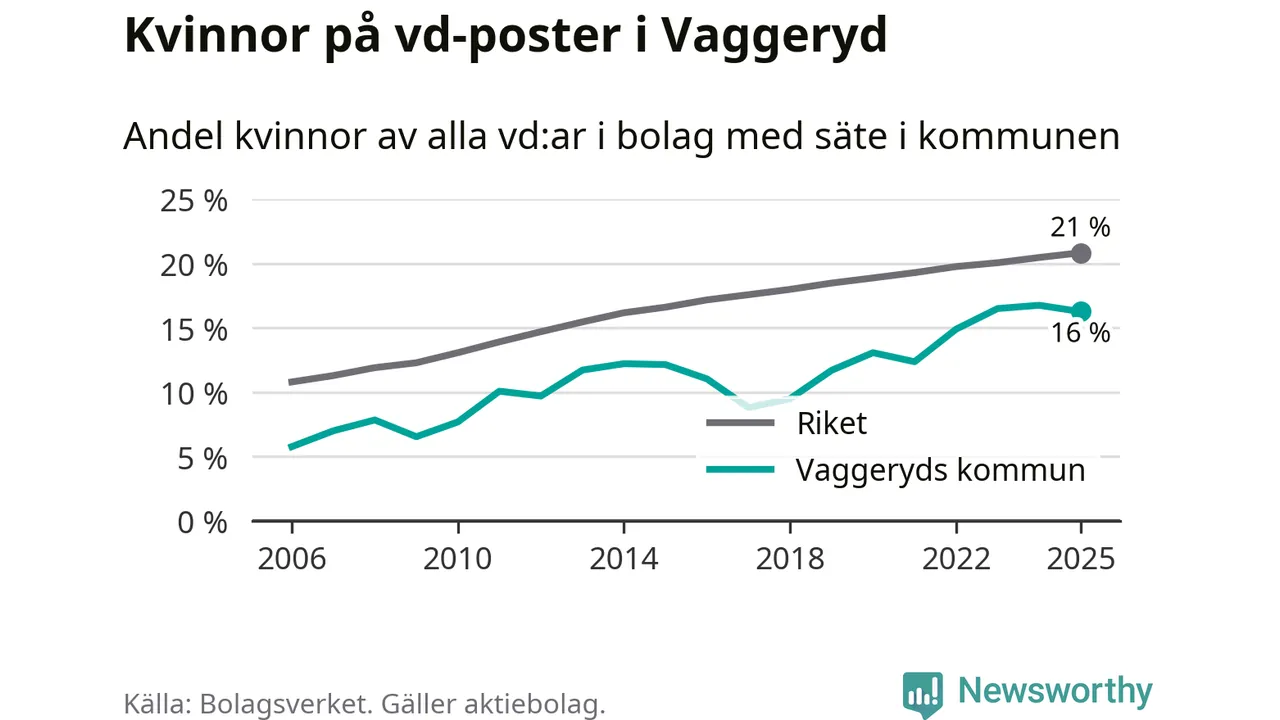 16 procent av aktiebolagen med registrerad vd i Vaggeryd hade en kvinna på posten vid årsskiftet. Det innebär att på varje kvinnlig vd går fem män.
