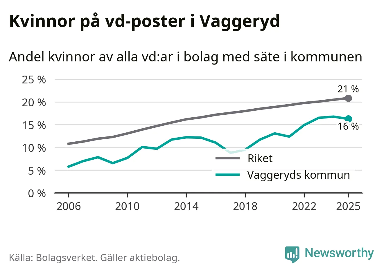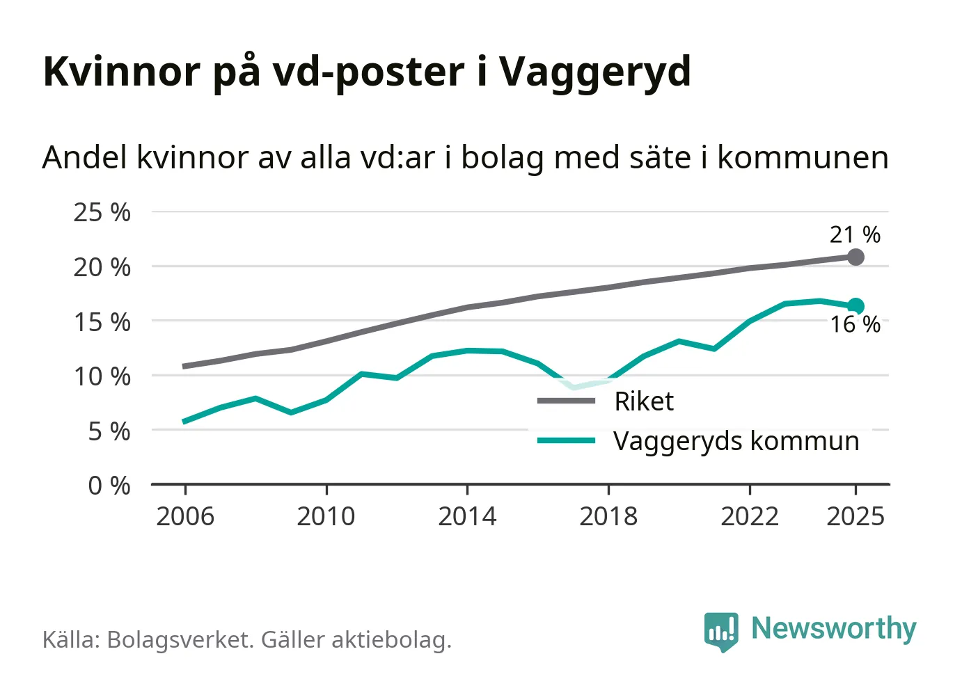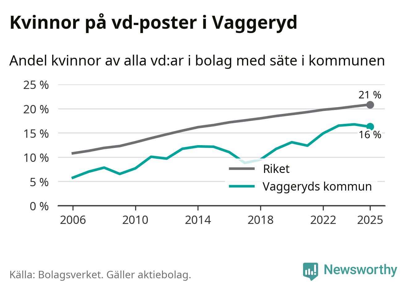 16 procent av aktiebolagen med registrerad vd i Vaggeryd hade en kvinna på posten vid årsskiftet. Det innebär att på varje kvinnlig vd går fem män.