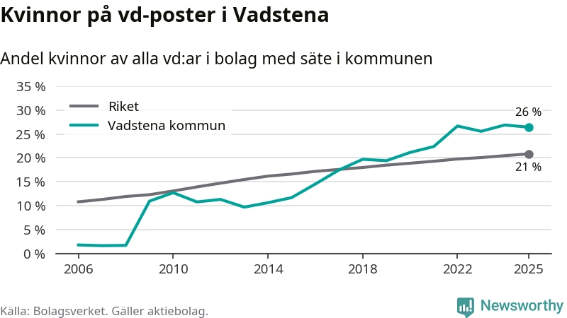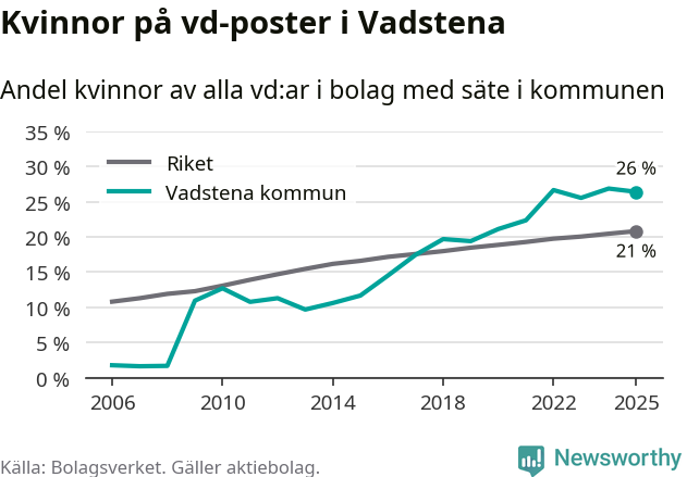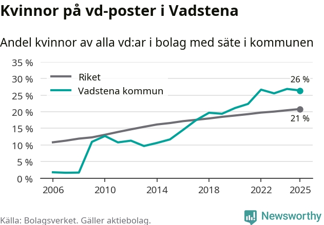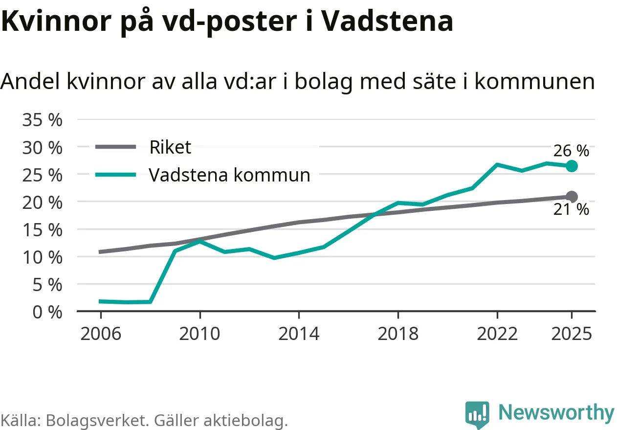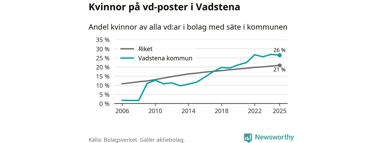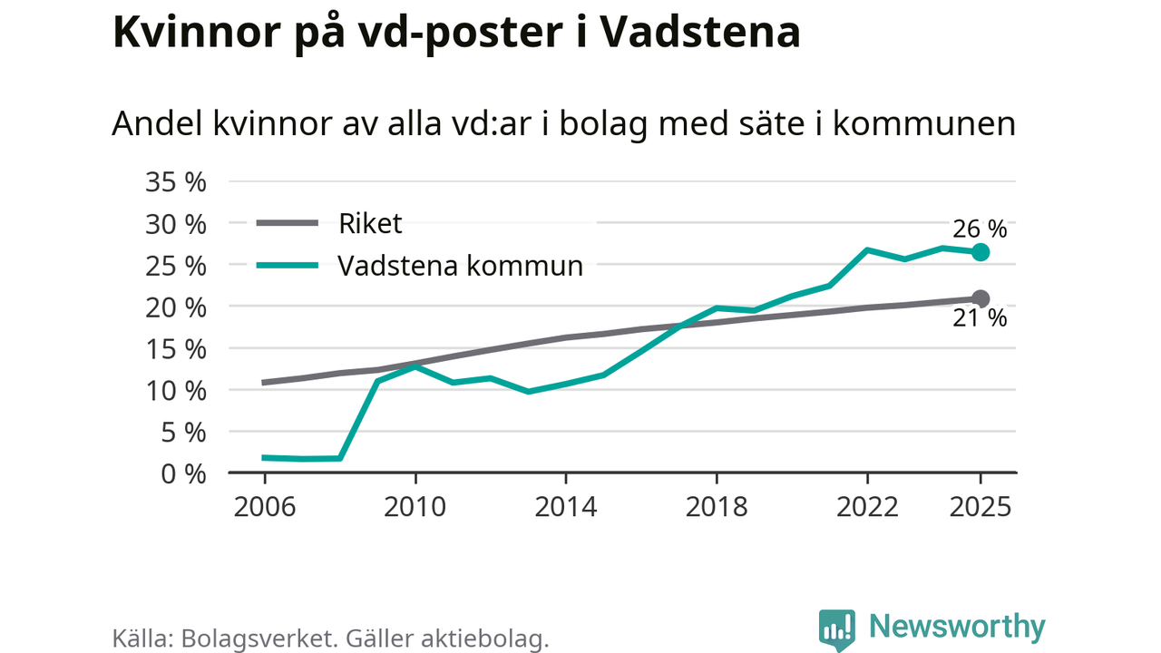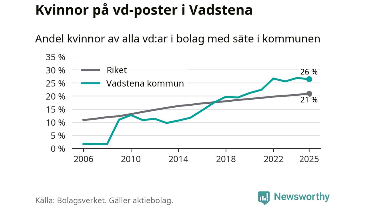 Det är fortfarande män som är vd i nästan fyra av fem bolag i Sverige, men i Vadstena är det alltså en högre andel kvinnor på vd-posten. 26 procent är den högsta andelen av kommunerna i Östergötland. Lägsta andelen kvinnor i länet har företagen med säte i Boxholms kommun, 13 procent.