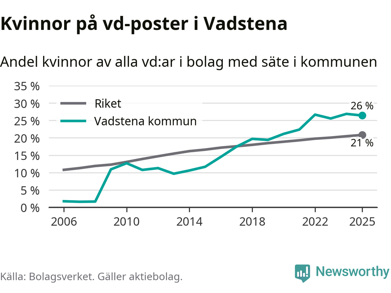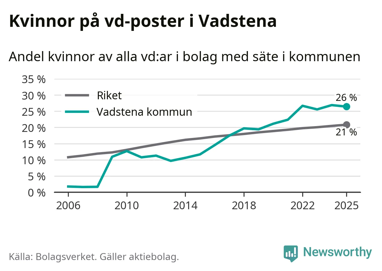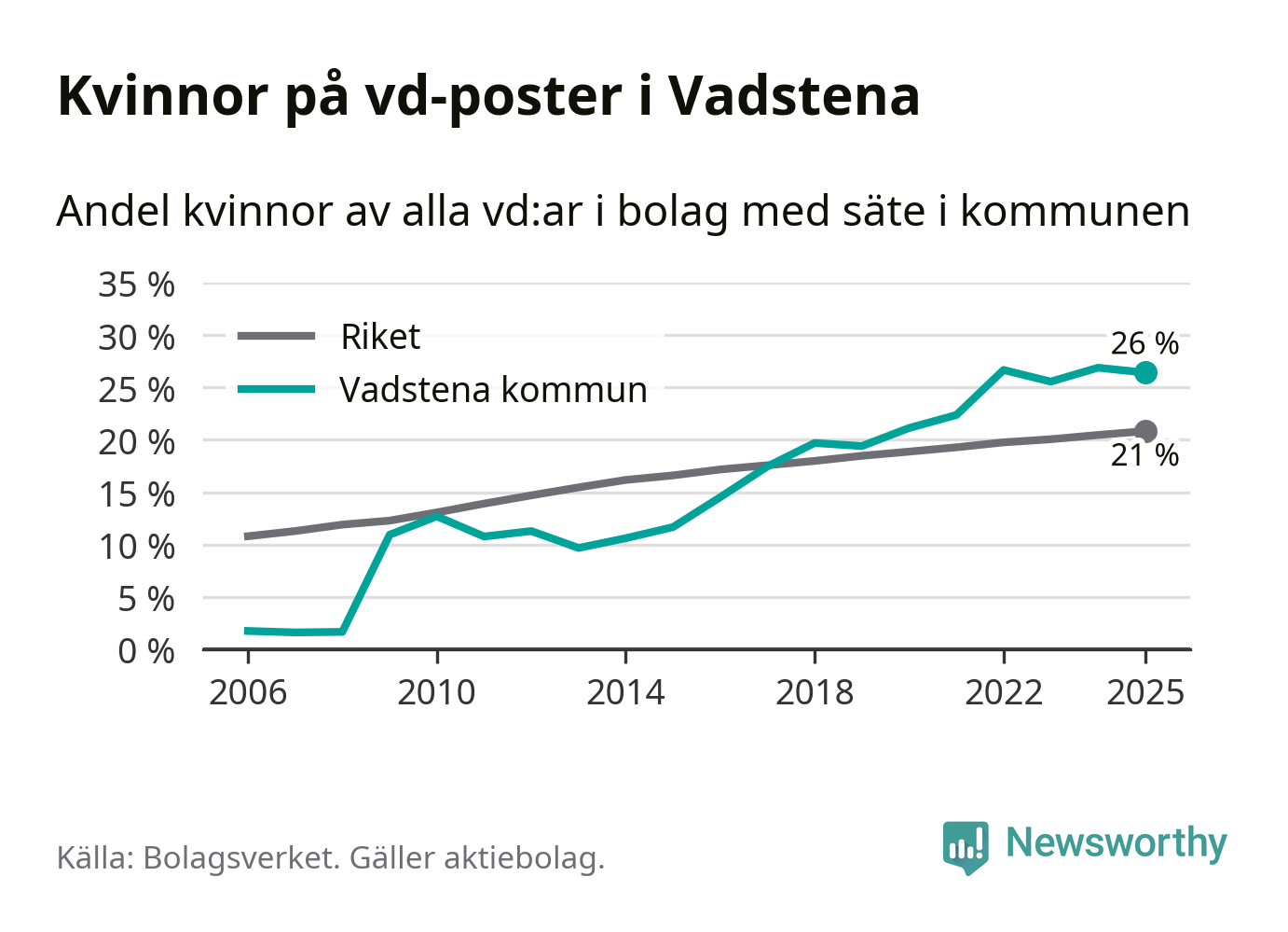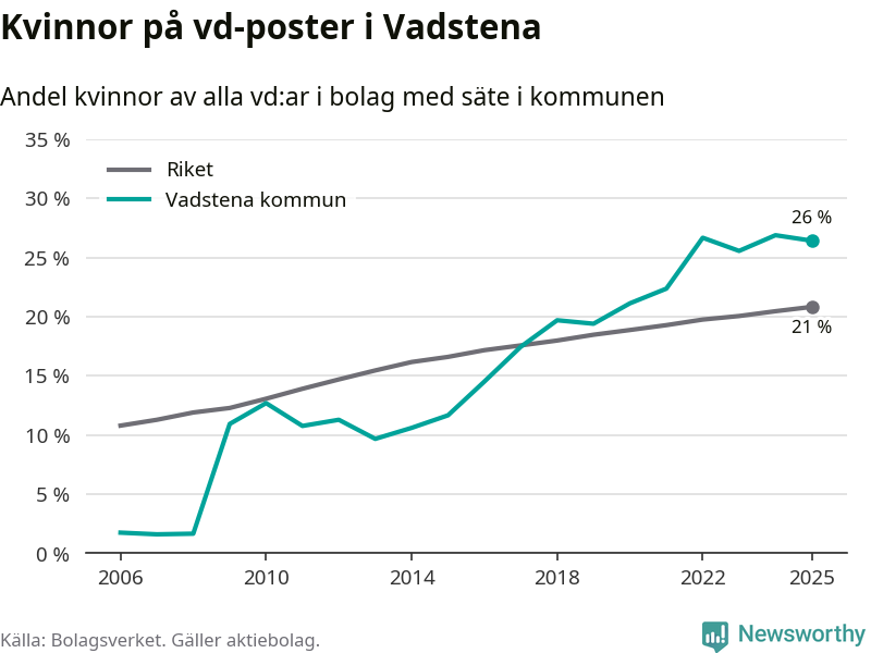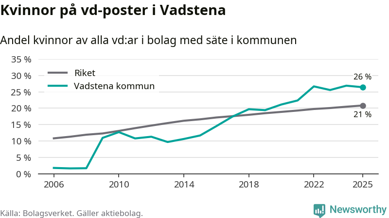 Det är fortfarande män som är vd i nästan fyra av fem bolag i Sverige, men i Vadstena är det alltså en högre andel kvinnor på vd-posten. 26 procent är den högsta andelen av kommunerna i Östergötland. Lägsta andelen kvinnor i länet har företagen med säte i Boxholms kommun, 13 procent.