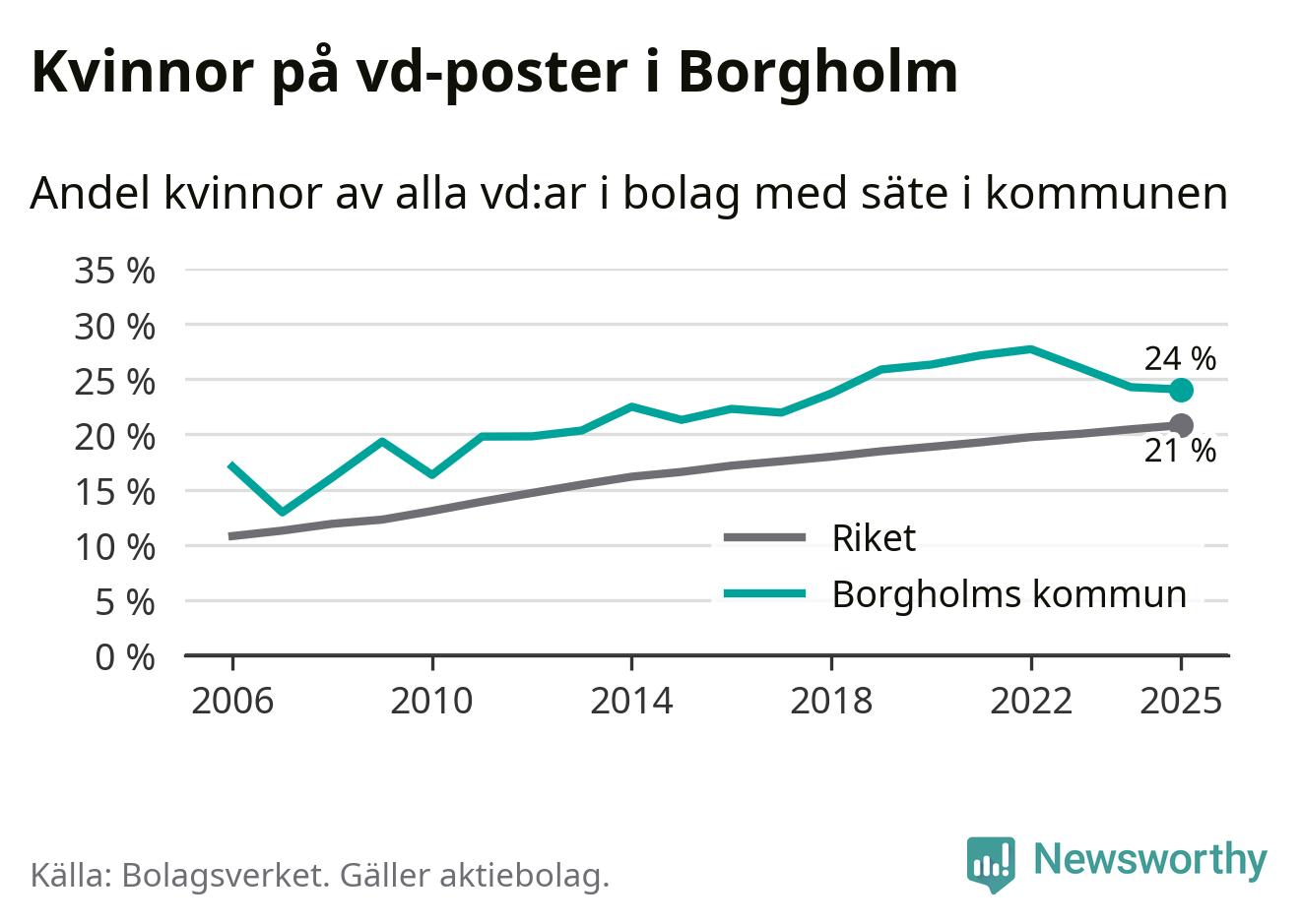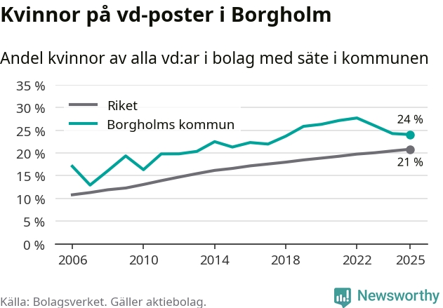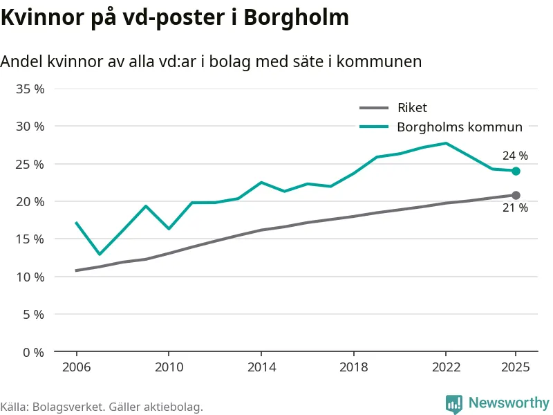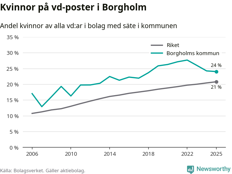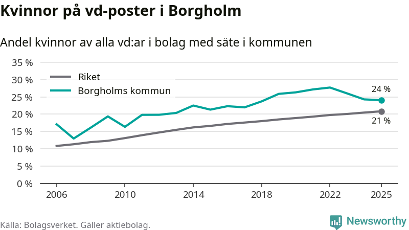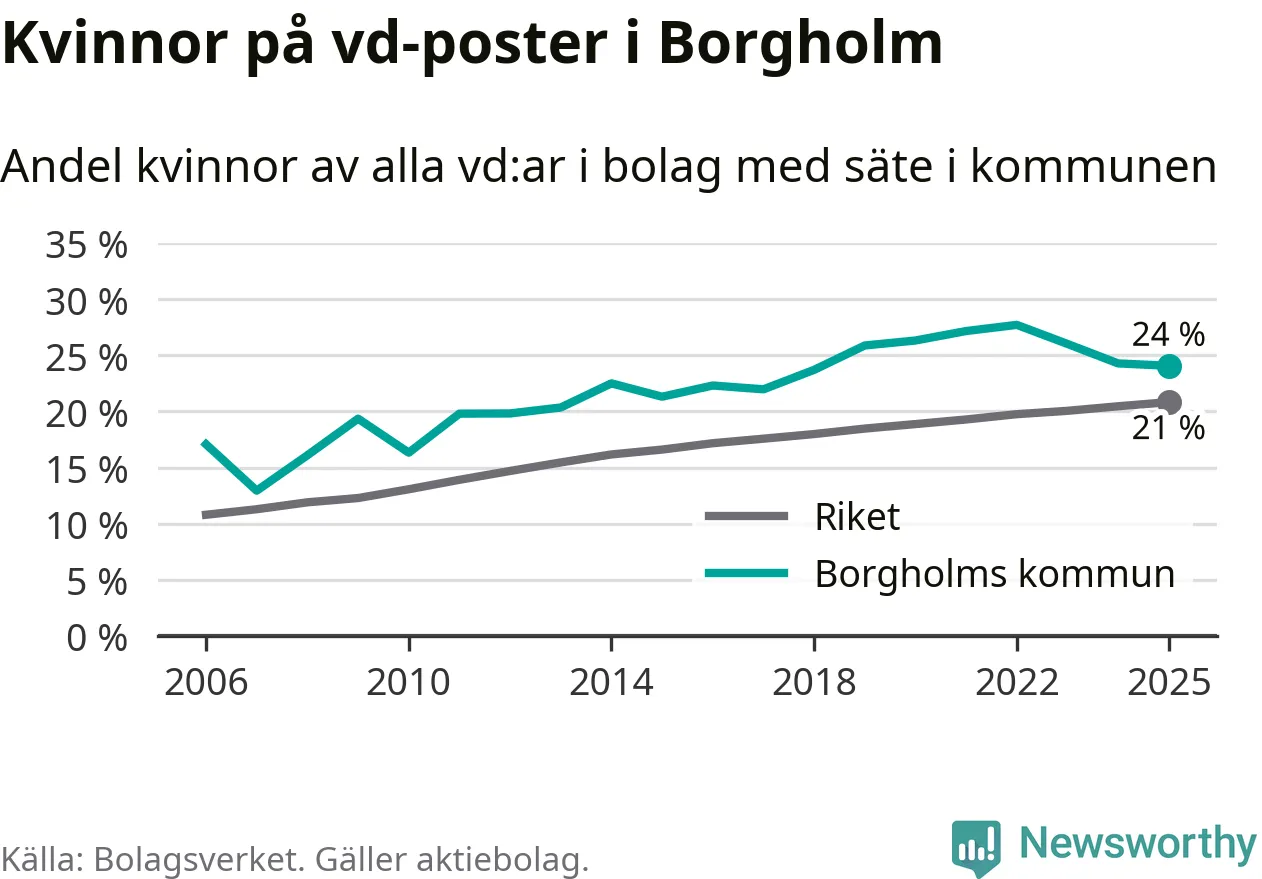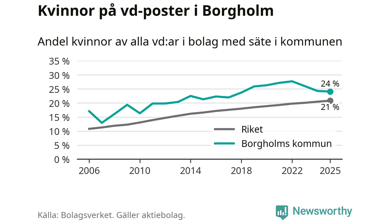 24 procent av aktiebolagen med registrerad vd i Borgholm hade en kvinna på posten vid årsskiftet. Det innebär att på varje kvinnlig vd går tre män.