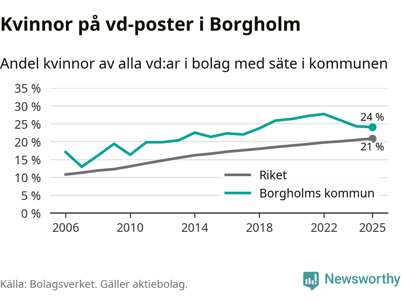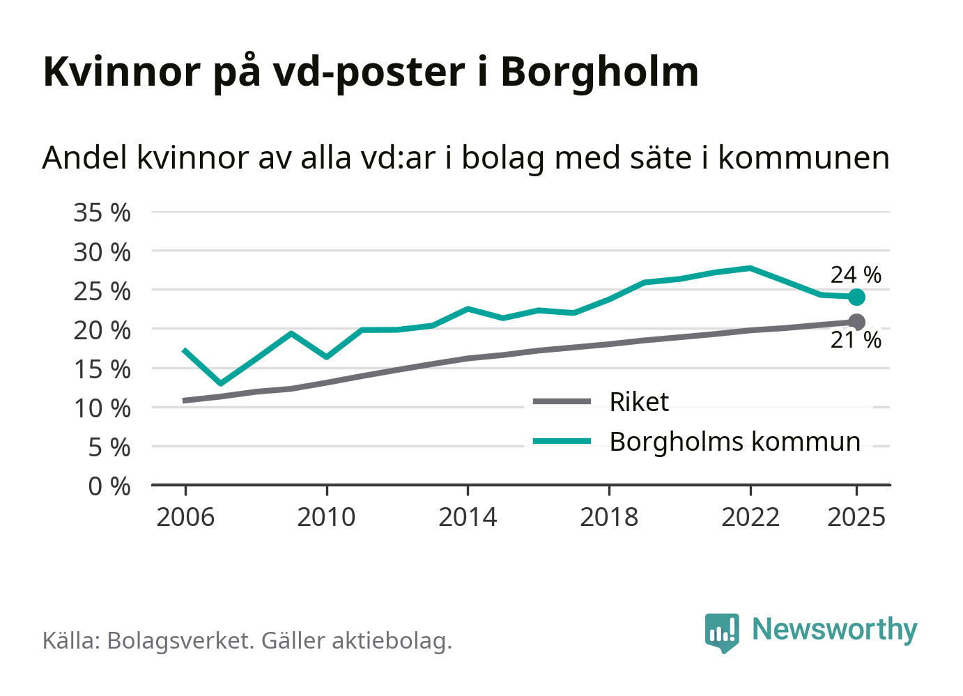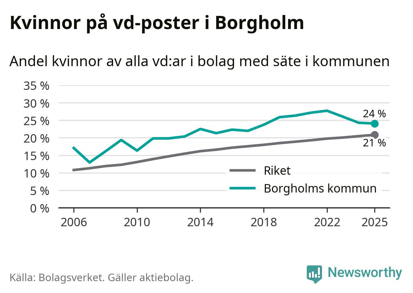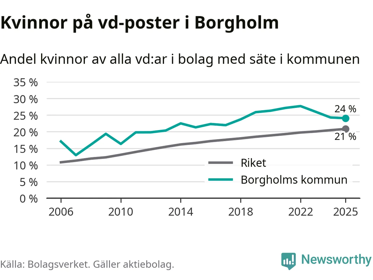 24 procent av aktiebolagen med registrerad vd i Borgholm hade en kvinna på posten vid årsskiftet. Det innebär att på varje kvinnlig vd går tre män.