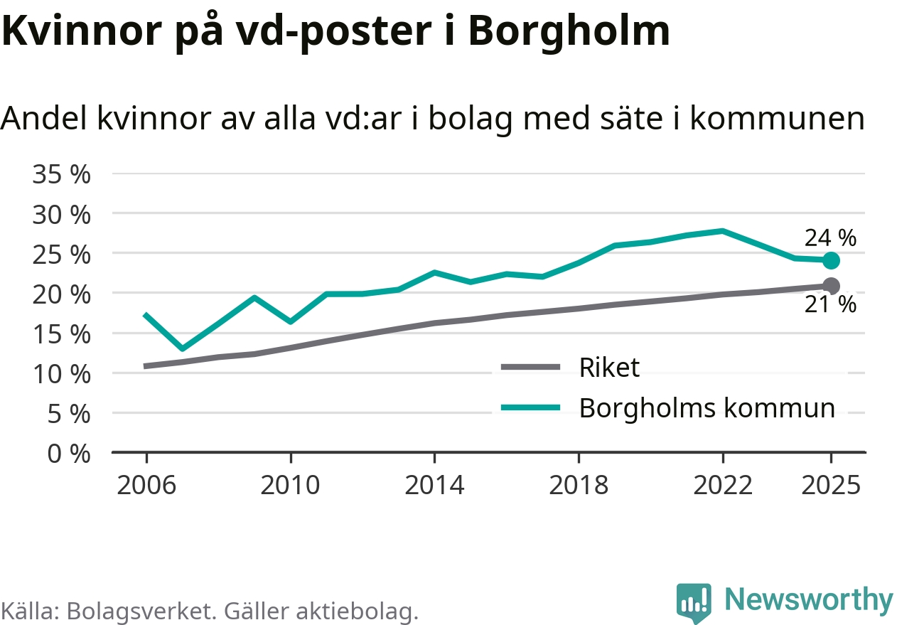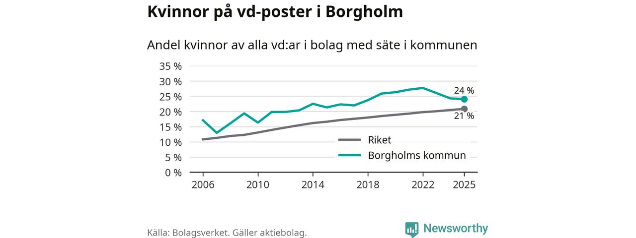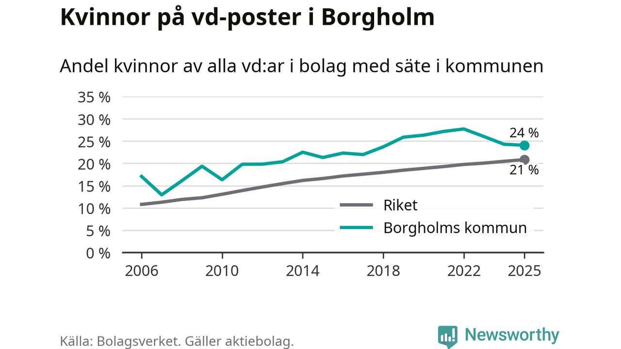 Det är fortfarande män som är vd i nästan fyra av fem bolag i Sverige, men i Borgholm är det alltså en högre andel kvinnor på vd-posten. 24 procent är den högsta andelen av kommunerna i Kalmar län. Lägsta andelen kvinnor i länet har företagen med säte i Hultsfreds kommun, 13 procent.
