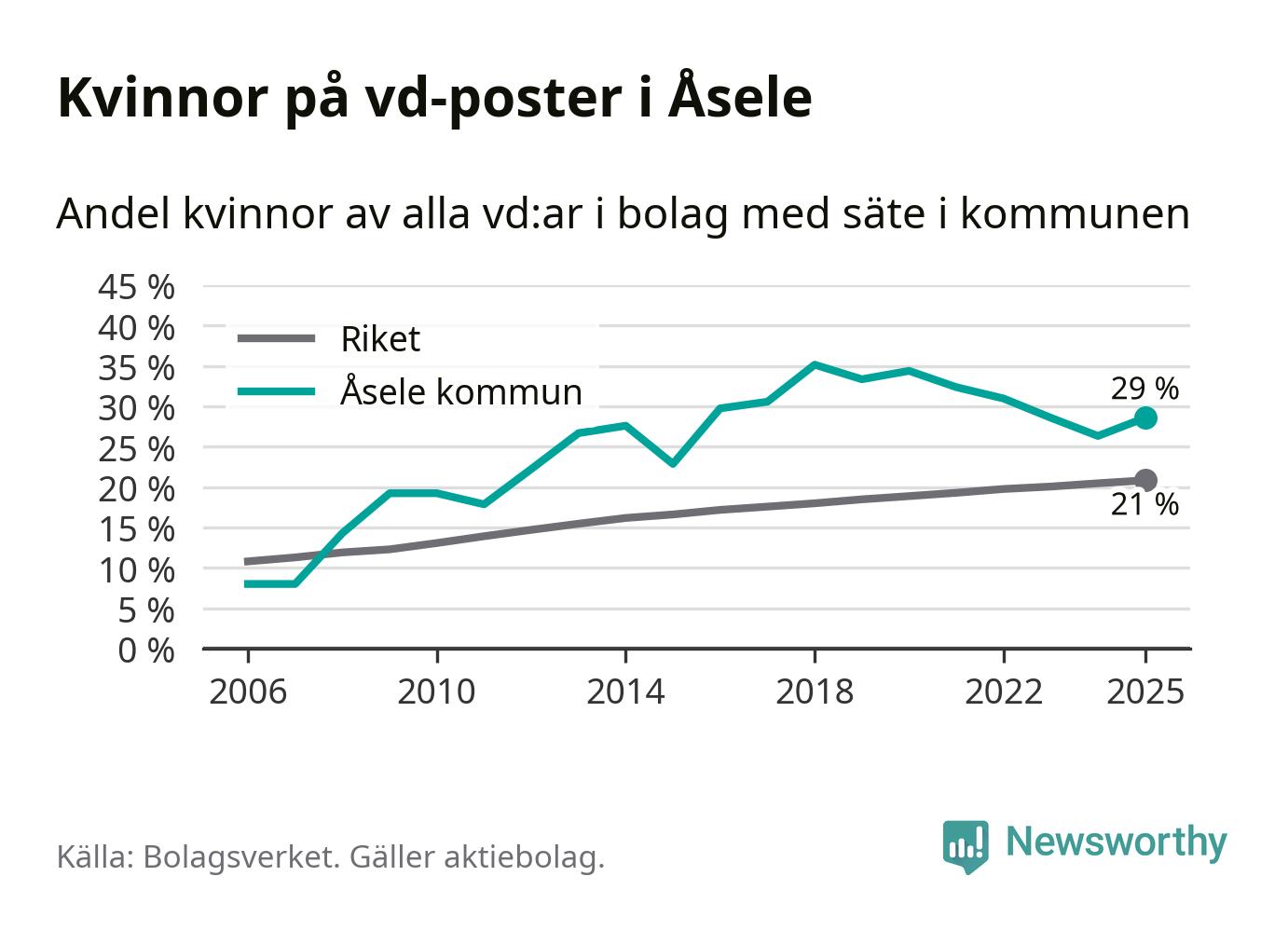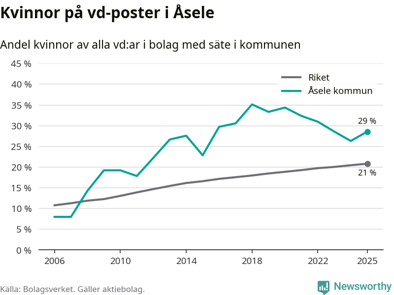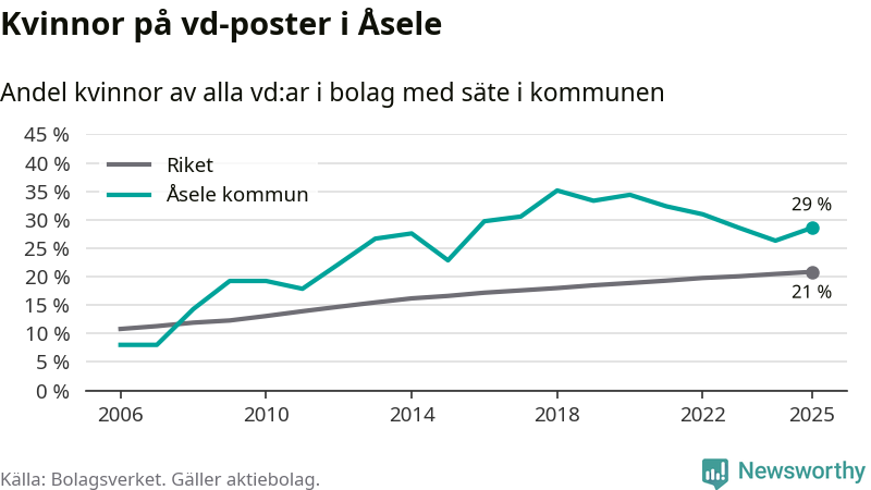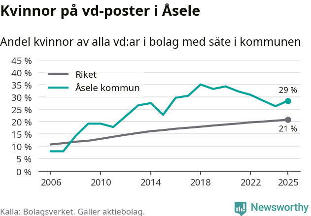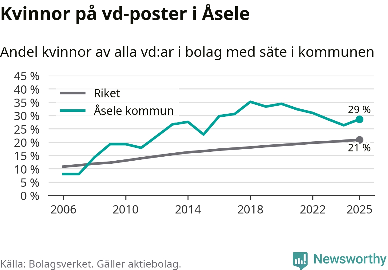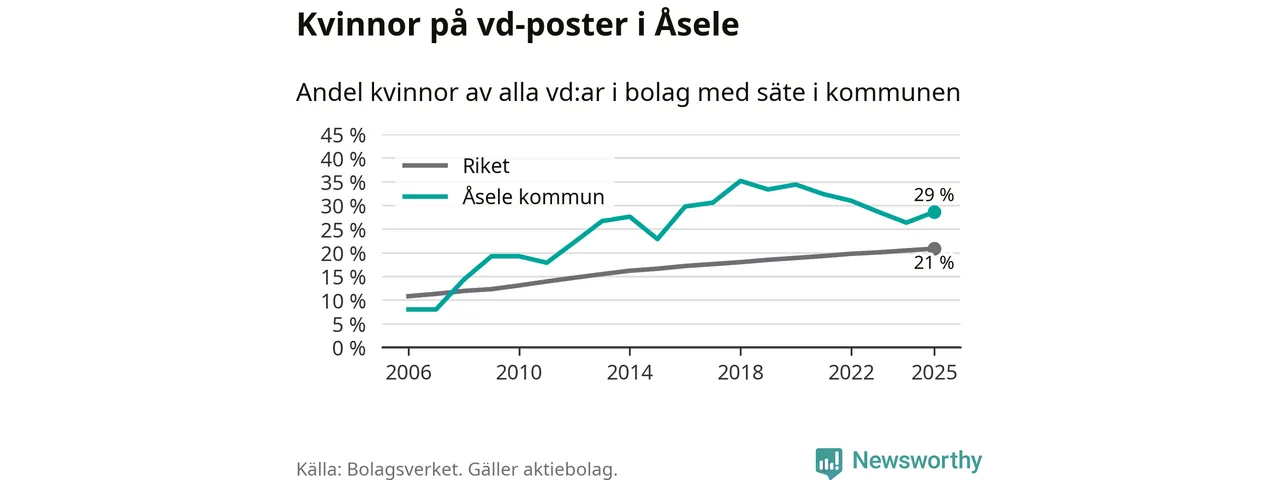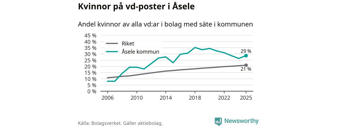 Det är fortfarande män som är vd i nästan fyra av fem bolag i Sverige, men i Åsele är det alltså en högre andel kvinnor på vd-posten. 29 procent är den näst högsta andelen av kommunerna i Västerbotten. Högst andel kvinnliga vd:ar i Västerbotten har företagen med säte i Storumans kommun, 29 procent. Lägst är andelen bland företagen med säte i Dorotea kommun, 12 procent. I Dorotea rör det sig om 43 företag totalt och även små förändringar får stora utslag i andelen kvinnliga vd:ar.