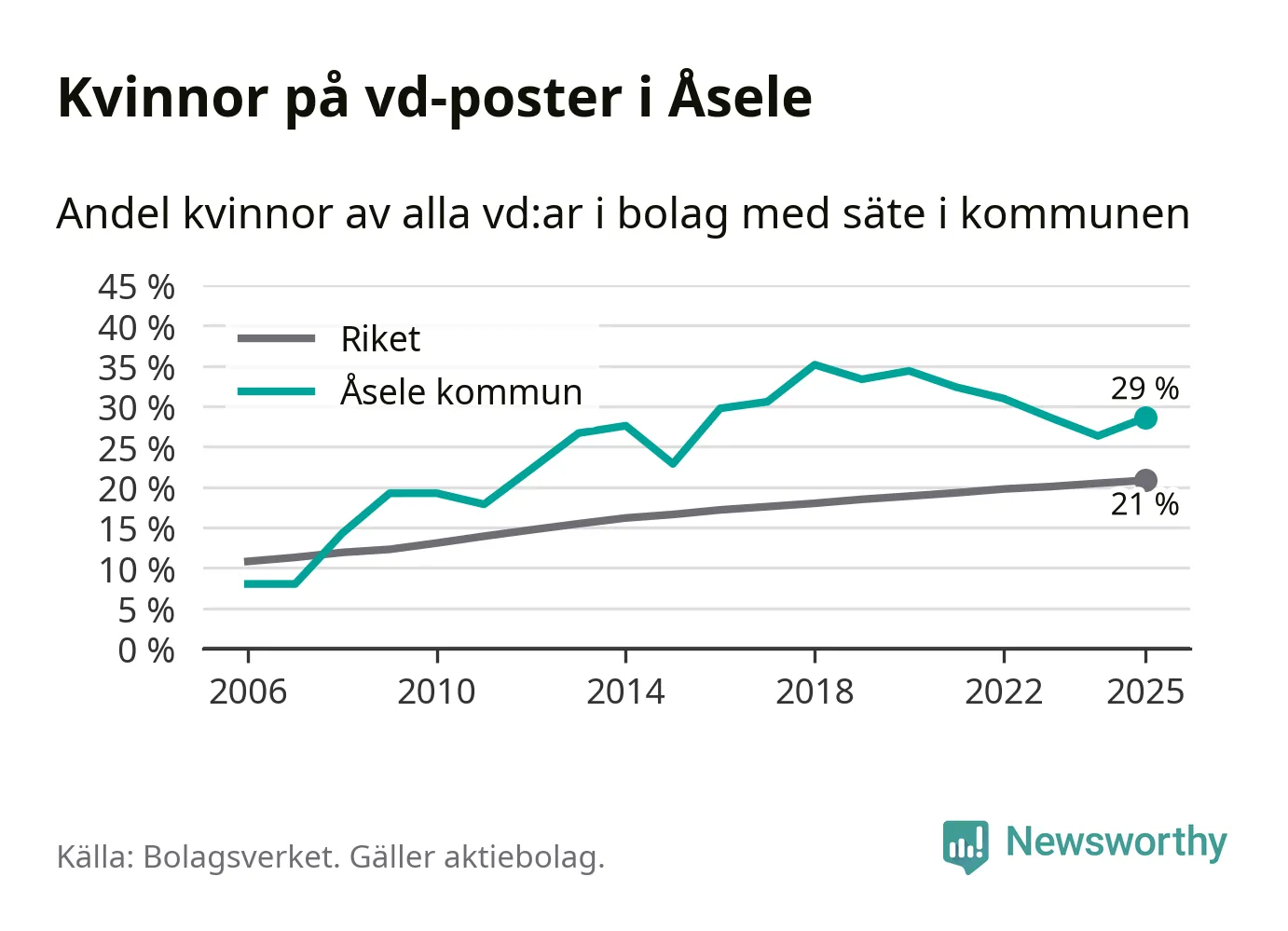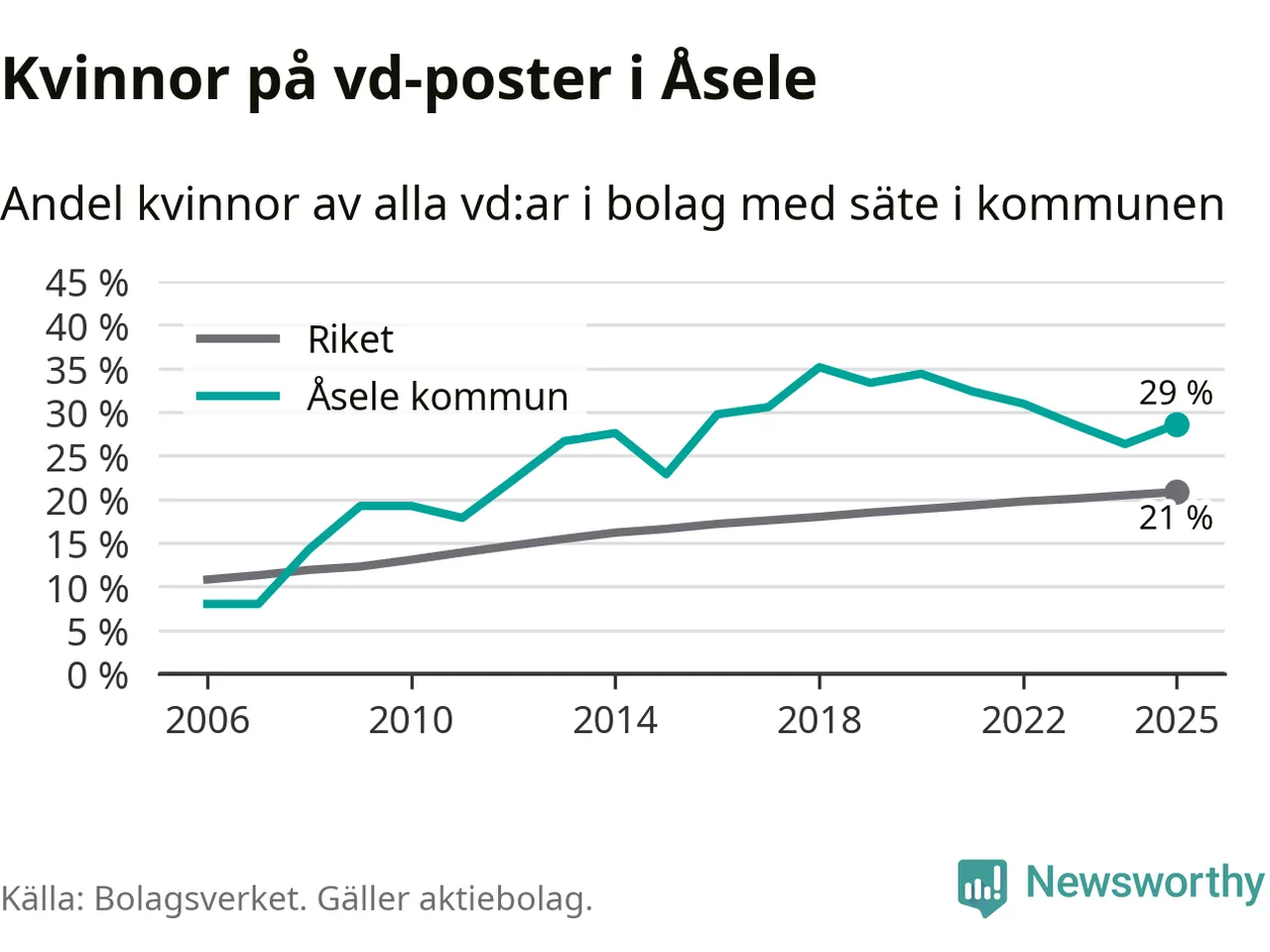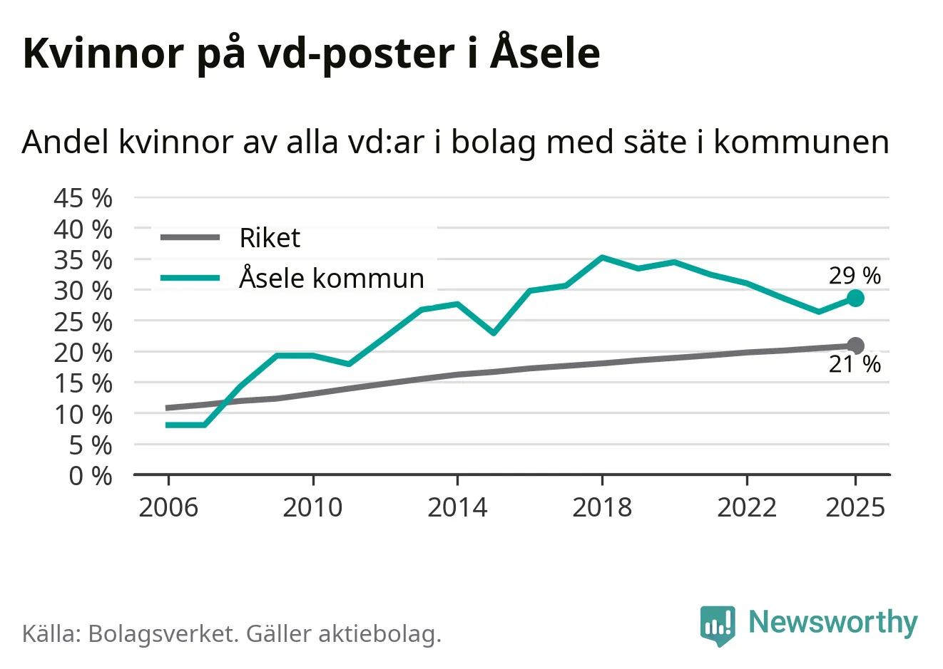 Det är fortfarande män som är vd i nästan fyra av fem bolag i Sverige, men i Åsele är det alltså en högre andel kvinnor på vd-posten. 29 procent är den näst högsta andelen av kommunerna i Västerbotten. Högst andel kvinnliga vd:ar i Västerbotten har företagen med säte i Storumans kommun, 29 procent. Lägst är andelen bland företagen med säte i Dorotea kommun, 12 procent. I Dorotea rör det sig om 43 företag totalt och även små förändringar får stora utslag i andelen kvinnliga vd:ar.
