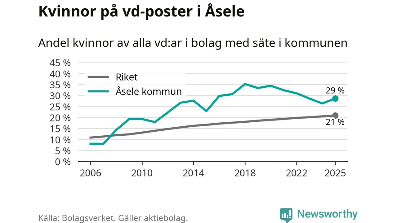 29 procent av aktiebolagen med registrerad vd i Åsele hade en kvinna på posten vid årsskiftet. Det innebär att på varje kvinnlig vd går knappt tre män.