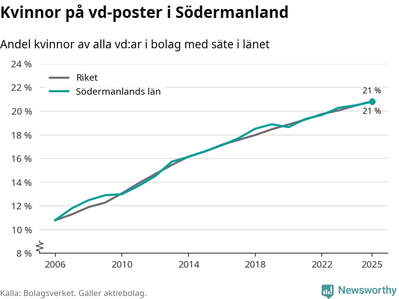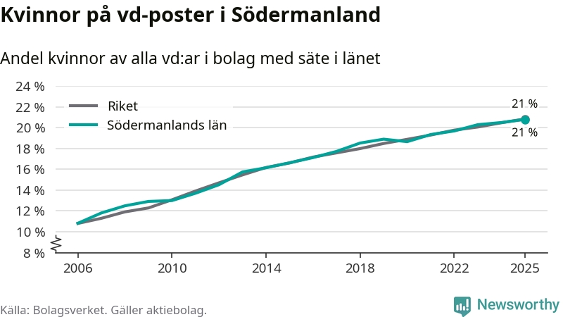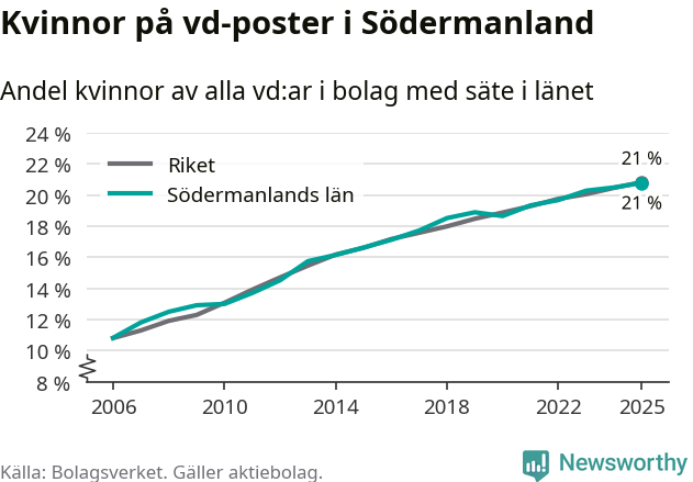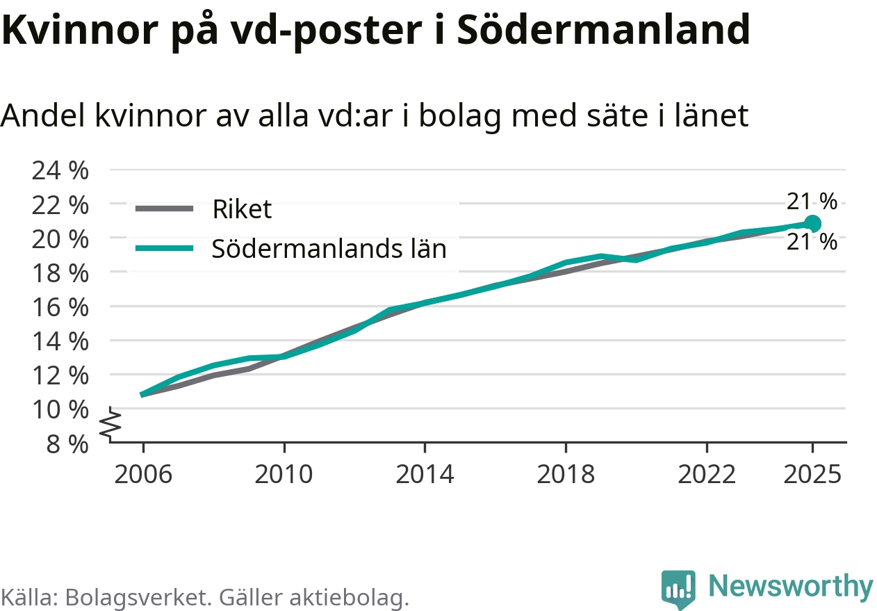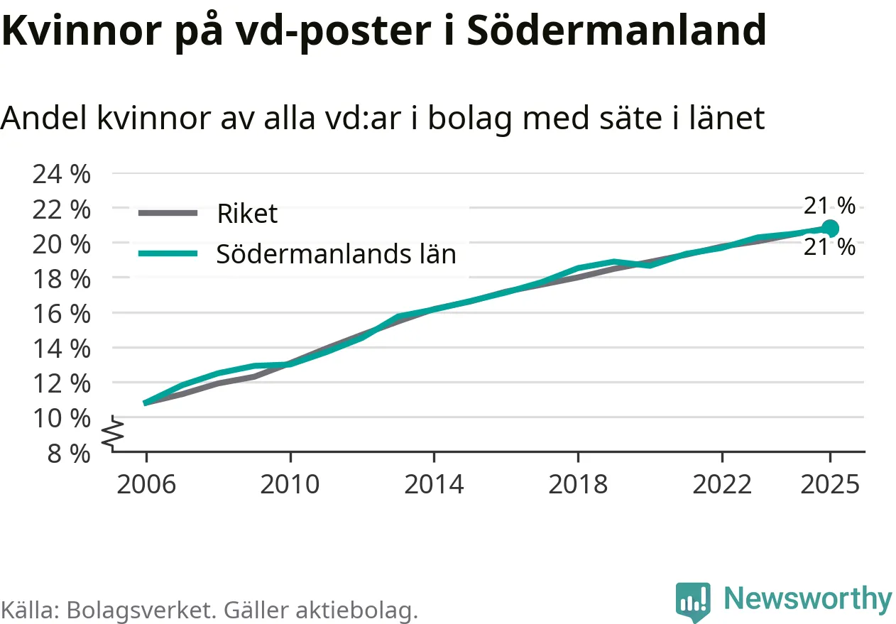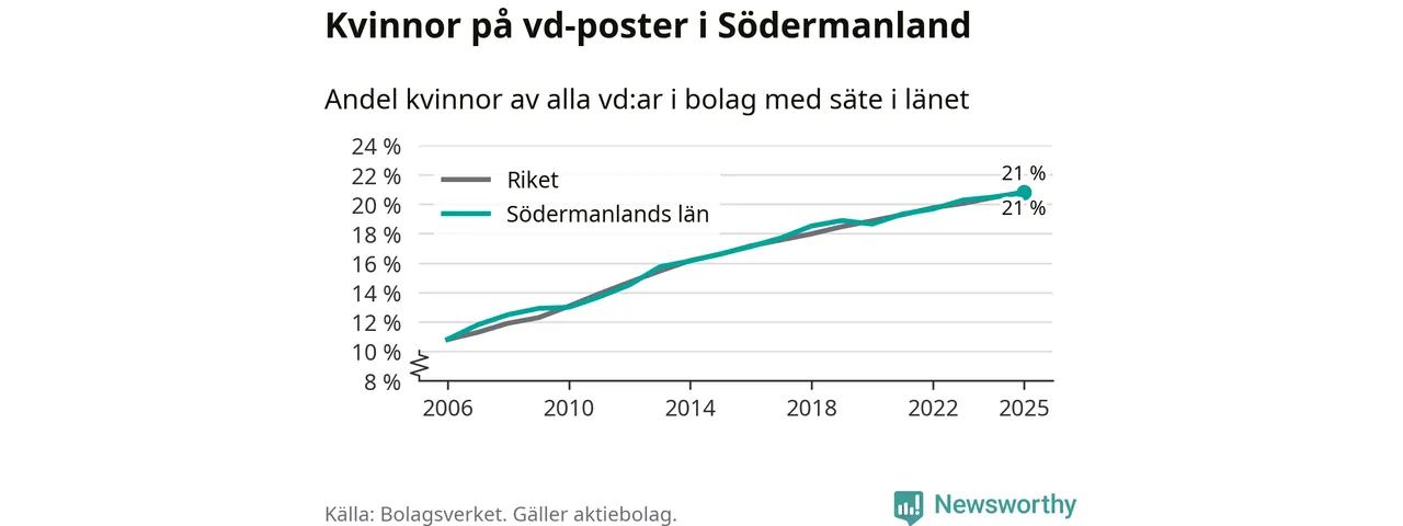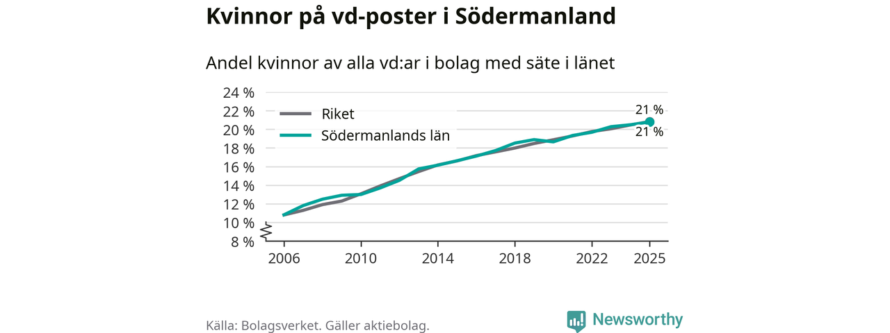 Delar man upp vd:arna i Södermanland efter ålder är andelen kvinnor högre bland dem under 50 år. Där är 22 procent kvinnor, jämfört med 20 procent i den äldre gruppen. I riket som helhet är 22 procent av vd:arna som är under 50 år kvinnor, medan motsvarande siffra för direktörerna som är äldre är 20 procent.